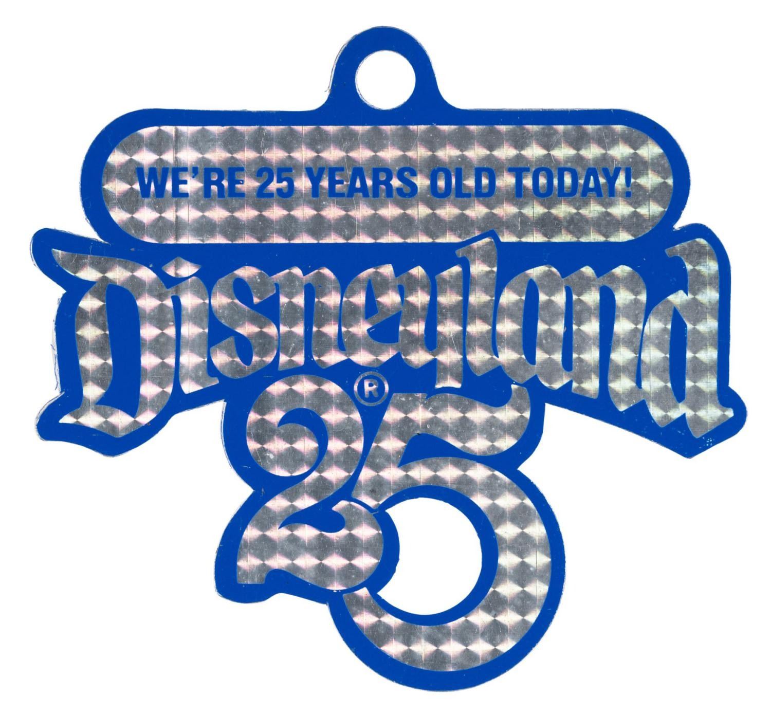 (Disneyland, 1980) A reflective “We’re 25 years old today!” tag from the Park’s 25th anniversary celebration. Measuring 2.75” x 3”, the tag is in fine condition.