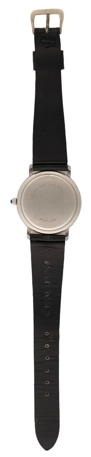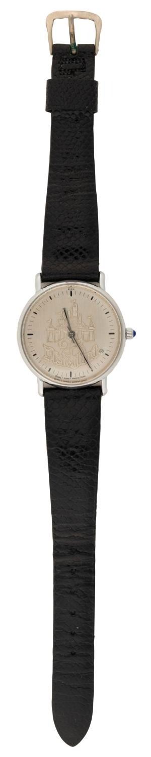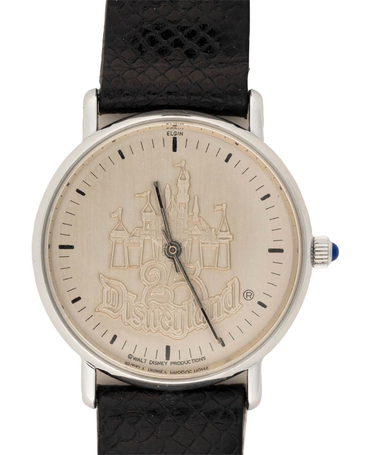 (Elgin, 1980) A genuine leather and quartz wristwatch commemorating Disneyland's 25th anniversary. Inside is a note that reads, "Dear Cheryl - We hope you will love this - only 300 were made. Love Jerry, Fulton + Trish too!" Measuring 9" long with a 1.25" clock face diameter, the watch is in very good condition with light surface wear and light creases from use. The 2.75" x 10" case is in good condition with scratches and wear from use.