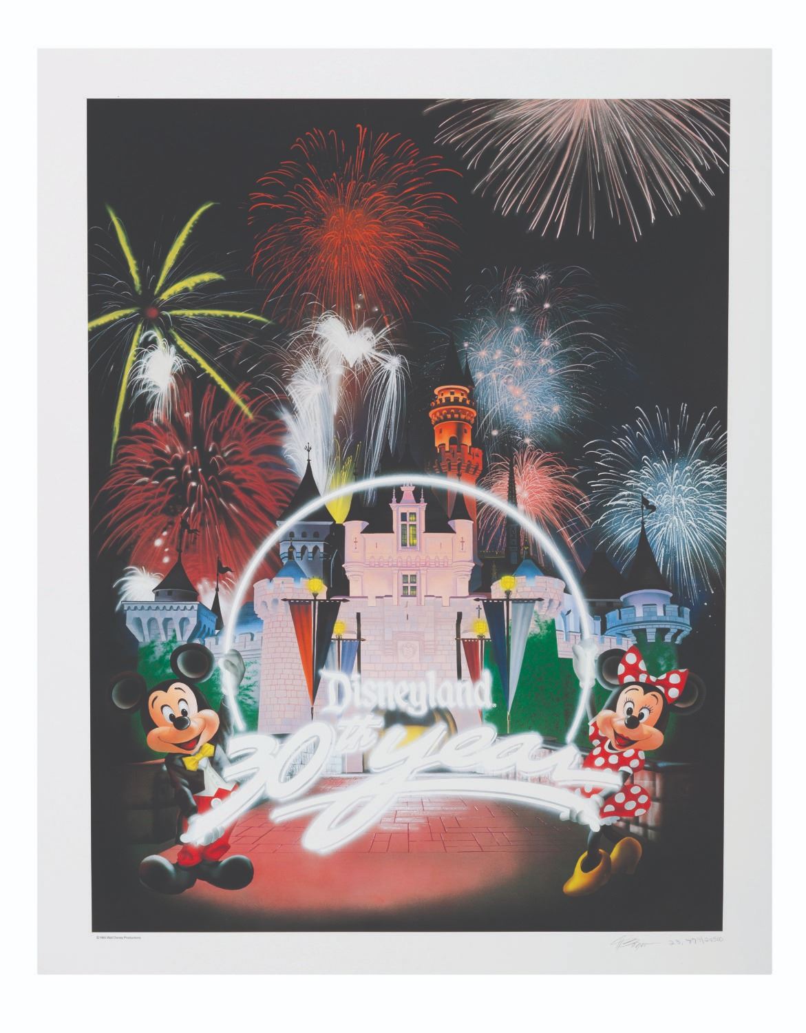 (Disneyland, 1985) A hand-signed Charles Boyer lithograph commemorating Disneyland's 30th anniversary. Numbered 23,779 of 24,500, the poster measures 23" x 29" and is in very good condition with light edge wear.