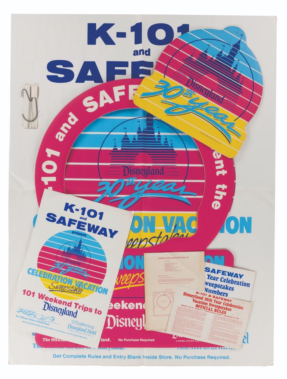 (Disneyland, 1985) A Disneyland 30th Anniversary PSA Airlines Mobile presented by K-101 & Safeway. The Celebration Vacation Sweepstakes set includes one sweepstakes mobile, one Deposit Drawing Tickets Here mobile sign, one official sweepstakes rules card, one hook with string and barbettes, a mobile assembly instruction sheet, one small sweepstakes poster, one giant sweepstakes poster, and one winning numbers card. Ranging in size from the 7” x 11” card to the giant 37.75” x 49.5” poster, the set is in very good condition with light scratches, creases, corner folds, scuffs, and wear.