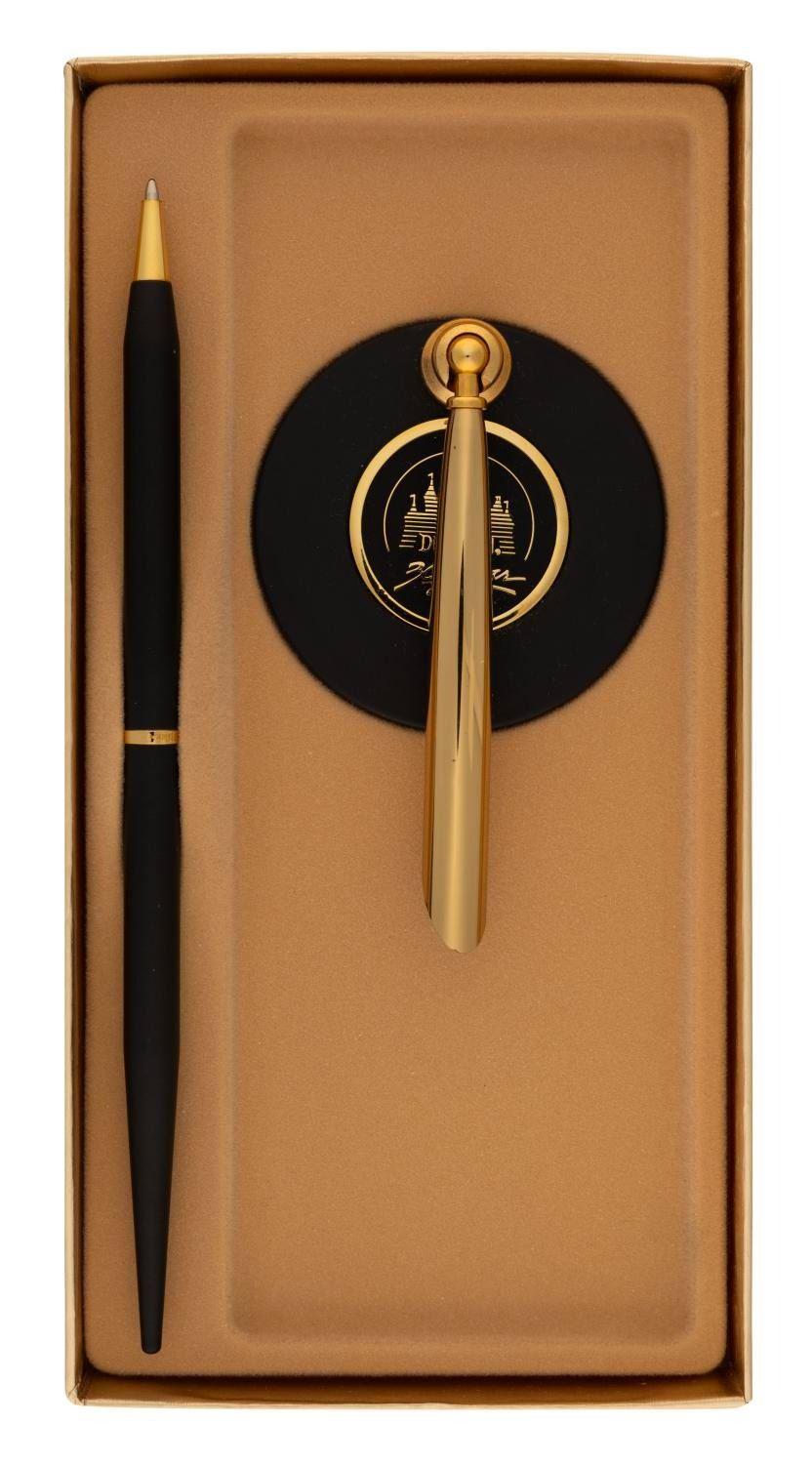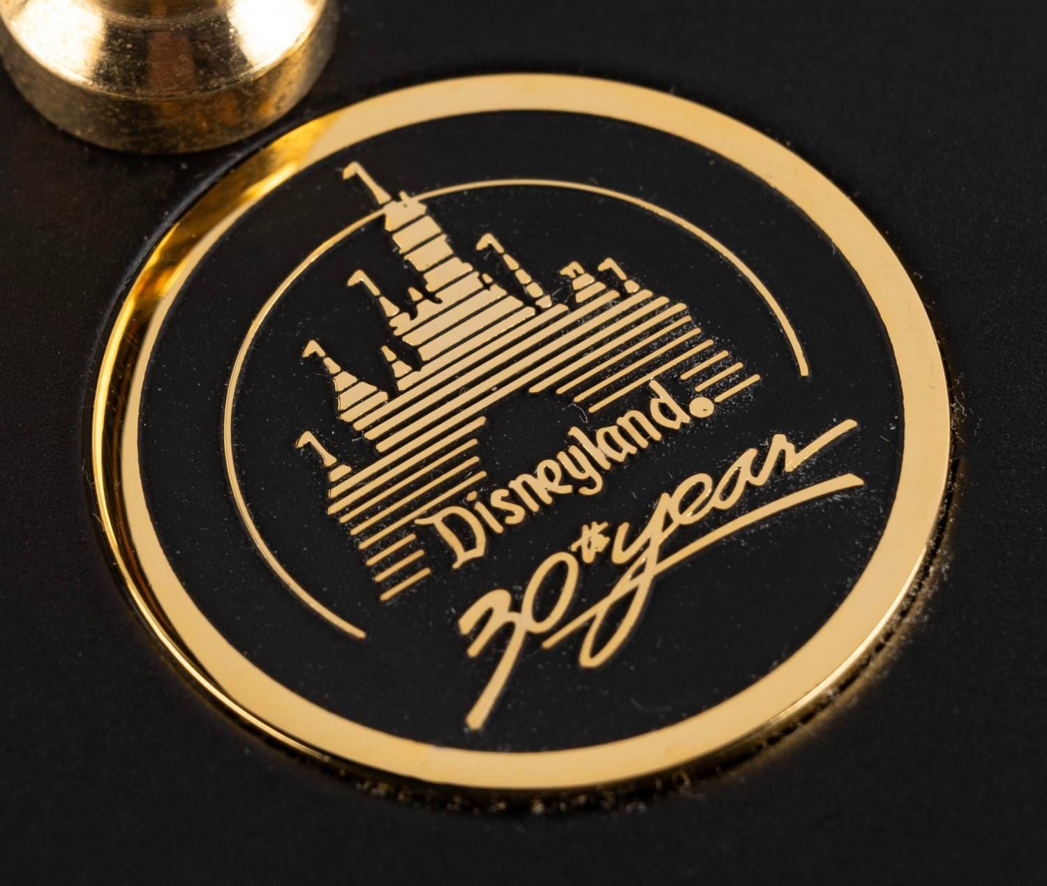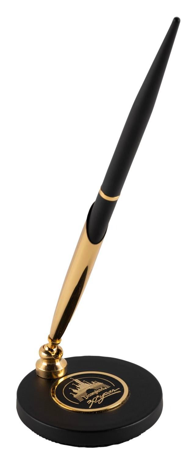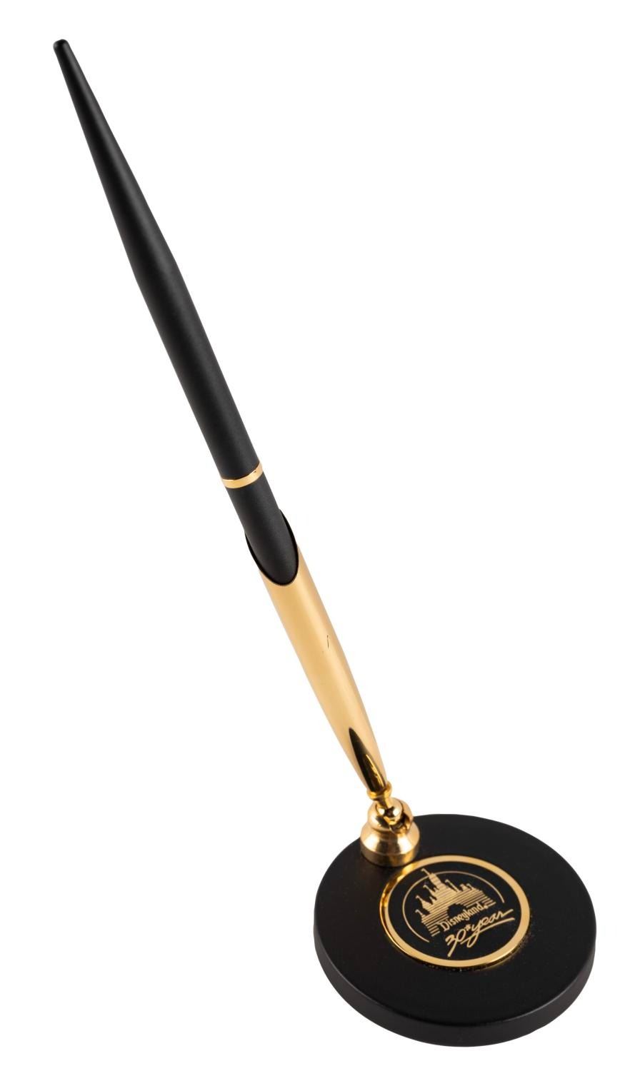 (Quill, 1985) A pen with a stand commemorating the 30th Anniversary of Disneyland. Measuring 6" in length, with a 2" diameter and 3" tall base, the pen is in very good condition with light scratches to the base. The pen ink needs to be replaced.