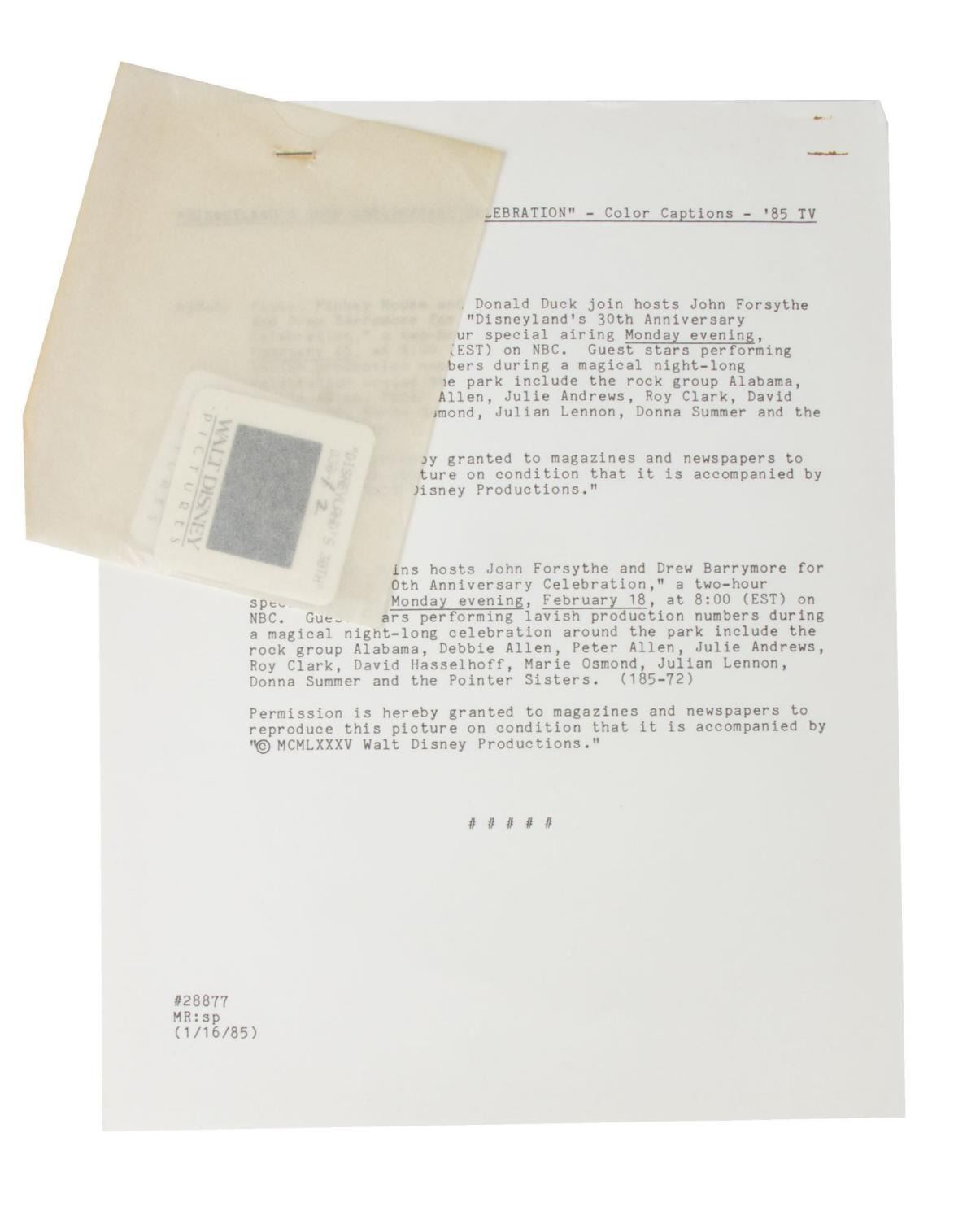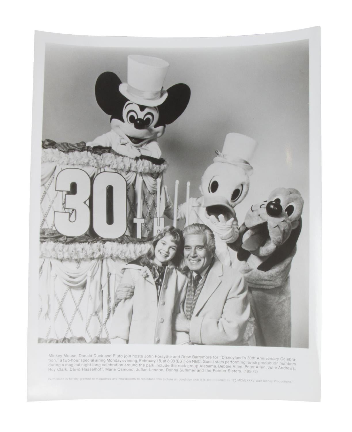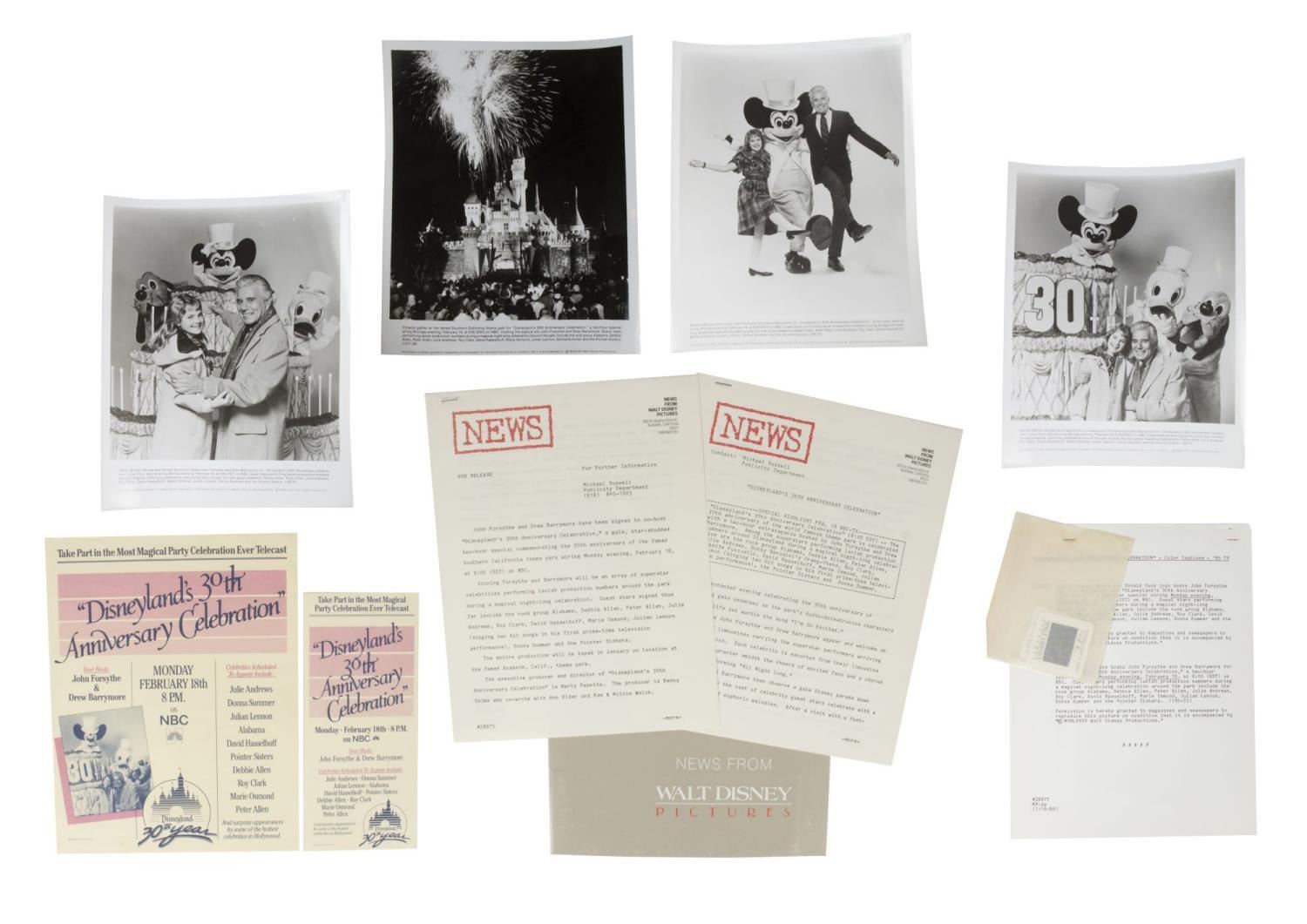 (Disneyland, 1985) A very rare Disneyland 30th anniversary press kit. "Disneyland's 30th Anniversary Celebration" was a 2-hour televised extravaganza hosted by John Forsythe and Drew Barrymore, which aired on February 18th, 198,5 on NBC. Included in the packet are four black and white publicity photos, two press releases, two flyers, and color slides of Forsythe and Barrymore with an attached caption. Measuring 9" x 11.5", the press kit is in good condition with scuffs, scratches, creases, and wear.
