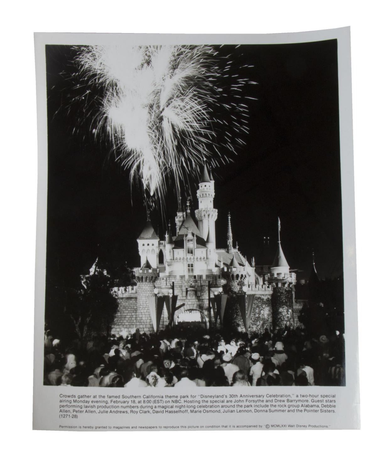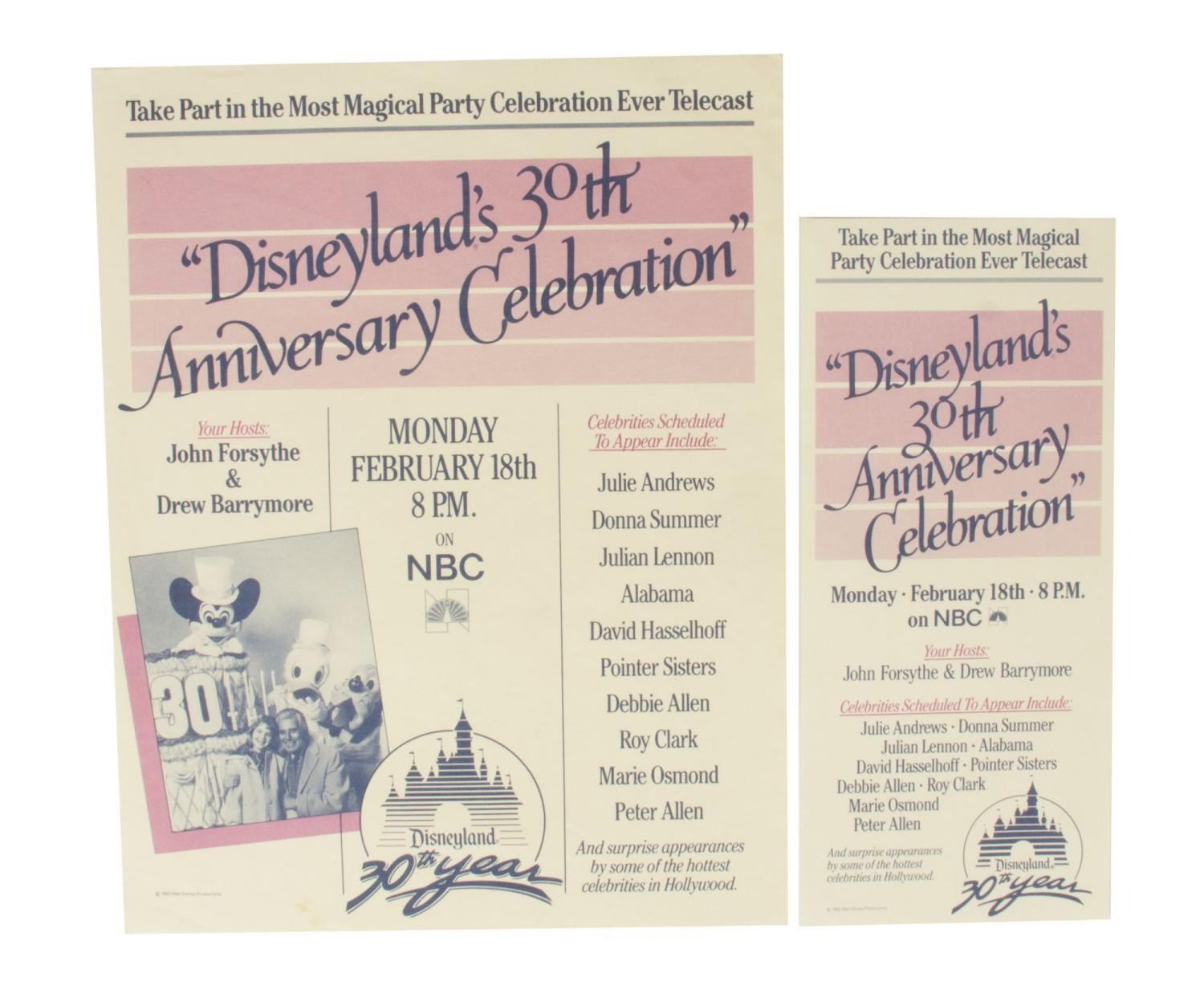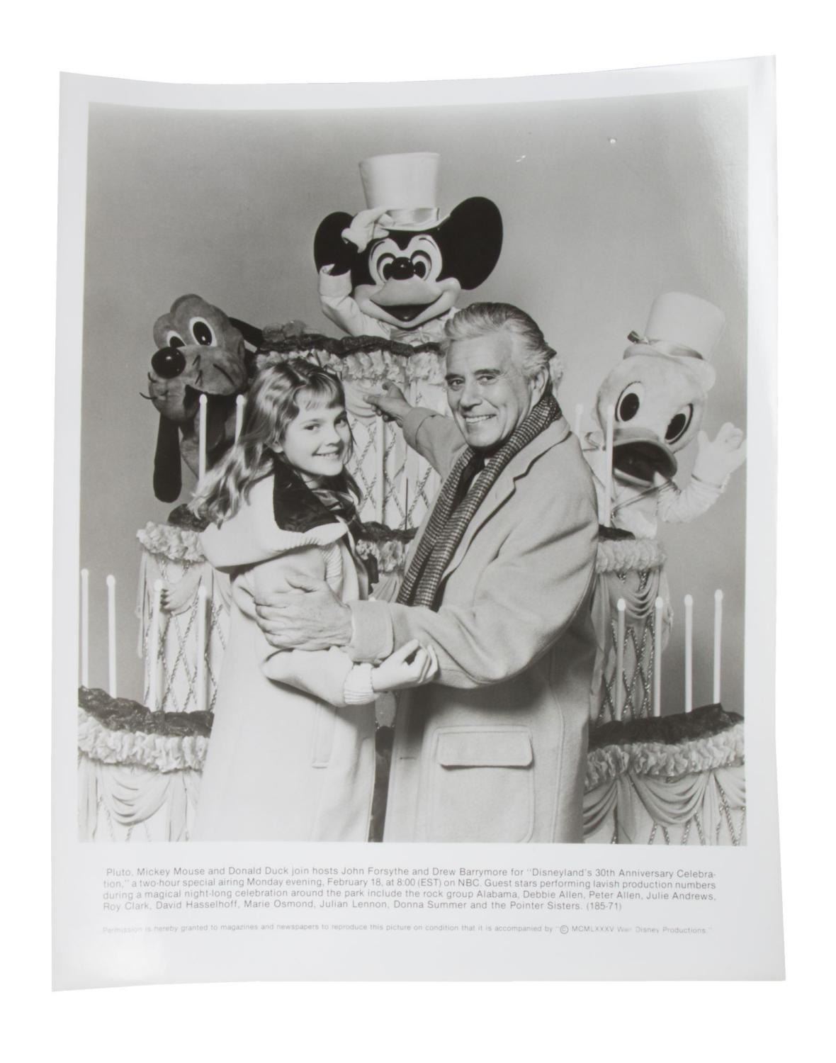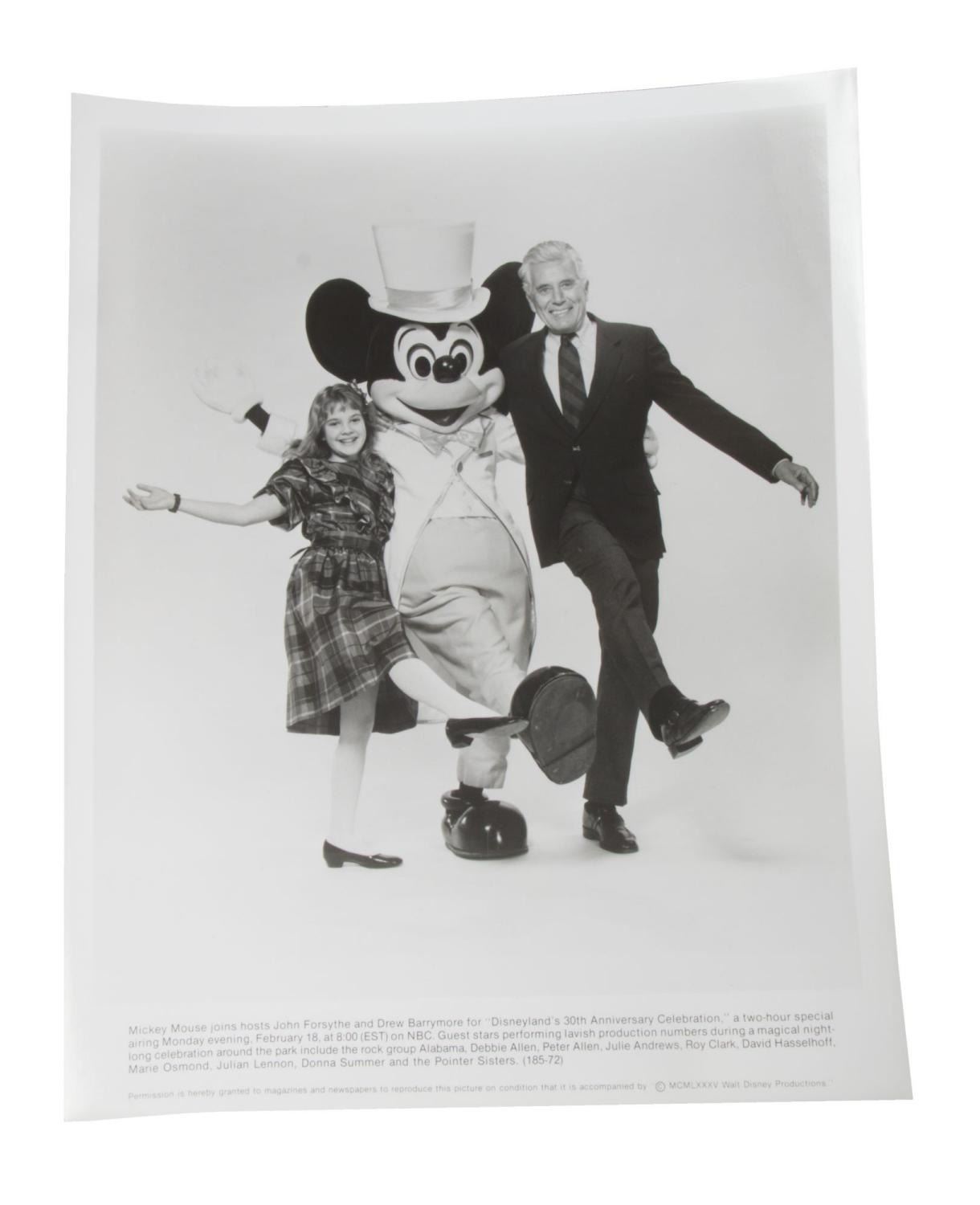 (Disneyland, 1985) A very rare Disneyland 30th anniversary press kit. "Disneyland's 30th Anniversary Celebration" was a 2-hour televised extravaganza hosted by John Forsythe and Drew Barrymore, which aired on February 18th, 198,5 on NBC. Included in the packet are four black and white publicity photos, two press releases, two flyers, and color slides of Forsythe and Barrymore with an attached caption. Measuring 9" x 11.5", the press kit is in good condition with scuffs, scratches, creases, and wear.