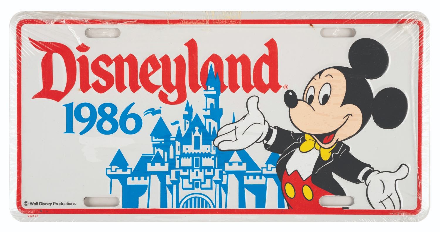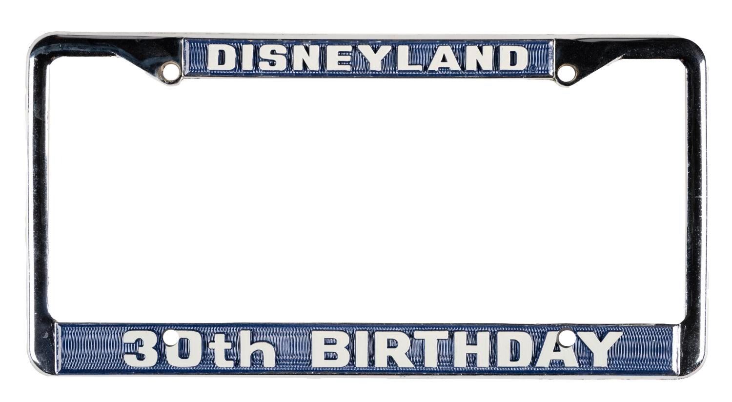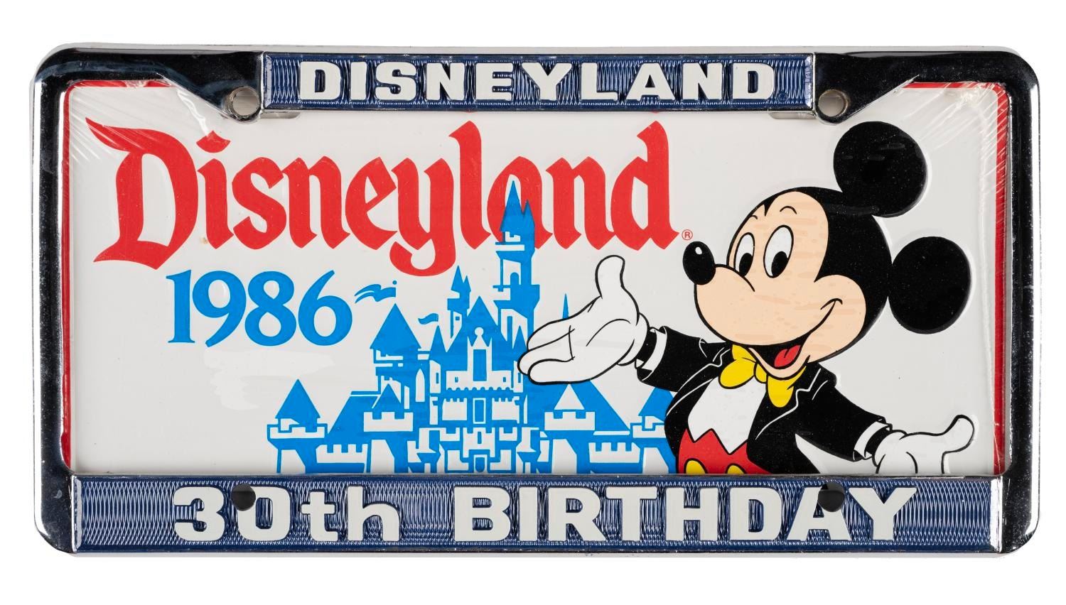 (Disneyland, 1986) A souvenir novelty license plate and frame set commemorating the 30th anniversary of Disneyland. Measuring 12.25" x 6.25", the metal plate and frame are in fine condition, sealed in their original plastic shrink wrapping.