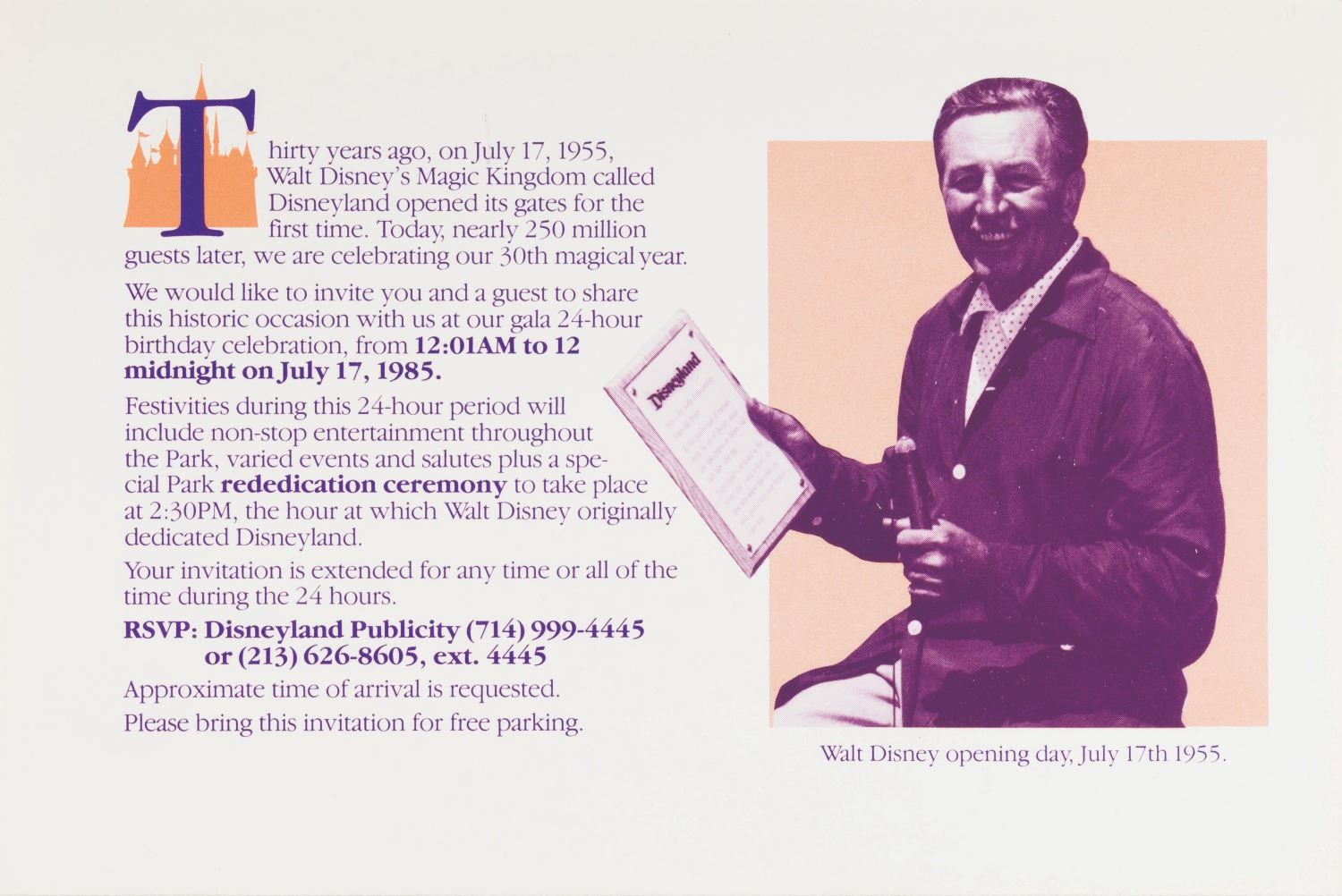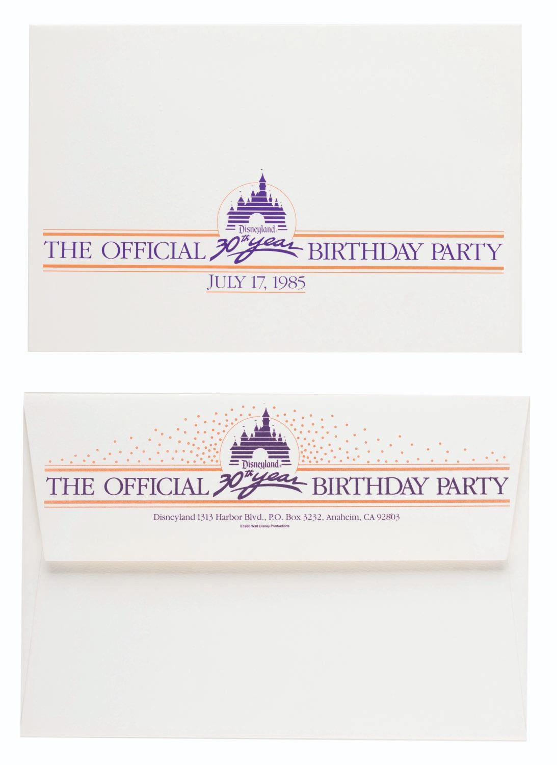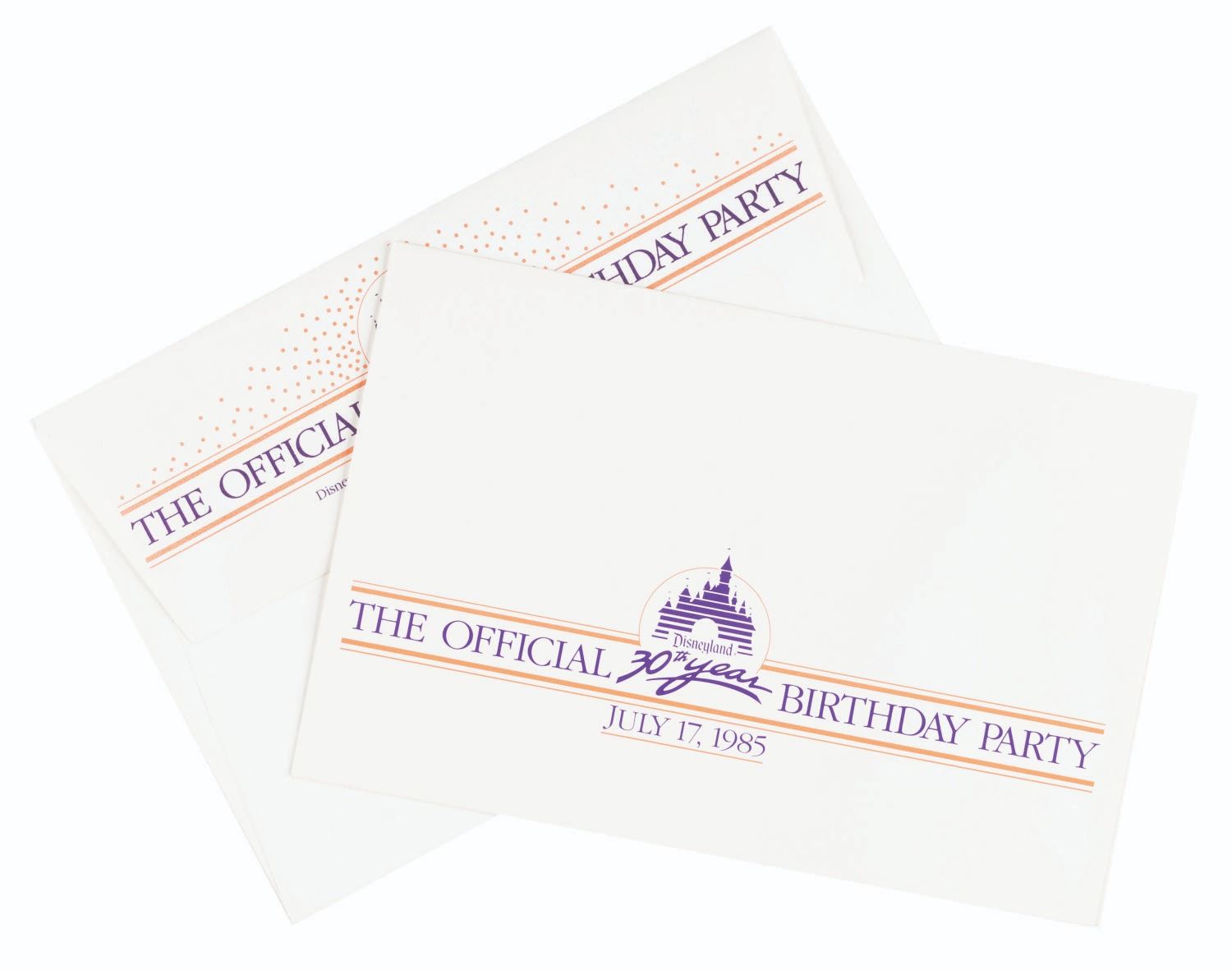 (Disneyland, 1985) An invitation to Disneyland’s 30th birthday party on July 17, 1985. Measuring 5.25" x 8" with its original 5.5" x 8.25" envelope, the invitation is in fine condition.