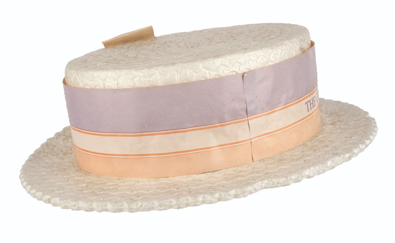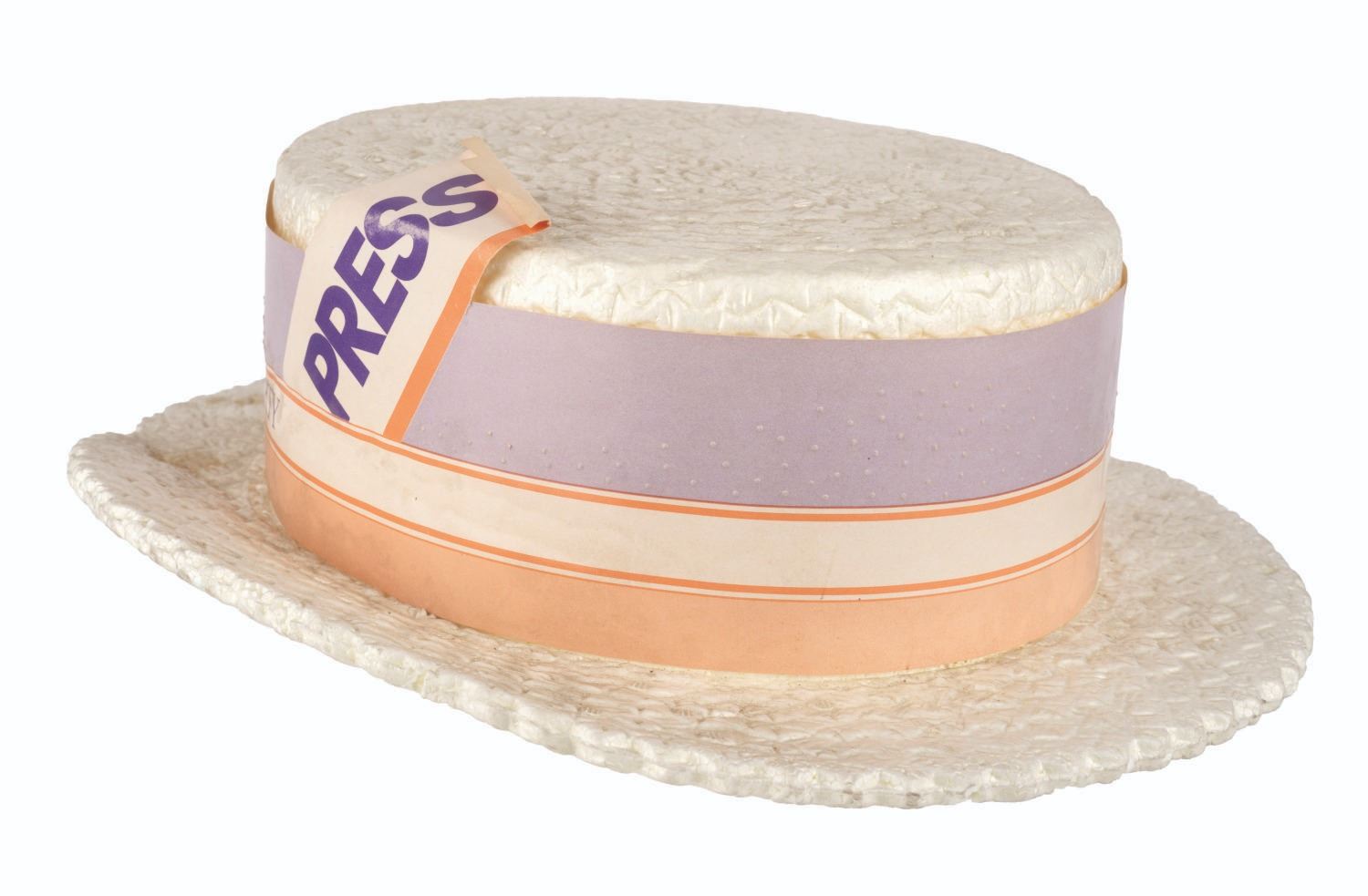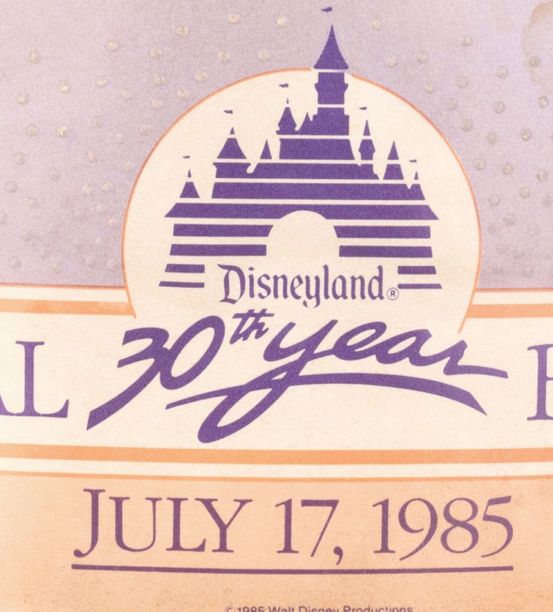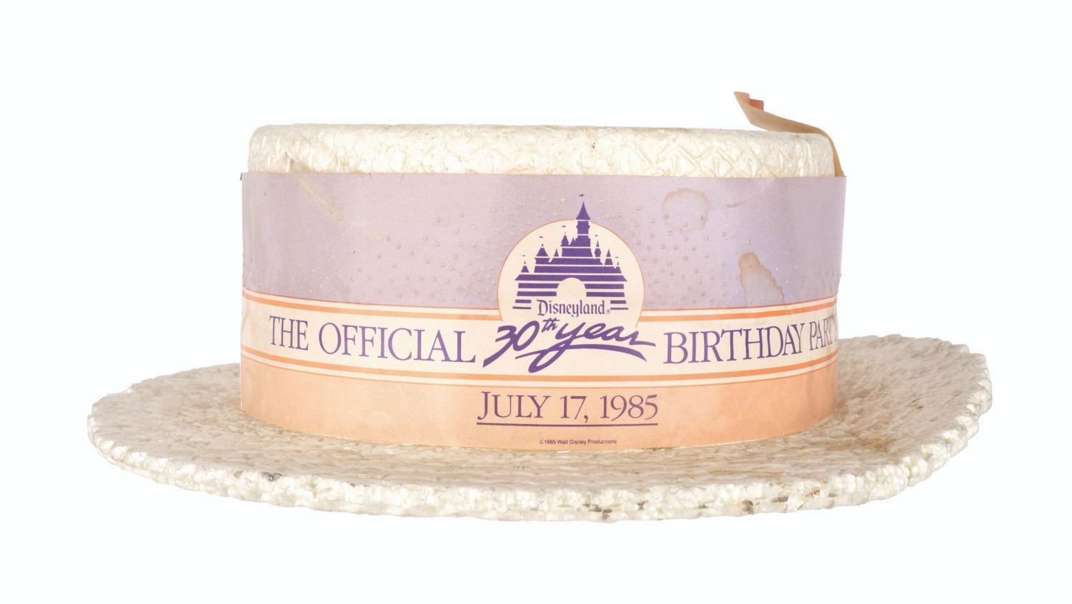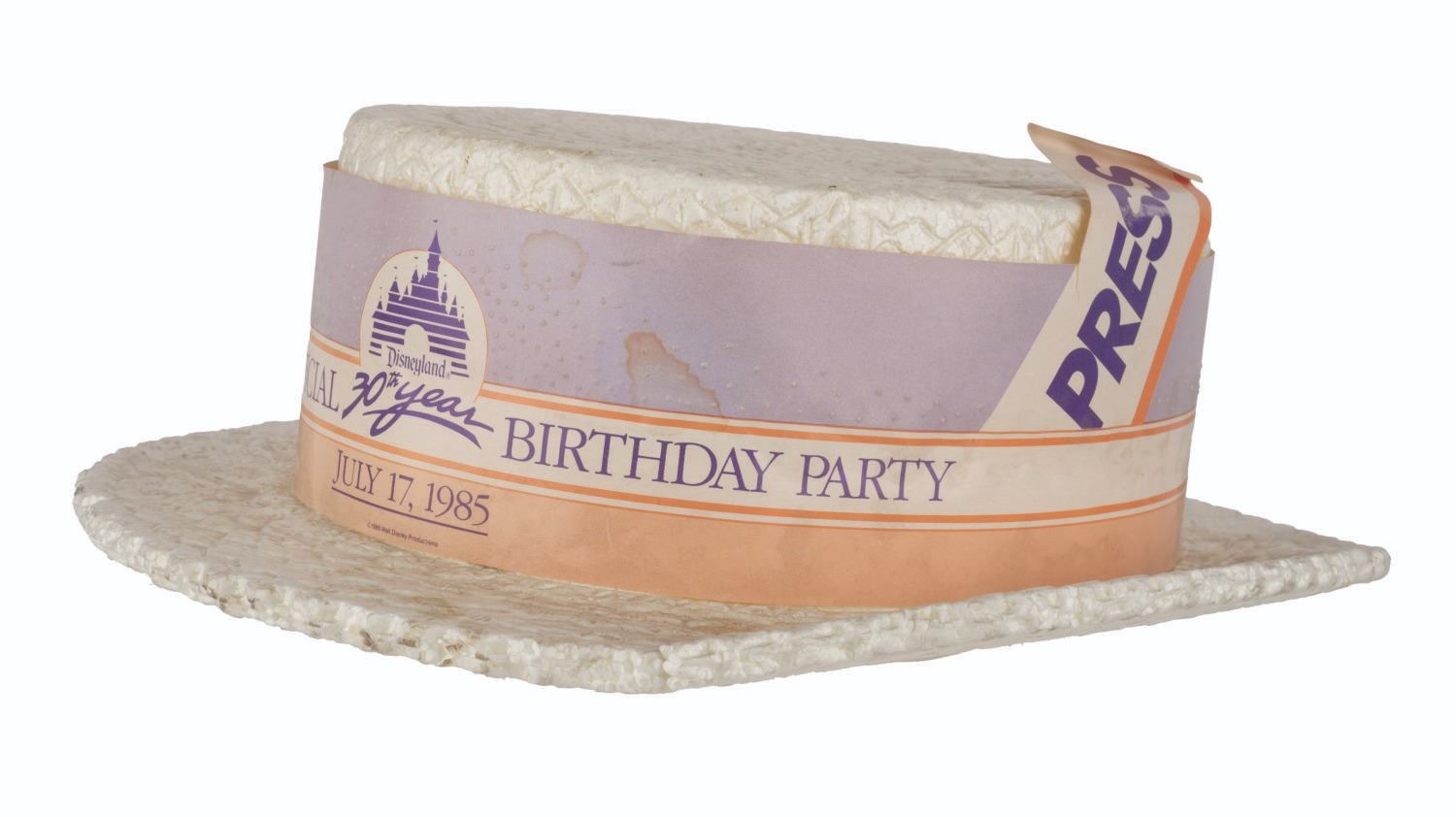 (Disneyland, 1985) A souvenir press hat for Disneyland's 30th birthday celebration on July 17, 1985. Measuring 11" x 13" x 3.5" high, the Styrofoam hat is in fair condition with a large crack down one side of the brim, a 1" chunk of the brim missing from the other side, and stains and discoloration throughout from use. The 4.5" press ribbon in the hat band is in fair condition with a fold, a tear, and color fading from use.