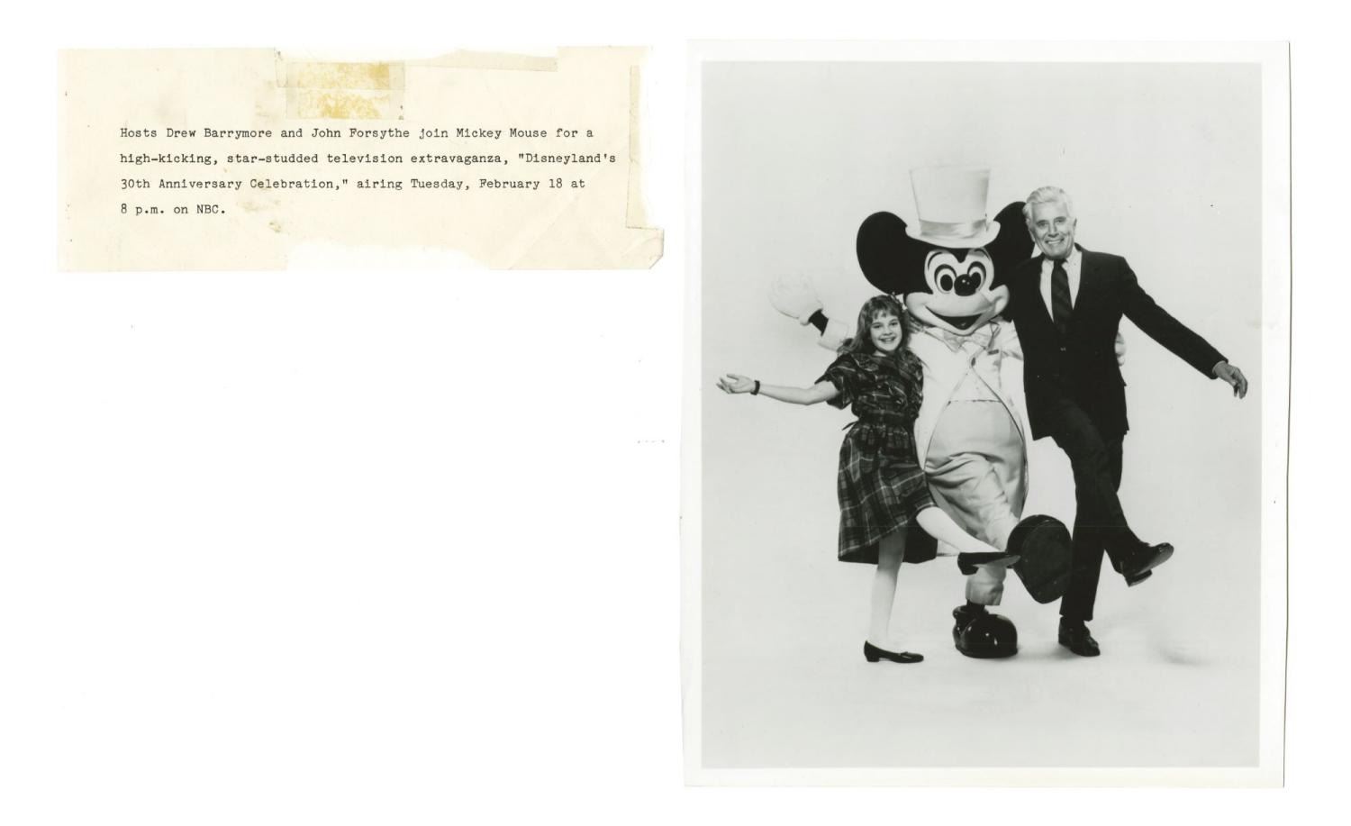 (Disneyland, 1985) A publicity photo of Mickey Mouse, John Forsythe, and a young Drew Barrymore for Disneyland's 30th anniversary events. Measuring 8" x 10", the photo displays in very good condition with scratches, light creases, and wear.