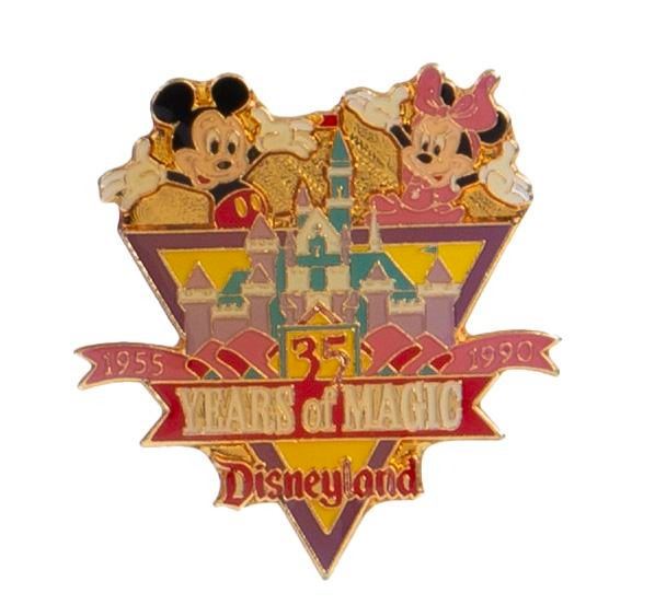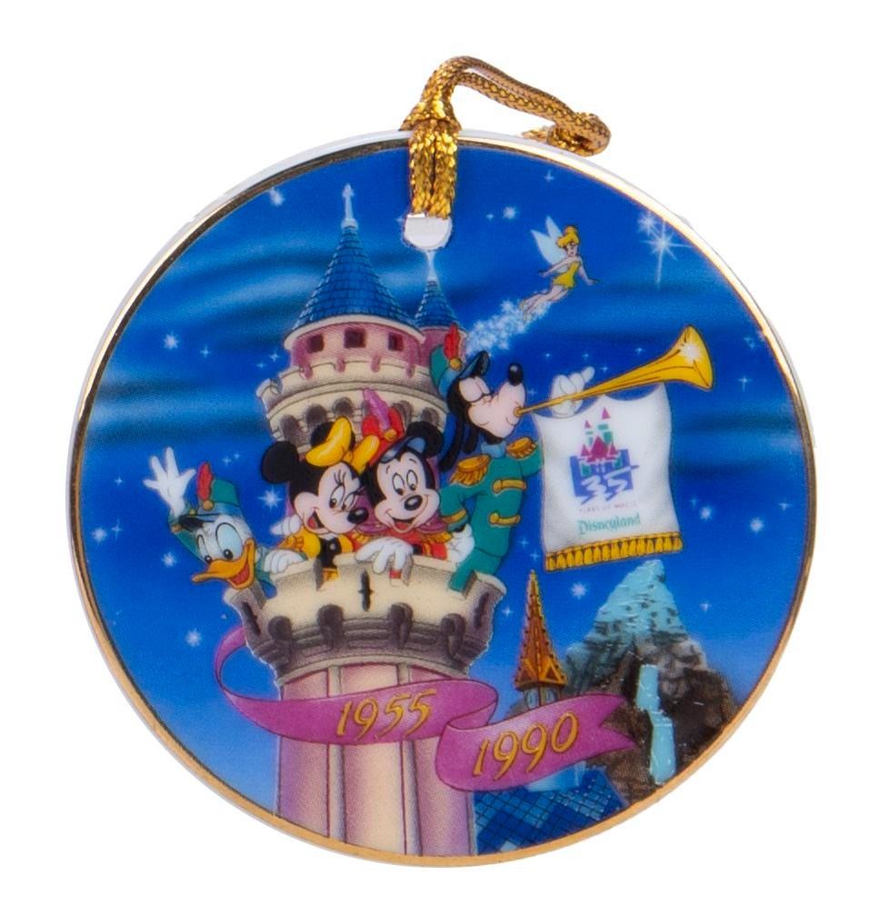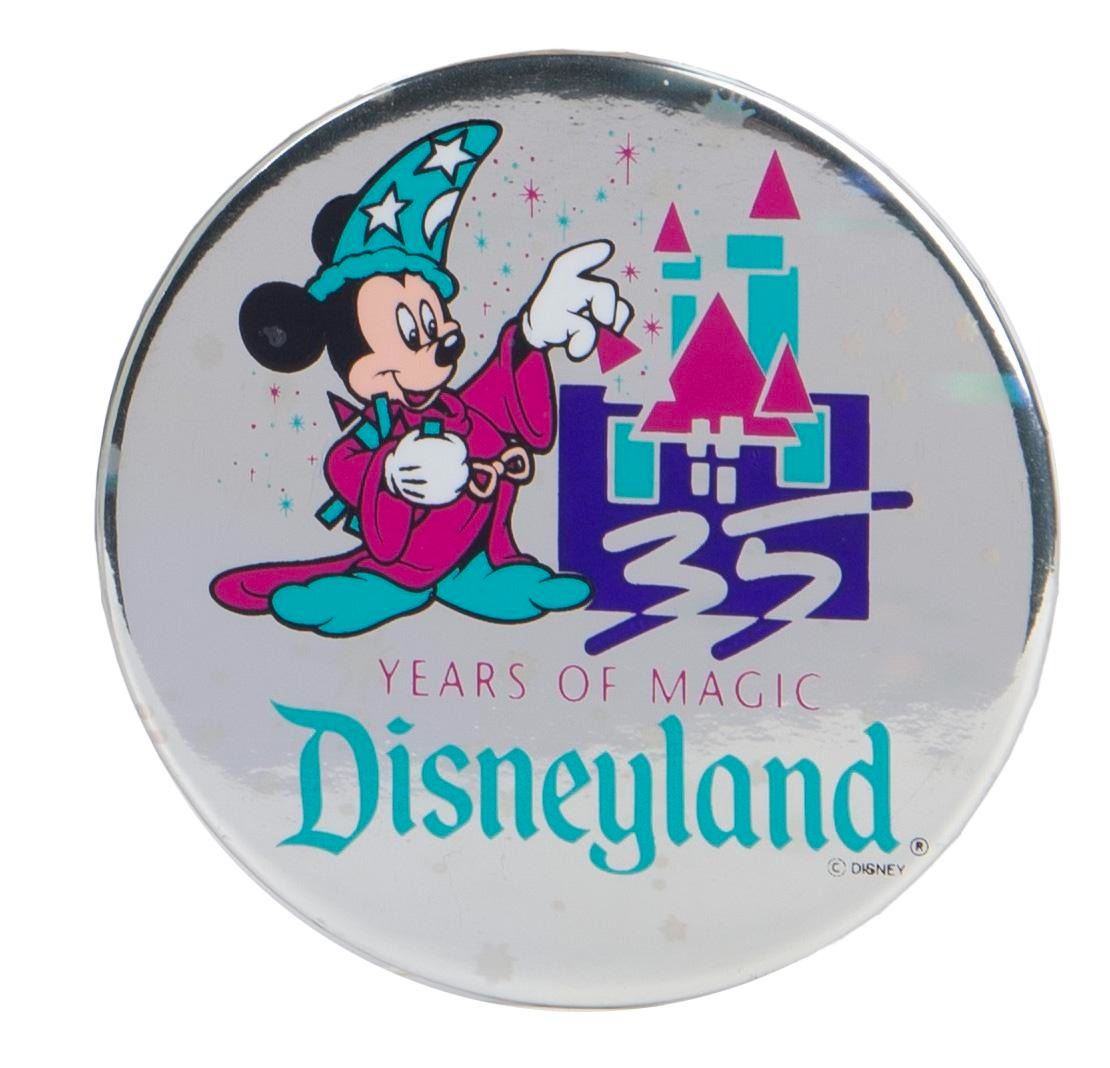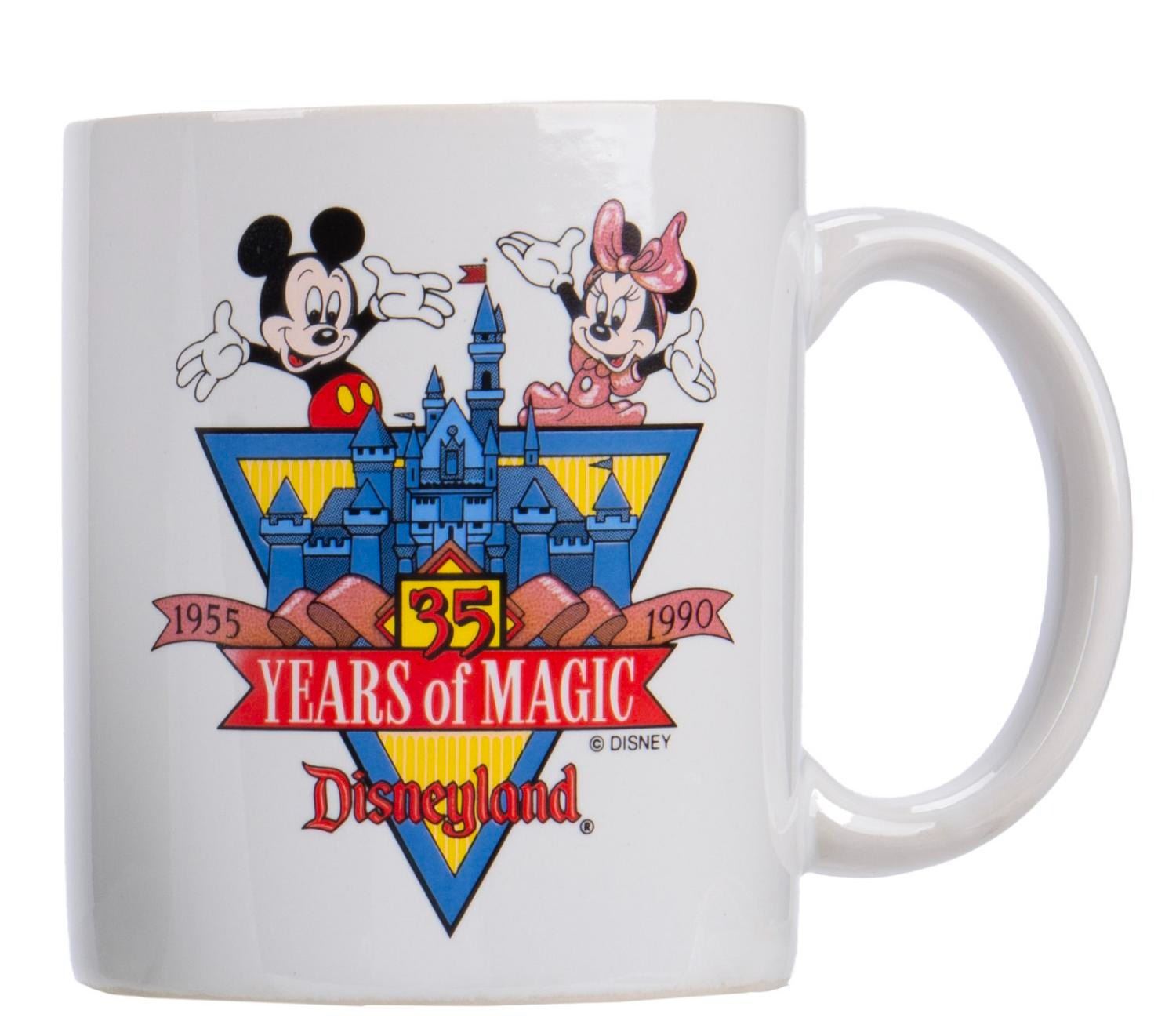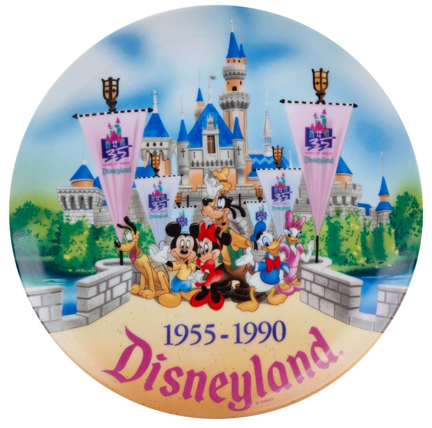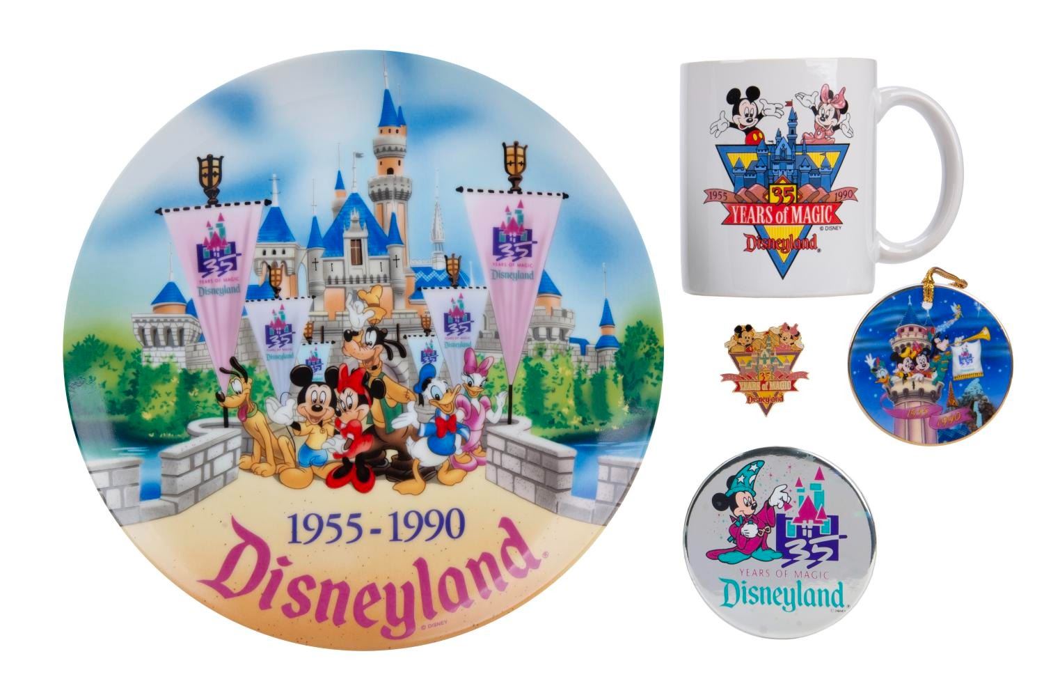 (Disneyland, 1990) A collection of five souvenirs of the "35 Years of Magic" celebration. Included are a button, an ornament, a mug, a pin, and a "The Gang's All Here" decorative plate. The plate measures 9.5" in diameter, the button is 3" in diameter, the ornament is 2.5" in diameter, the mug is 3.75" tall and 4.5" wide, and the pin is 1.5"x1.5". The pieces are in very good condition with minor wear and the pin is missing its pinback.