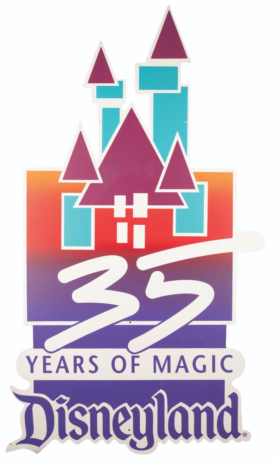 (Disneyland, 1990) A large 35 Years of Magic lamppost sign from the Park’s 35th anniversary celebration. Measuring 25” x 47”, the PVC board sign displays in very good condition with intentional holes for display and light scratches, scuffs, and wear from Park use.