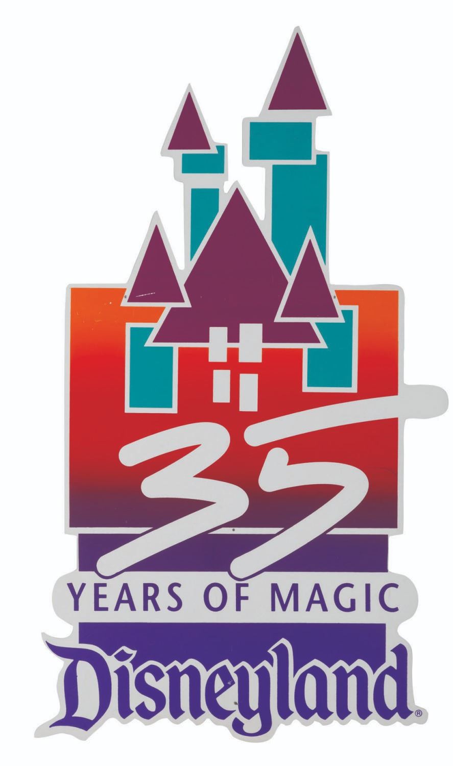 (Disneyland, 1990) A large 35 Years of Magic lamppost sign from Disneyland’s 35th anniversary celebration. Measuring 25" x 47", the sign is in good Park-used condition with some scratches, scuffs, and soiling. This item will require special shipping arrangements. Please inquire before bidding.
