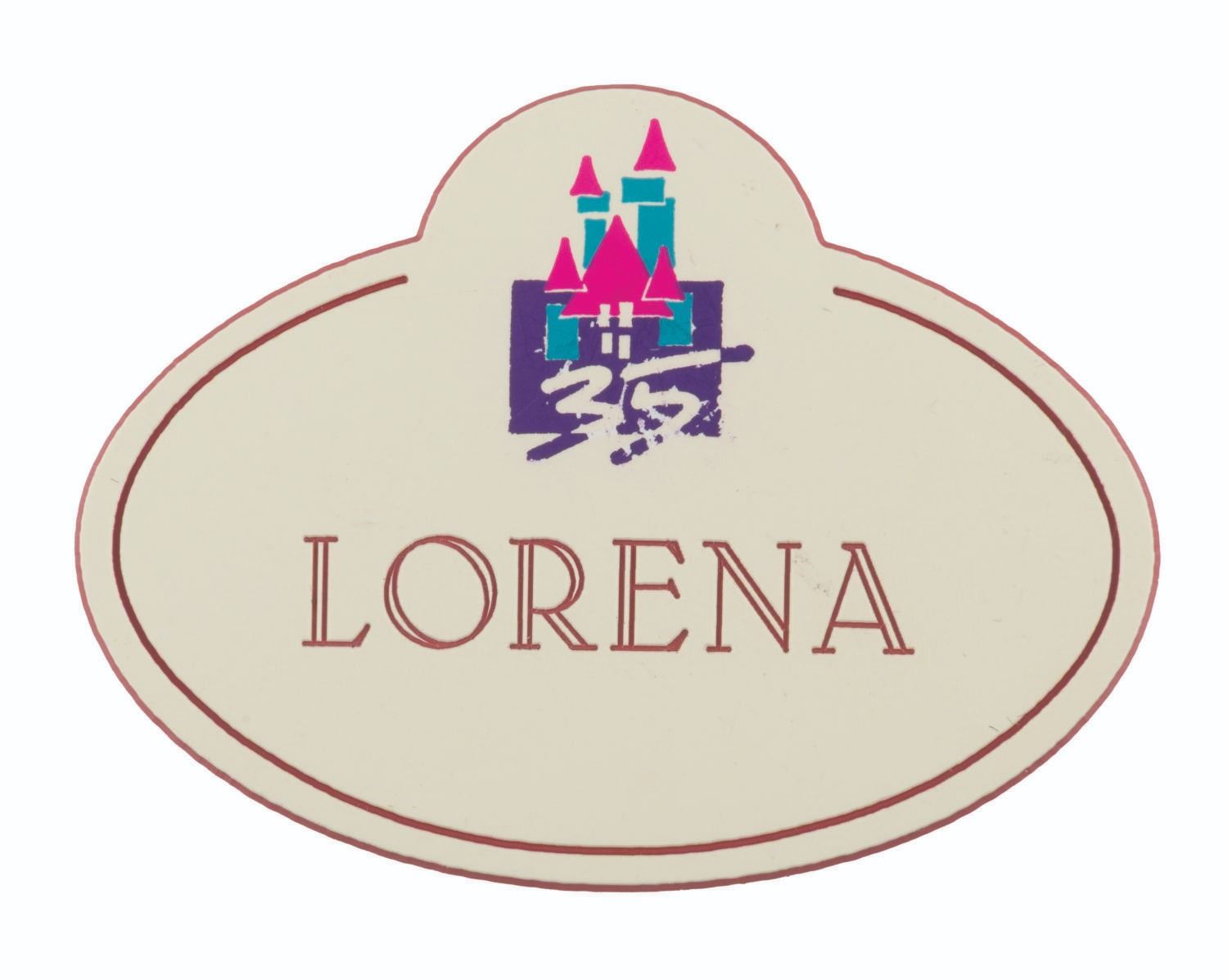 (Disneyland, 1990) A Disneyland “Lorena” Cast Member Name Badge from the Park’s 35th anniversary in 1990. Measuring 2” x 2.5”, the badge is in very good condition.