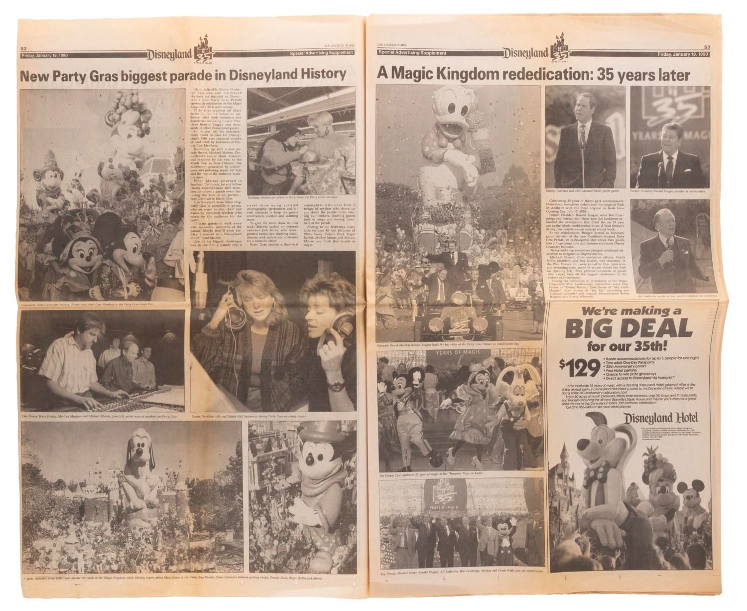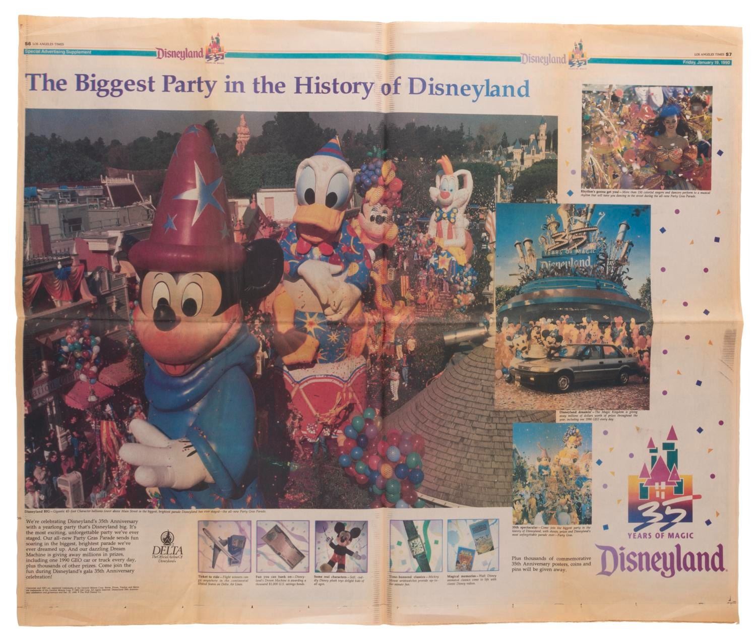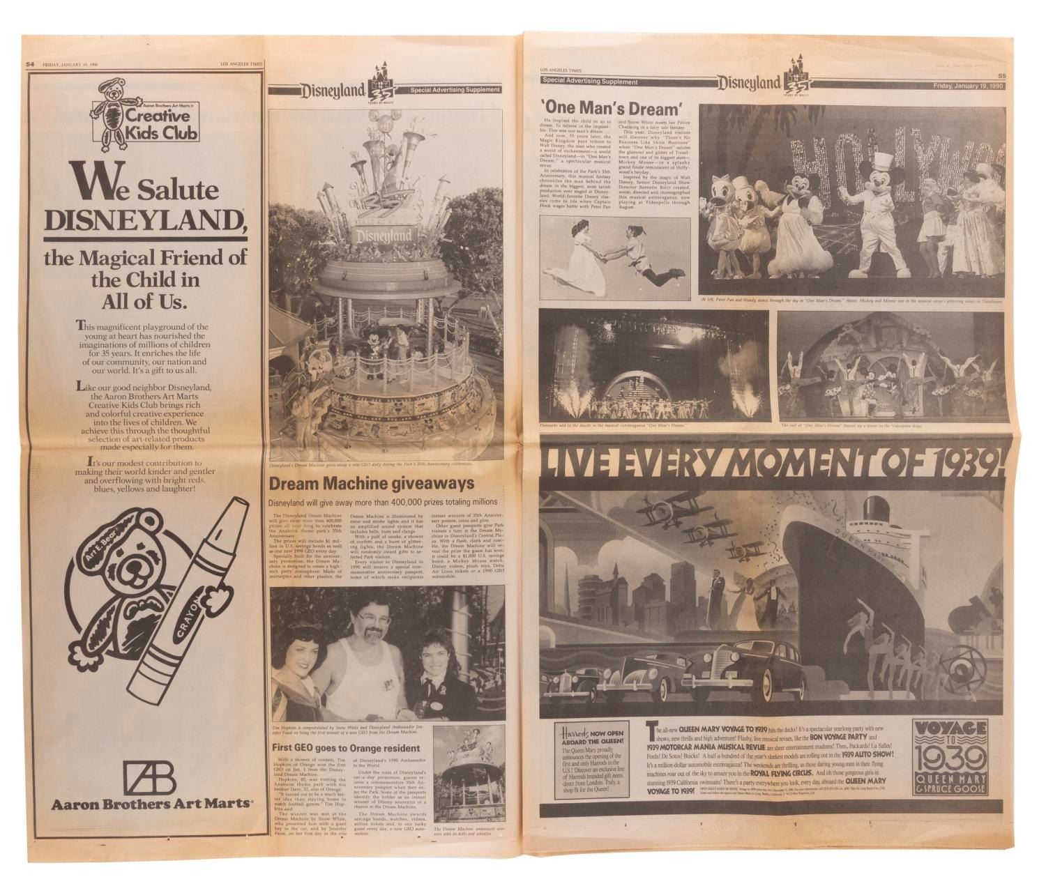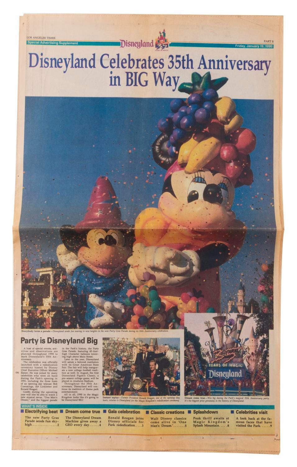 (LA Times, 1990) A 12 page supplement to the January 19, 1990, Los Angeles Times newspaper, celebrating Disneyland’s 35th anniversary year. Measuring 11.5" x 14.5" the paper is in good condition with light edge wear, a crease that runs down the center and discoloration from age.