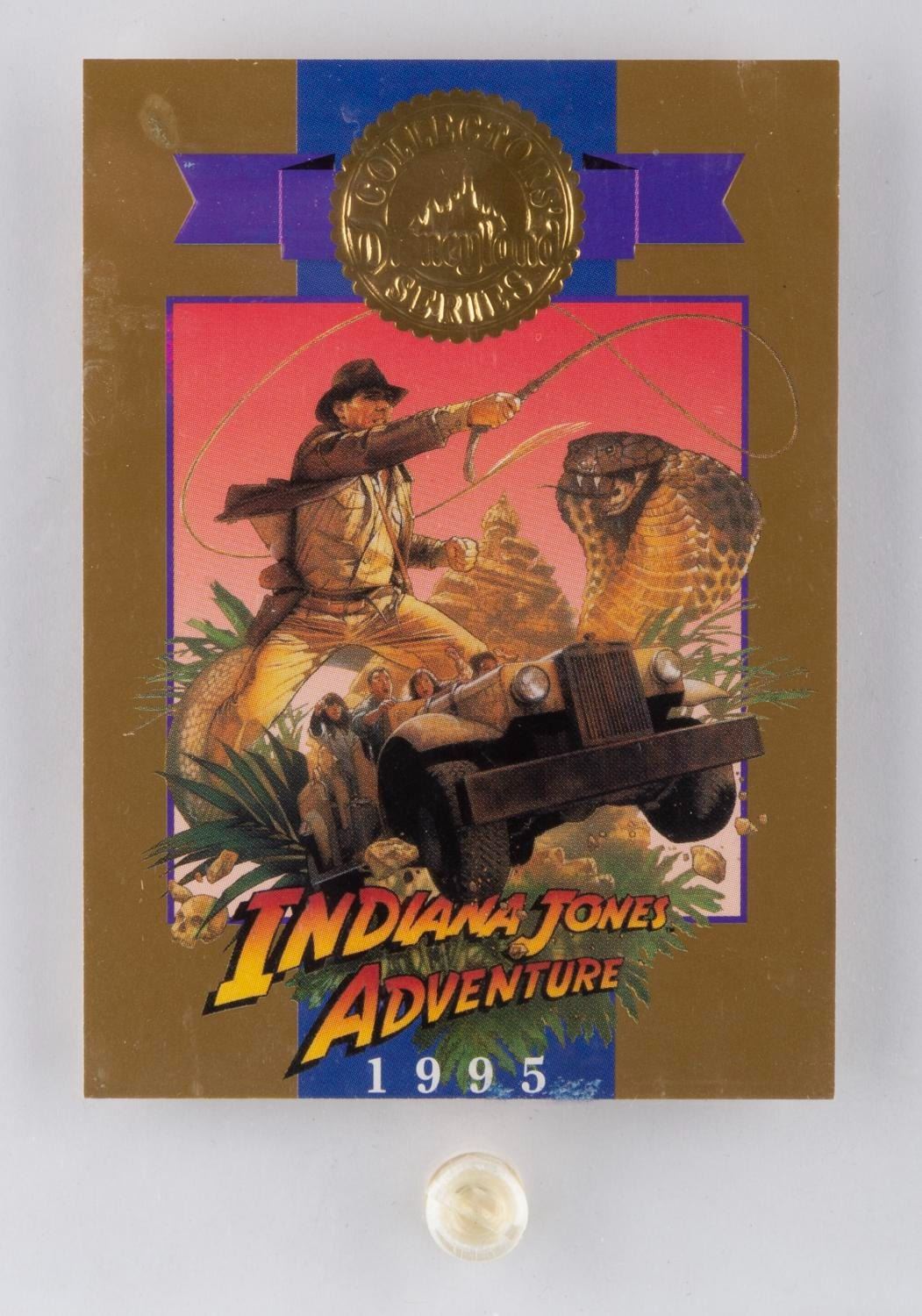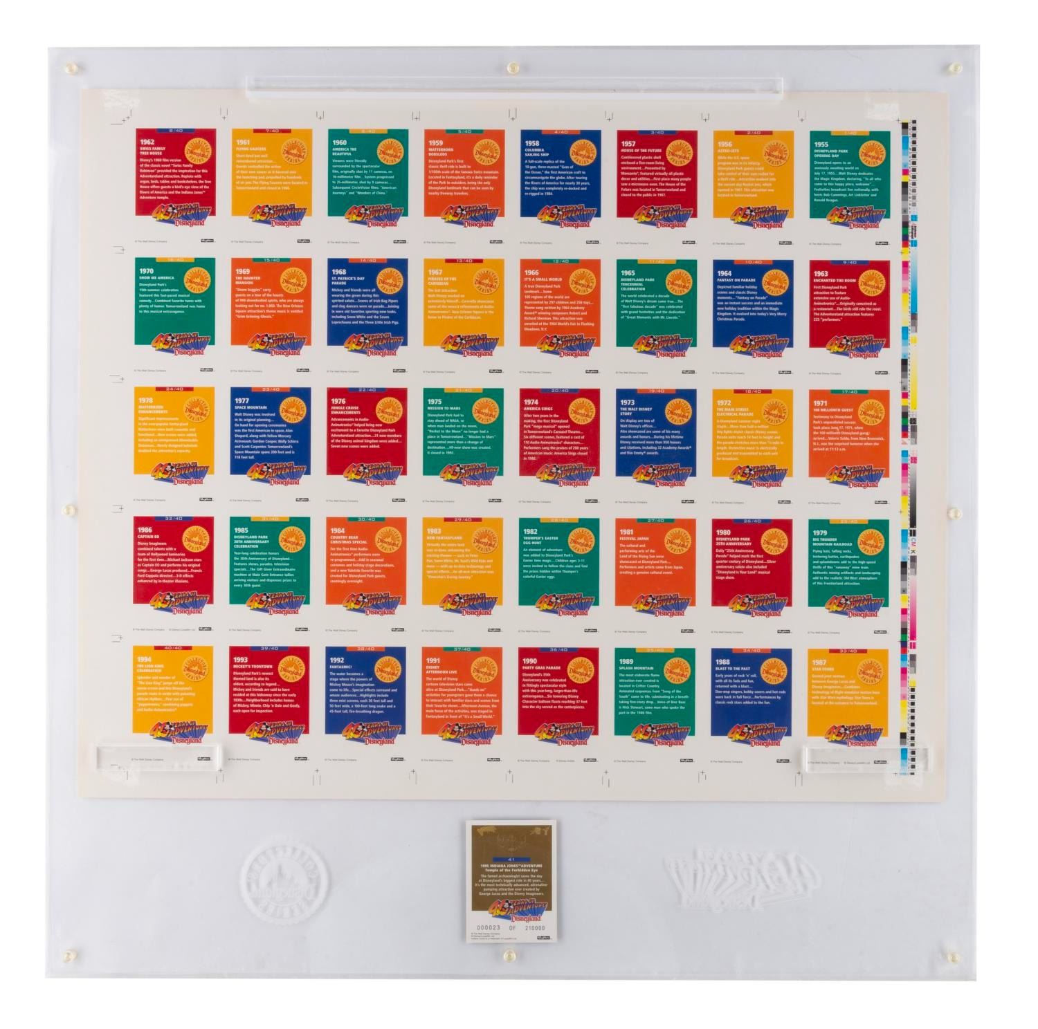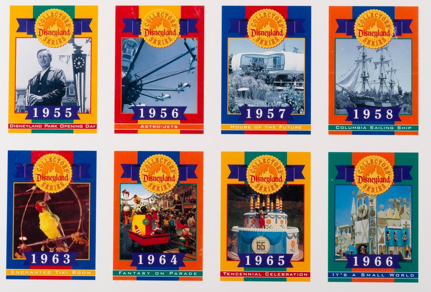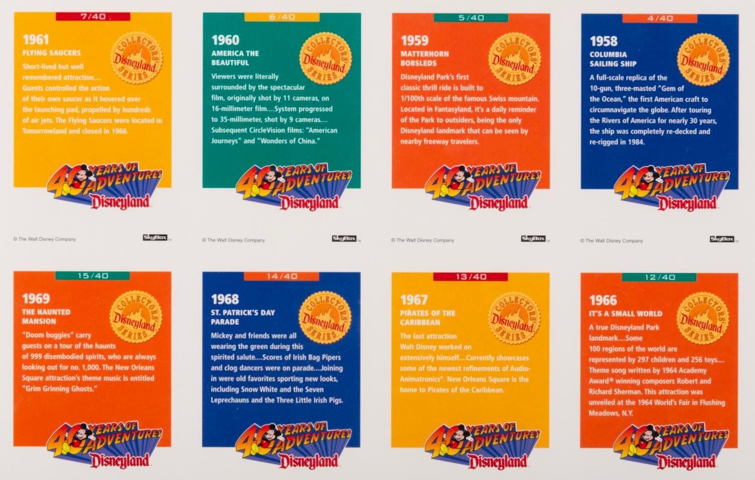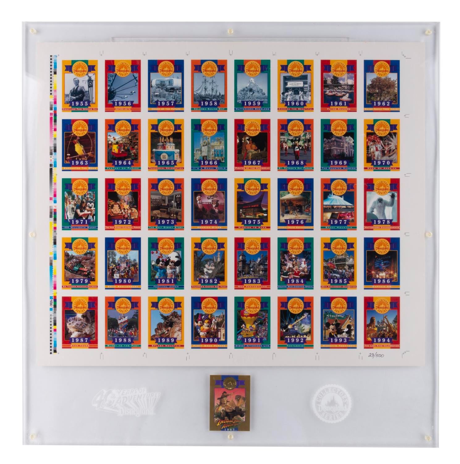 (Disneyland, 1995) An 40 Years of Adventures card set housed in a plexiglas display, numbered 23/500. The original 40 cards were available to purchase in a deck, while the 41st card, themed to Indiana Jones Adventure, was only available in the Park the day before the attraction opened. Measuring 20.25” x 24.25” in a 26.25” x 26.75” display, the uncut card set appears in fine condition, while the display is in good condition with heavy scratches, scuffs, and wear.