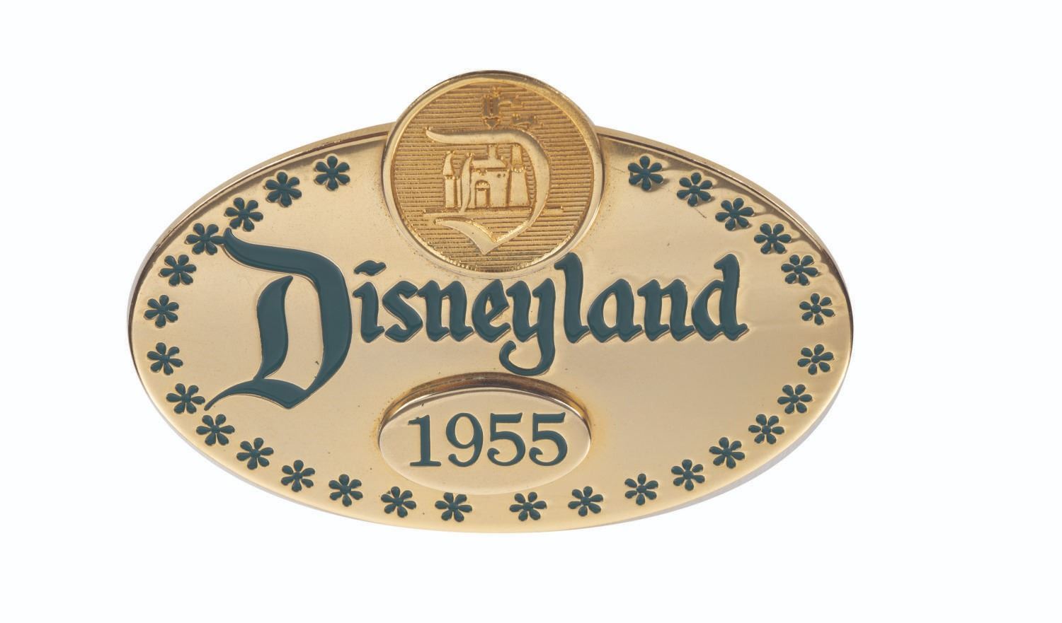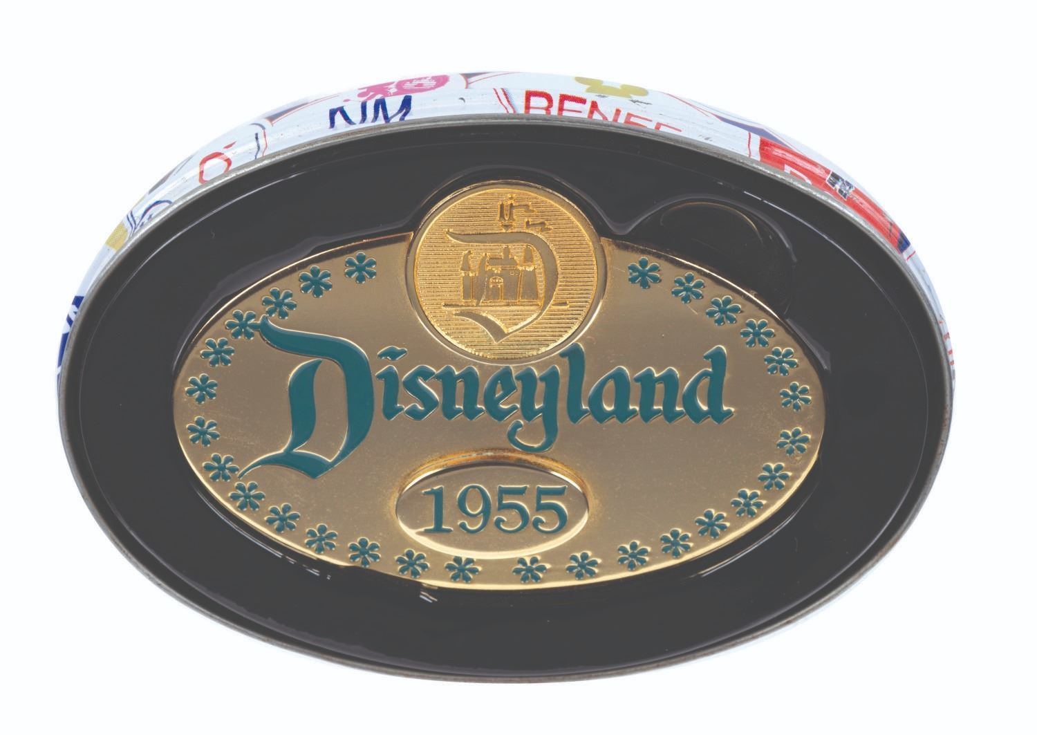 (Disneyland, 1995) A Disneyland 40th Anniversary Cast Member Badge Replica. The limited edition copper and brass badge is a replica of those worn by Disneyland Cast members during the first seven years of Park operation. This badge is in fine condition in the original decorative nametag motif tin box.