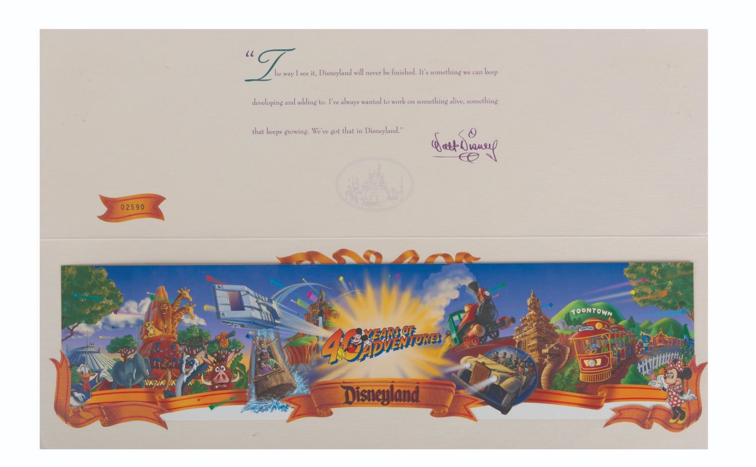 (Disneyland, 1995) A rare Disneyland 40th anniversary commemorative passport celebrating “40 Years of Adventures” and the debut of the Indiana Jones Adventure. Numbered 02590 and measuring 3.5” x 14” in the original 4.75” x 15” envelope, the ticket is in very good condition with light edge wear, and the envelope seal broken.
