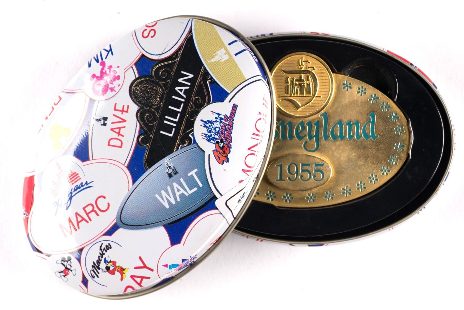 (Disneyland, 1995) A Disneyland 40th Anniversary Cast Member Badge Replica. The limited-edition copper and brass badge is a replica of those worn by Disneyland Cast members during the first seven years of Park operation. This 2.5" x 1.75" badge and the 3.75" x 2.75" x 1" tin are in very good condition with light handling wear.