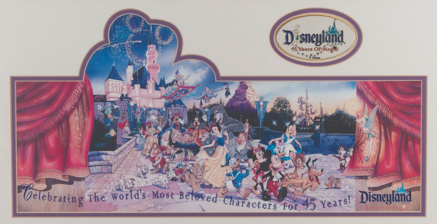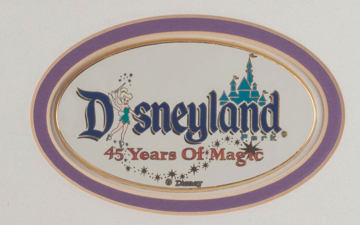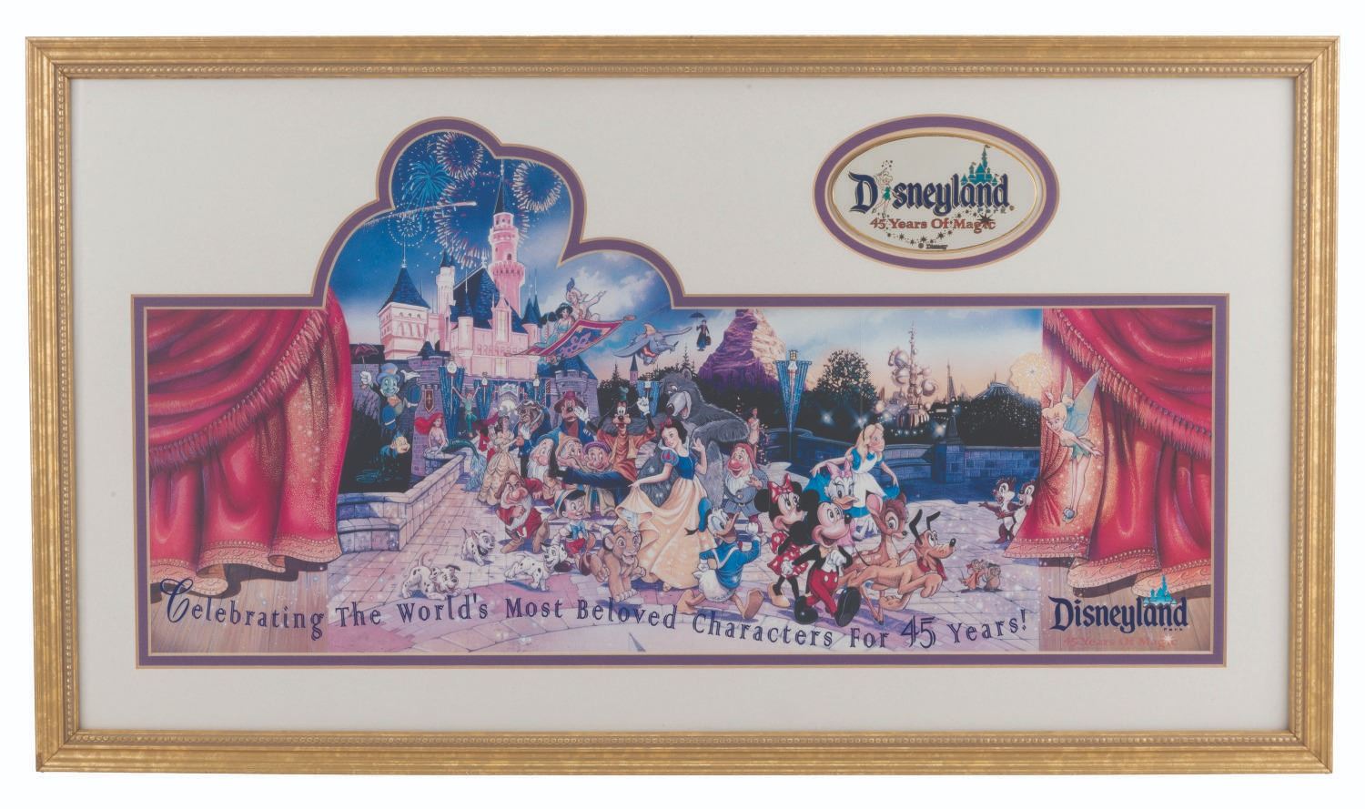 (Disneyland, 2000) A framed commemorative ticket and pin, celebrating Disneyland’s 45th anniversary. The pin measures 3.75" x 2.25" and the ticket shows 20.75" x 10.5" in the custom matte and 14.5" x 25.5" frame. The piece is in very good condition with some color fading from display.