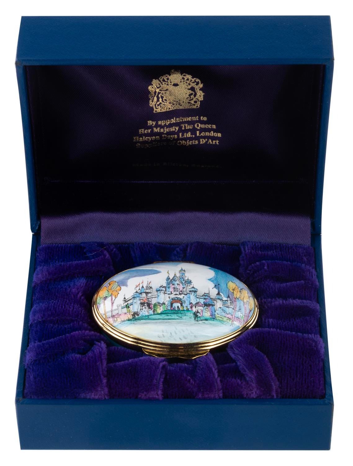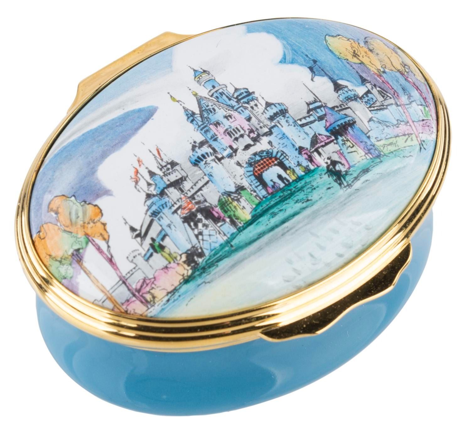 (Disneyland, 2000) A limited edition enamel trinket box created for Disneyland's 45th anniversary. Numbered 1630 out of 1955, the box features artwork of Sleeping Beauty Castle by Imagineer Herb Ryman, and the inside of the lid reads "45 Years of Magic.” Measuring 1.75" x 2.25" x 1" tall, the trinket box is in fine condition. It is presented in its original 4” x 3” x 1.75” velvet-lined box, also in fine condition.