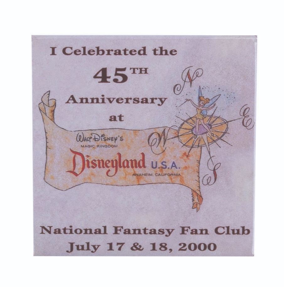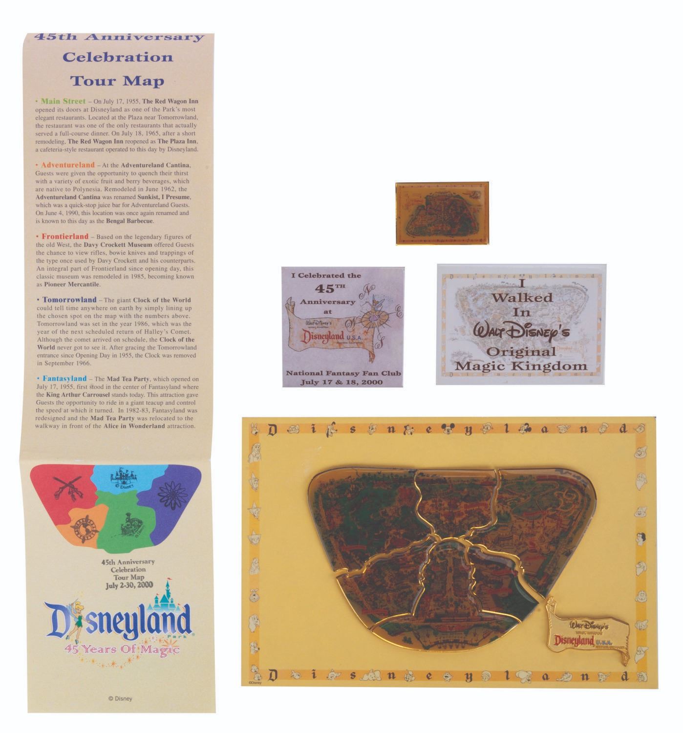 (Disneyland, 2000) A Disneyland "45th Anniversary Celebration Tour Map" set that was available in the Park for a very limited time. Included is a foldable map, a set of seven puzzle pins (with a map card back), and a miniature map pin, each inspired by the 1958 Disneyland map by Sam McKim. Also included are a pair of buttons reading "I Walked in Walt Disney's Magic Kingdom" and "National Family Fan Club." The pins range from 3"x2.75" to 1.75"x1.5", the buttons are 2.5"x3.5" and 2.5"x2.5", and the map is 4"x9.25". Each piece is in very good-to-fine condition with yellowing to the cloisonne of some pins, while the map retains its original folds and creases.