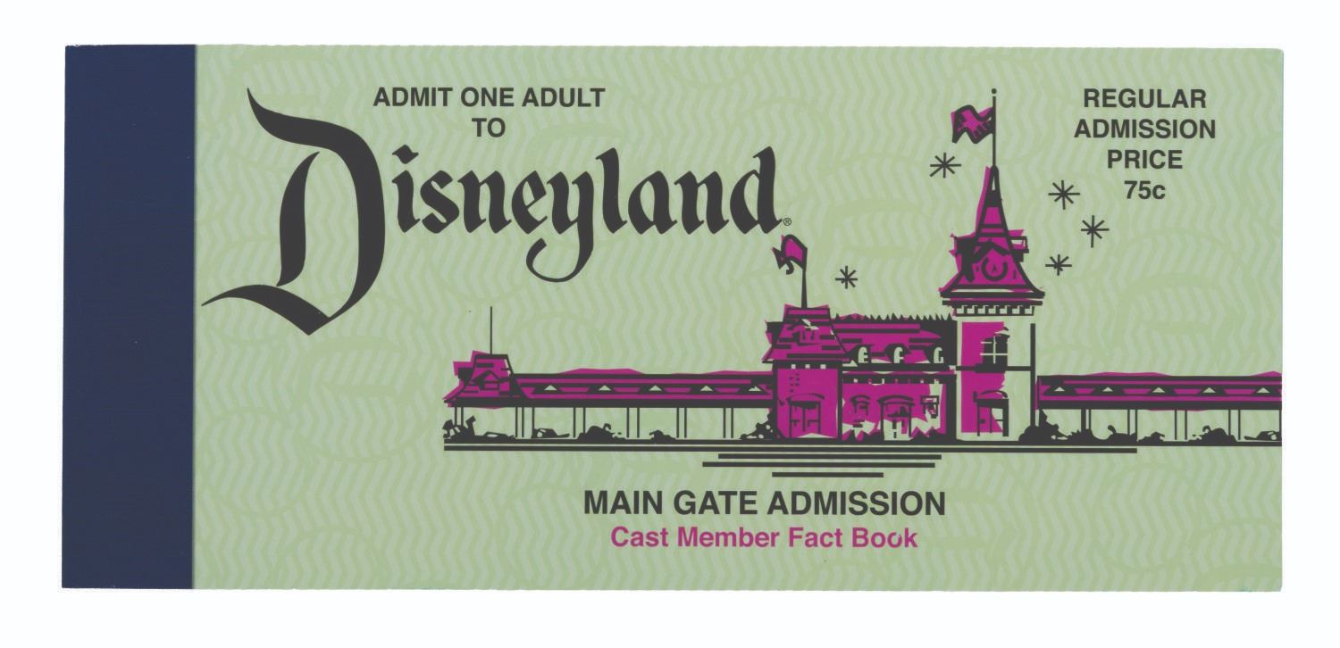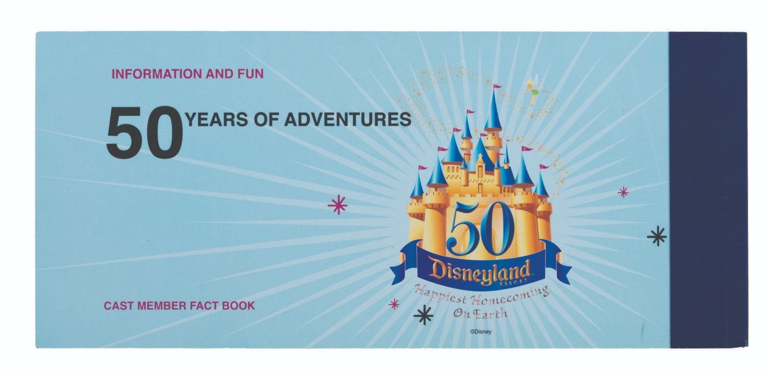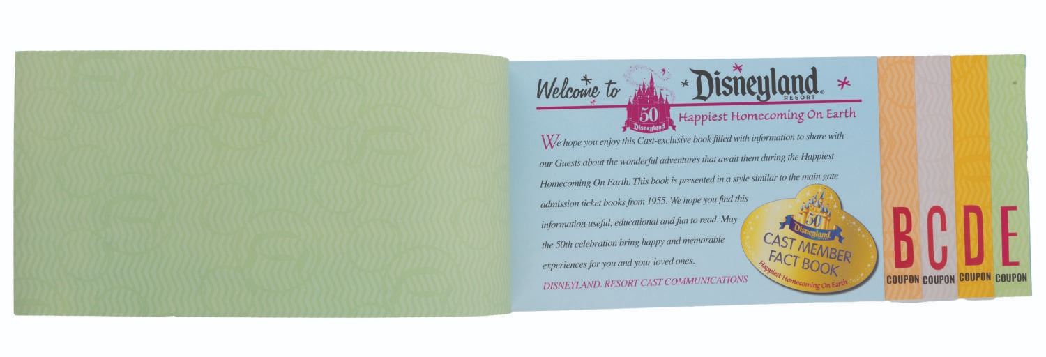 (Disneyland, 2005) A Disneyland Cast Member fact book in the style of a classic ticket book. Created for Cast Members during Disneyland’s 50th Anniversary year, this fact book includes great photos and information on the Park's history and Walt Disney himself. Measuring 4.75" x 10.75", the book is in fine condition.