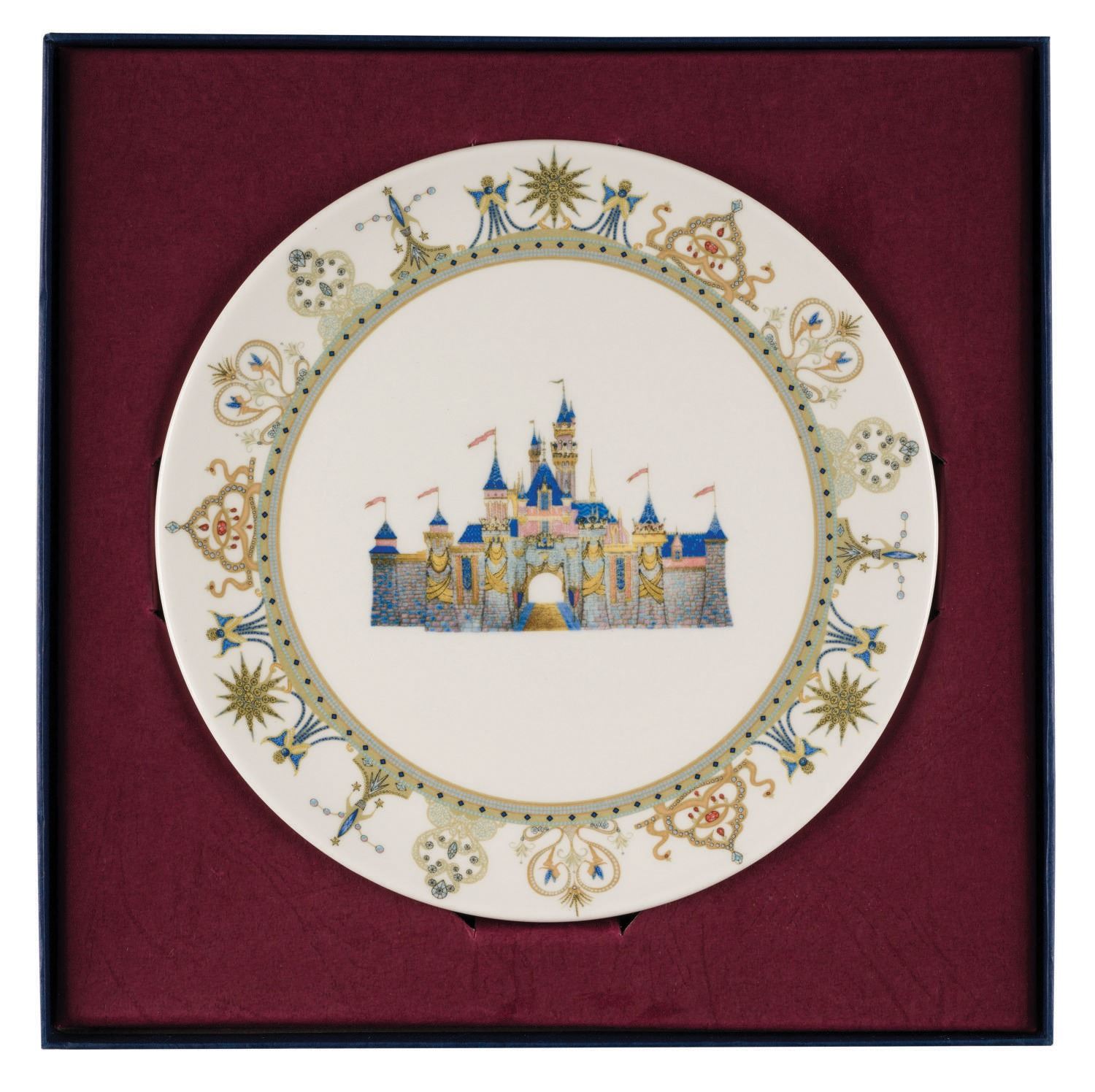(Disneyland, 2005) A commemorative Dudley China dessert plate celebrating the 50th anniversary of Disneyland – The Happiest Homecoming on Earth. A total of (6) dessert plate styles were released in the set and this plate ("Plate #6 Disneyland Castle") celebrates each bejeweled turret and "crown upon Sleeping Beauty Castle" as designed by Kim Irvine. Measuring 8.5" in diameter, the plate is in fine condition with original COA and original decorative box.