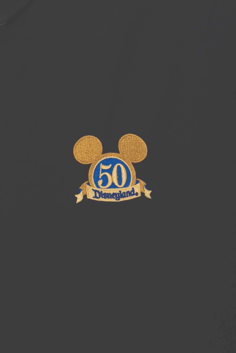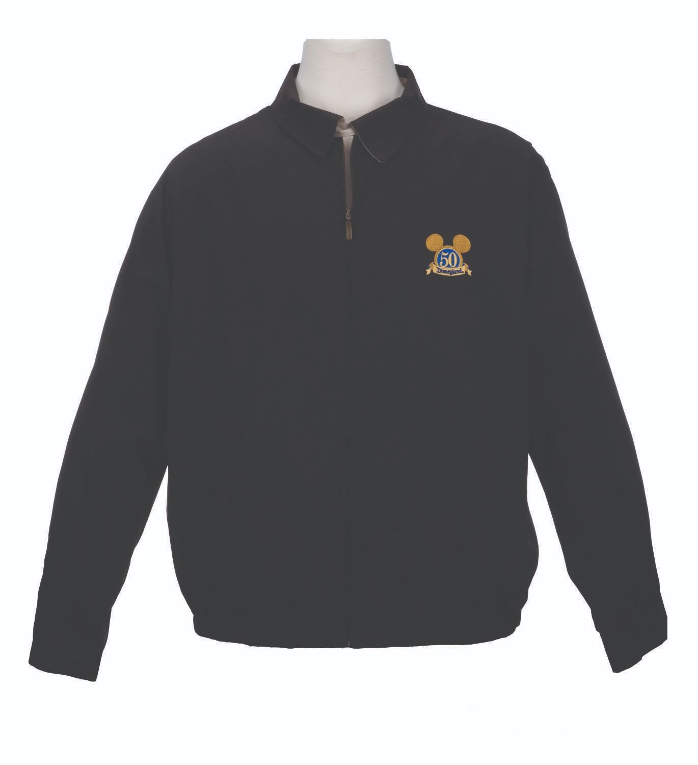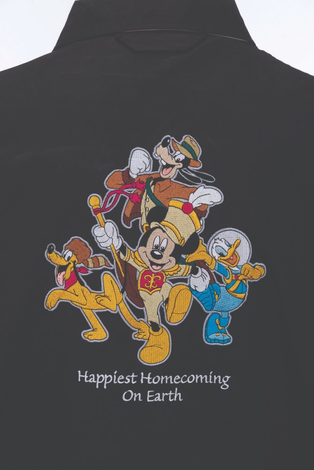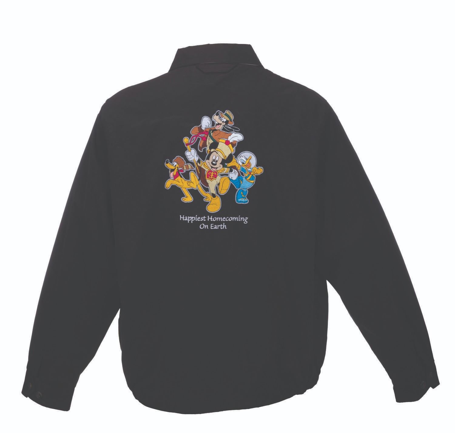 (Disneyland, 2005) A jacket featuring the Disneyland 50th anniversary logo on the chest and an embroidered Mickey Mouse and friends with the text "Happiest Homecoming on Earth" on the reverse. Inside of the jacket is a 4" x 6.5" velcro pocket. A size XXL, the jacket is in very good condition with minor wear.