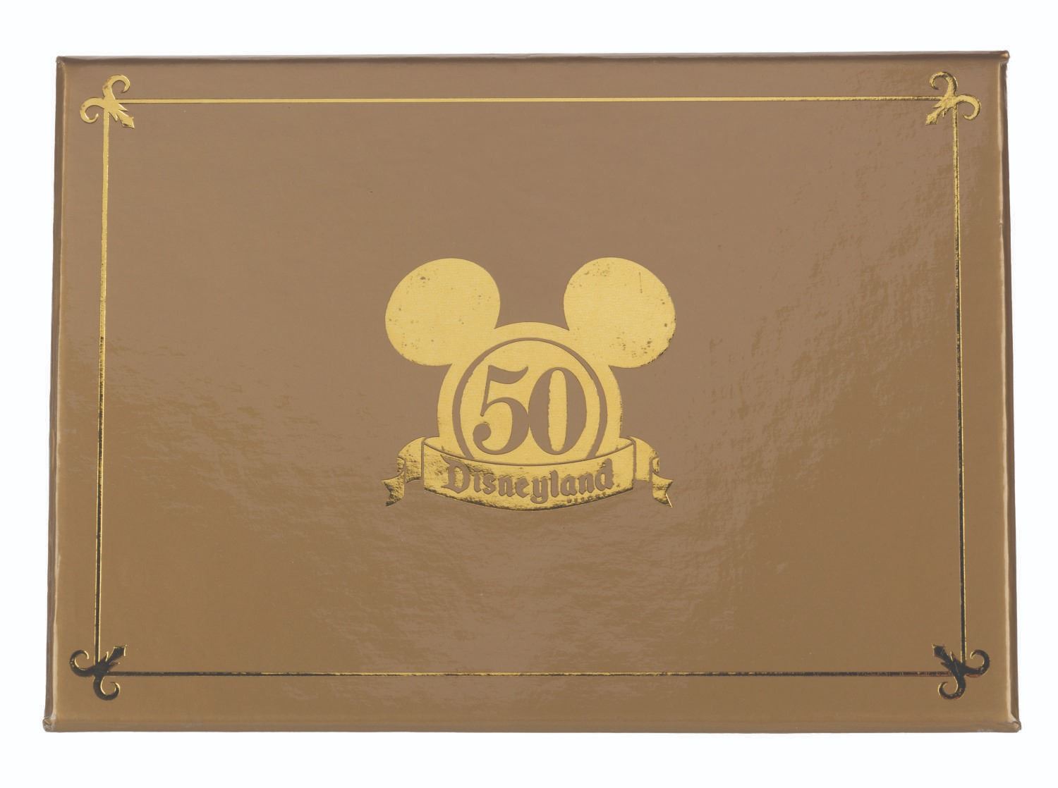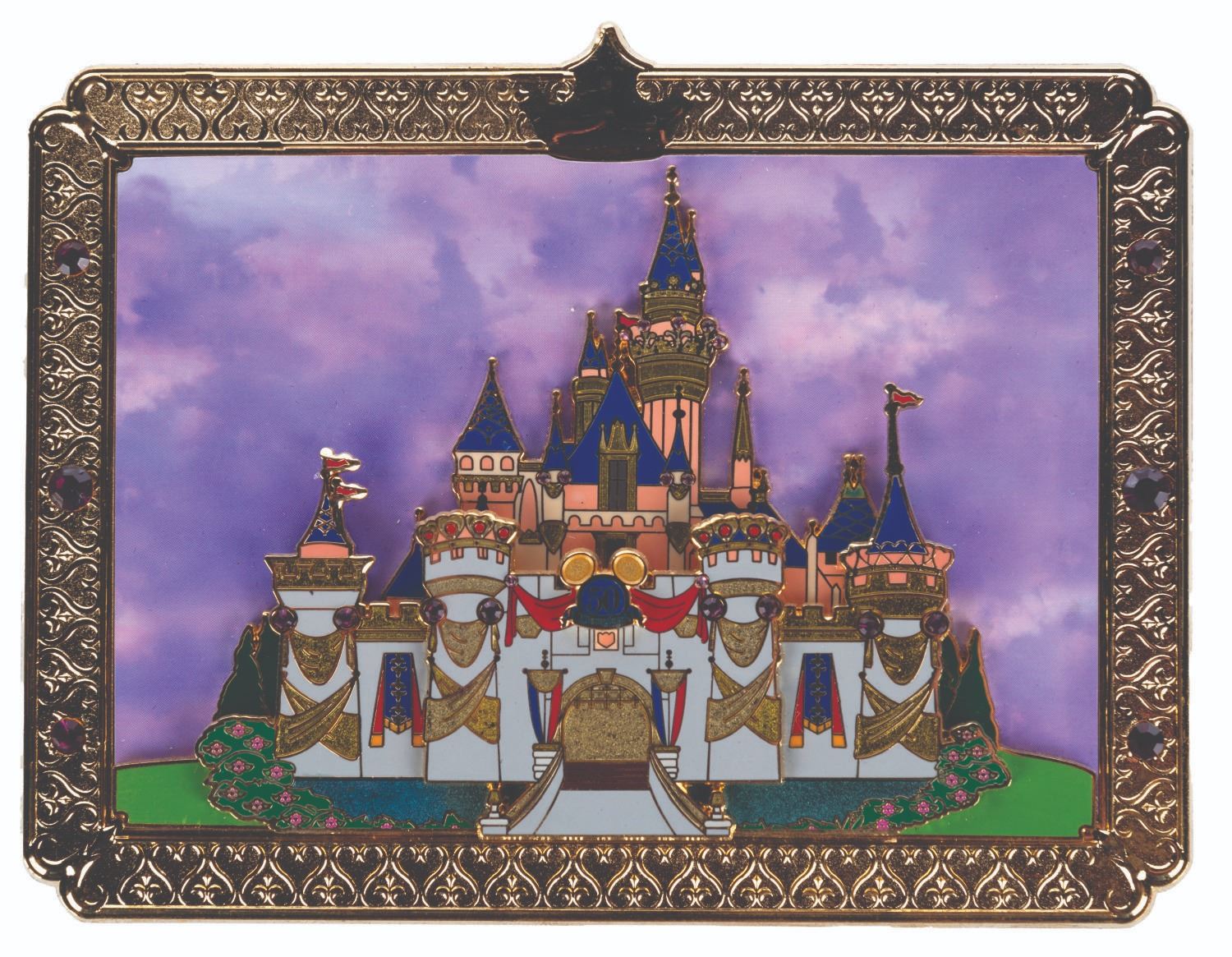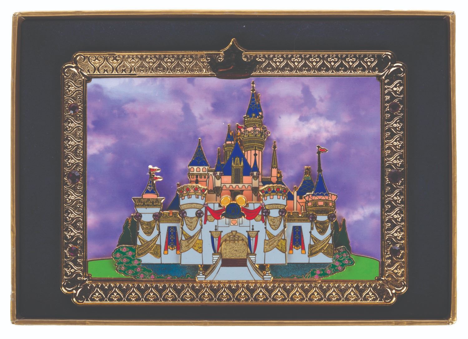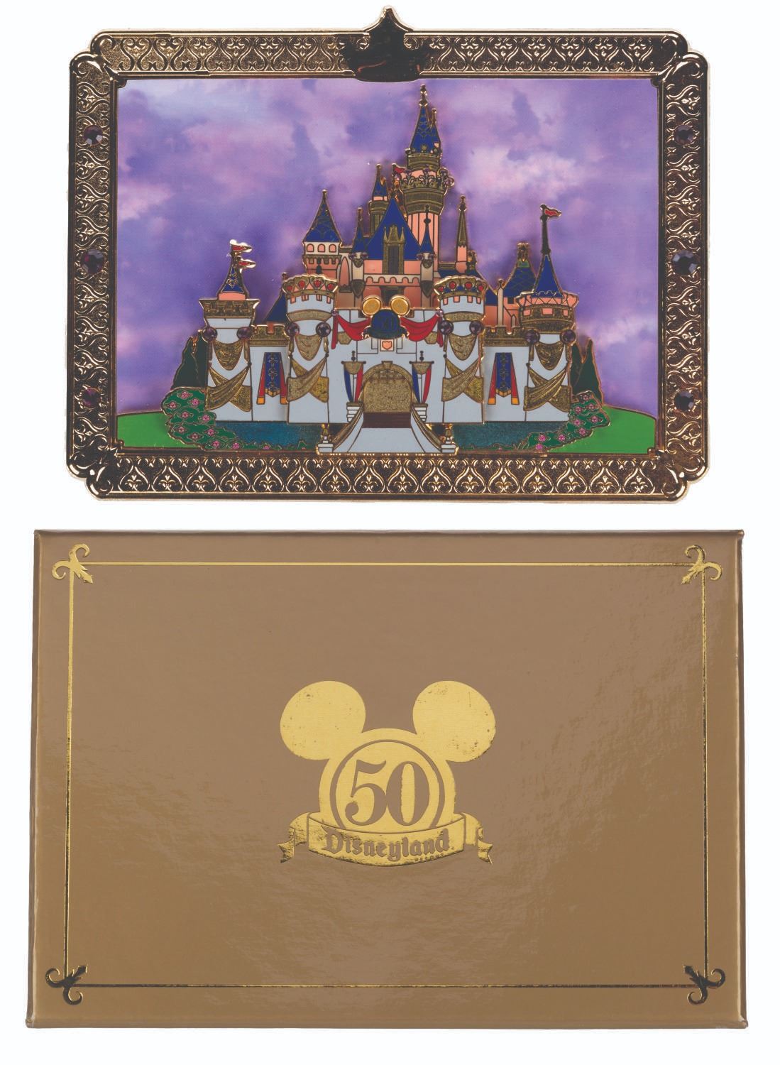 (Disneyland, 2005) A jumbo pin of Sleeping Beauty Castle decorated for Disneyland's 50th anniversary. Released in a limited edition of 1500, the pin measuring 3.75” x 4.75” is in fine condition, with the original box.