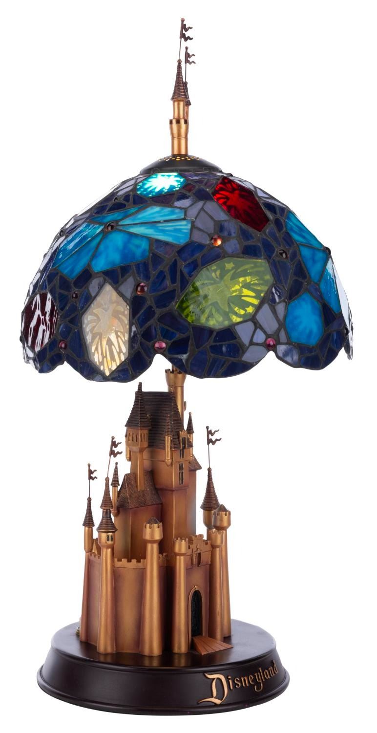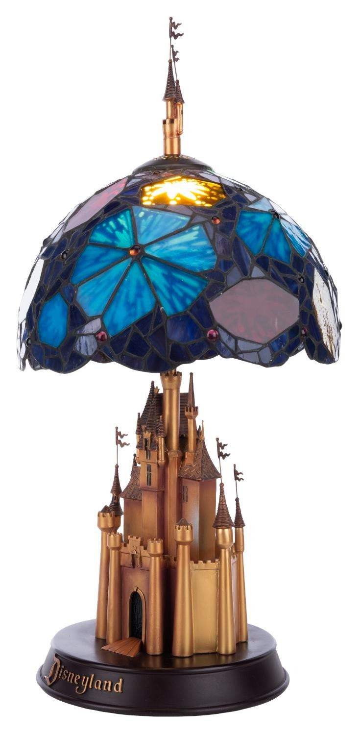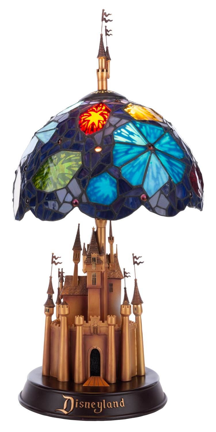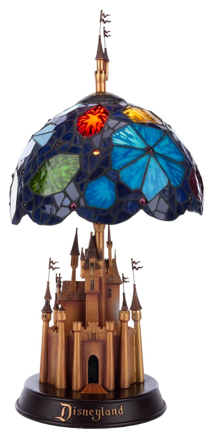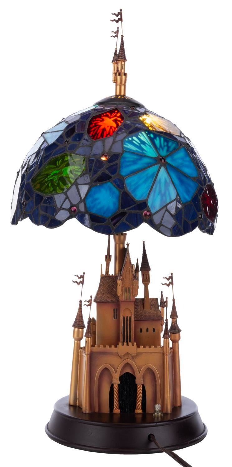 (Disneyland, 2005) A limited-edition "Fantasy in the Sky" stained glass lamp designed by Jody Daily, released during the 50th anniversary of Disneyland. This lamp has three functions: regular light, interior illumination of Sleeping Beauty Castle's windows, and the "fireworks"-themed lamp shade. Part of a limited edition of 1500 and measuring 22" tall with an 8.75" diameter, the lamp is in very good condition with light wear and a broken-off spire, which is included. The shade is in good condition with scratches and wear.