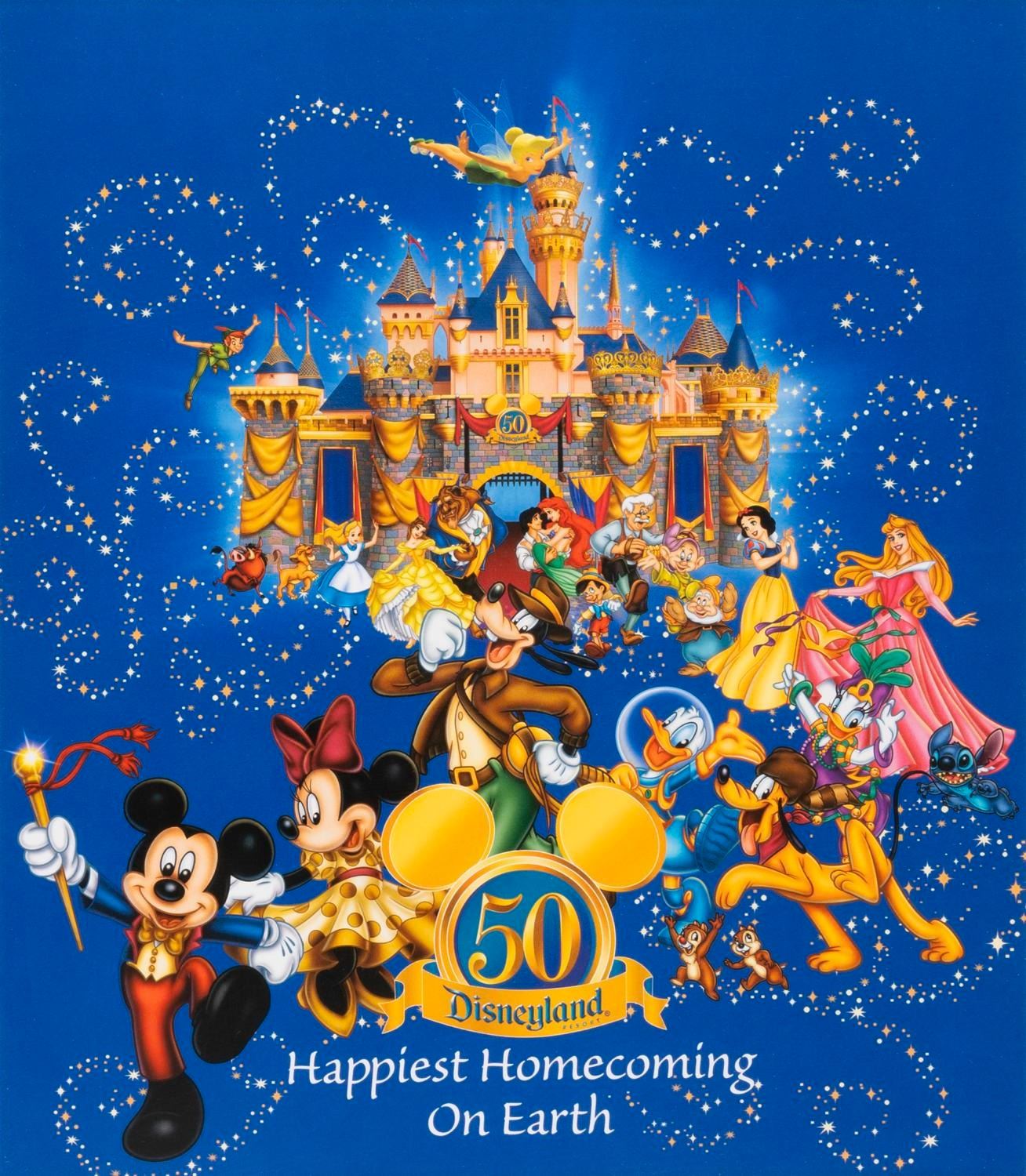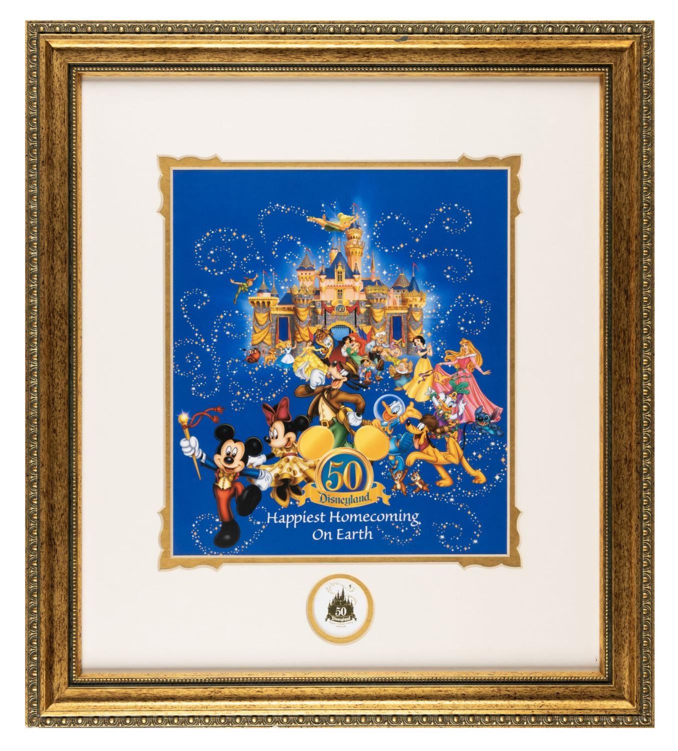 (Disneyland, 2005) An Annual Passholder exclusive lithograph released by Disneyland Resort in celebration of the Park's 50th Anniversary. "The Happiest Homecoming On Earth" depicts characters before the Sleeping Beauty Castle as it appeared in that anniversary year. With an image size of 9" x 10" in a 16" x 18" frame, the piece displays in fine condition, with the frame very good with two chips and one scuff to the front edge.