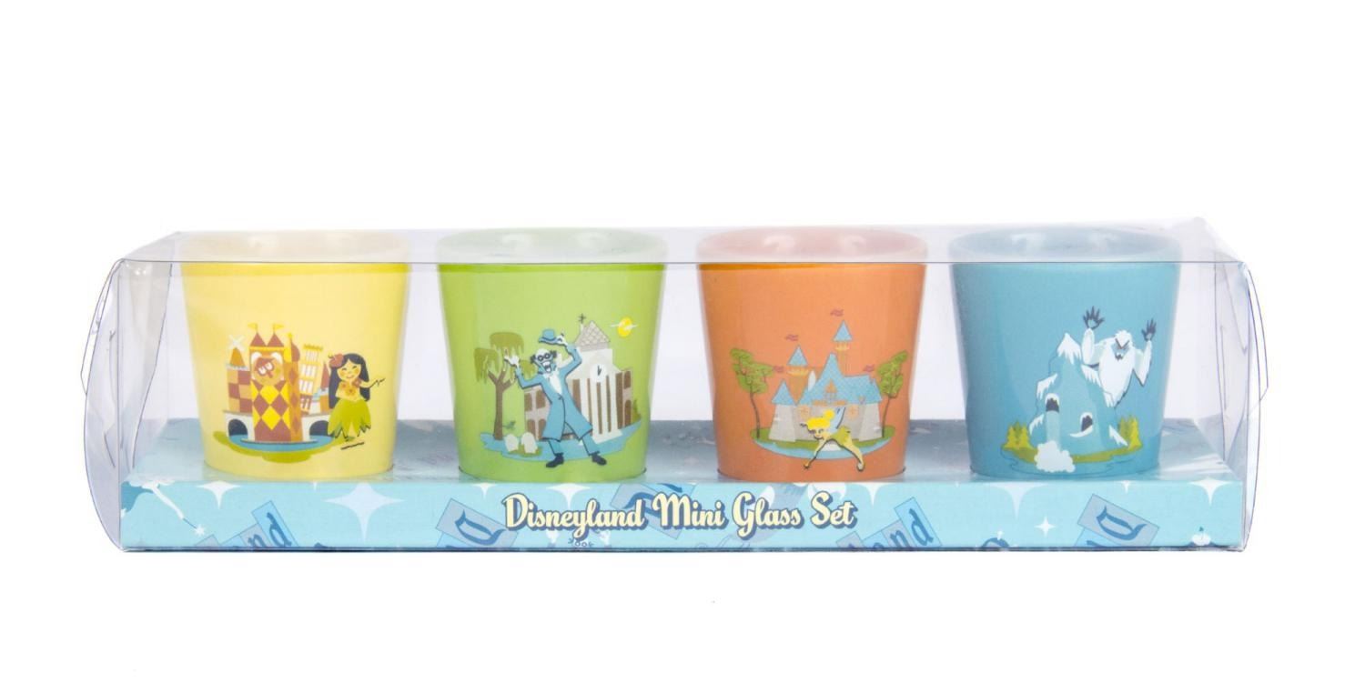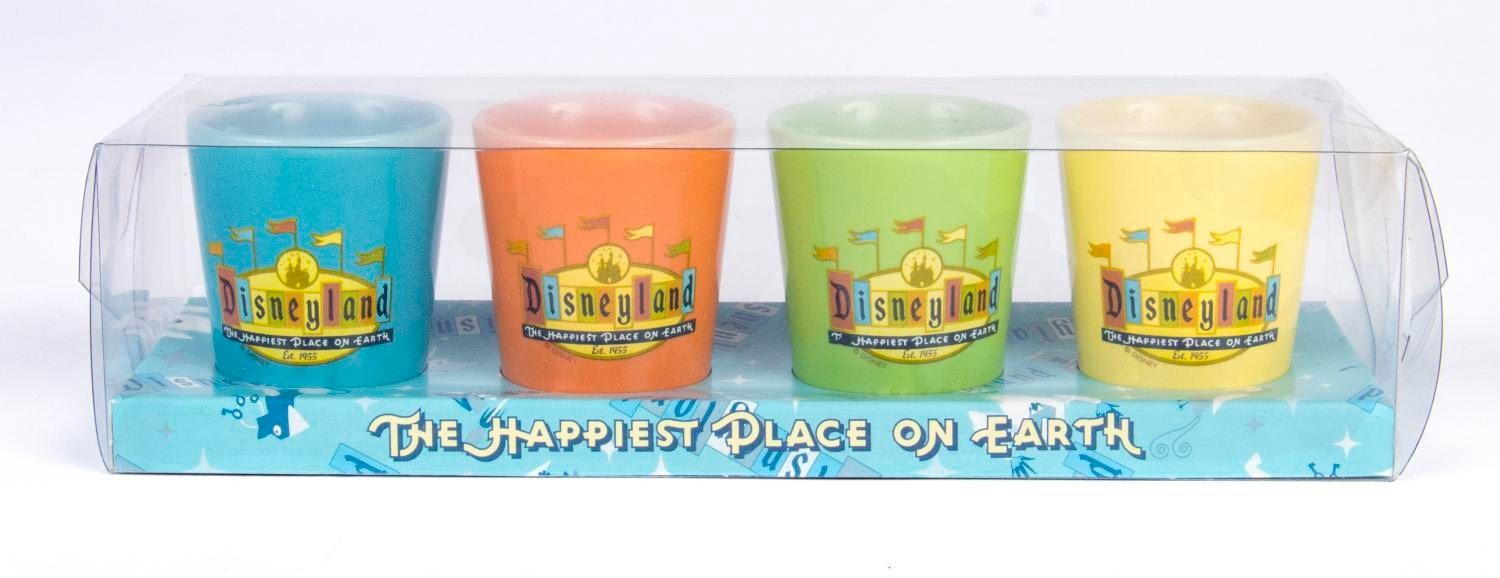 (Disneyland, 2005) A souvenir mini glass set from Disneyland, released for the Park's 50th anniversary. Included are four ceramic glasses featuring imagery inspired by It's a Small World, the Haunted Mansion, the Matterhorn Bobsleds, and Sleeping Beauty Castle with Tinker Bell. Measuring 2” in diameter at their widest point and 2.5” tall in their original 9.5” x 2” x 3.5” box, the glasses are in fine condition.