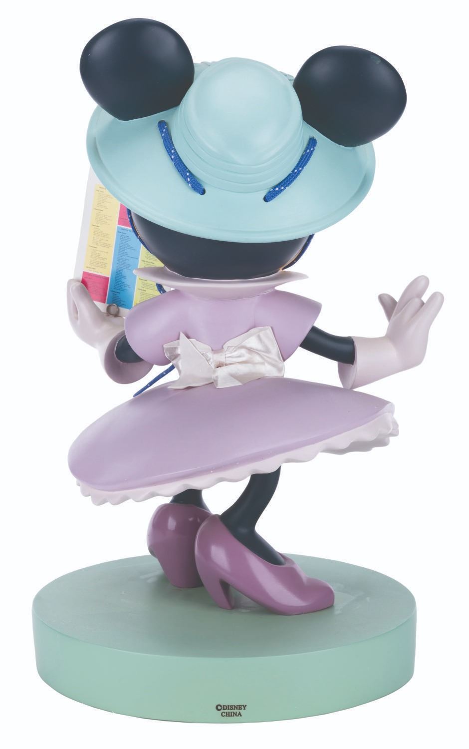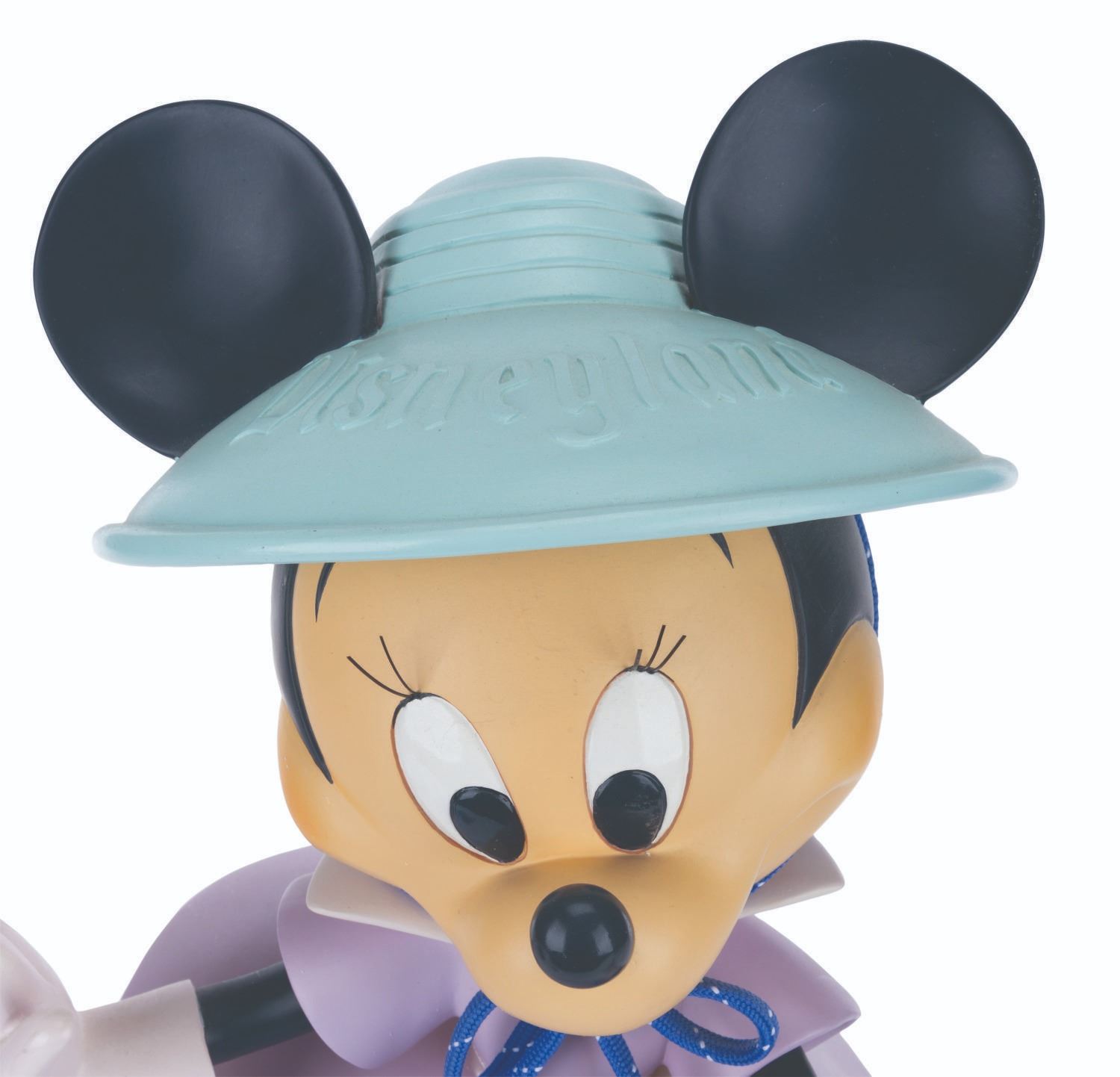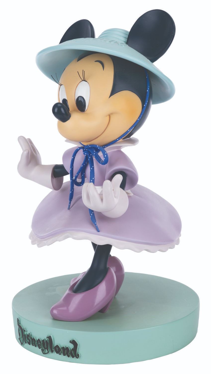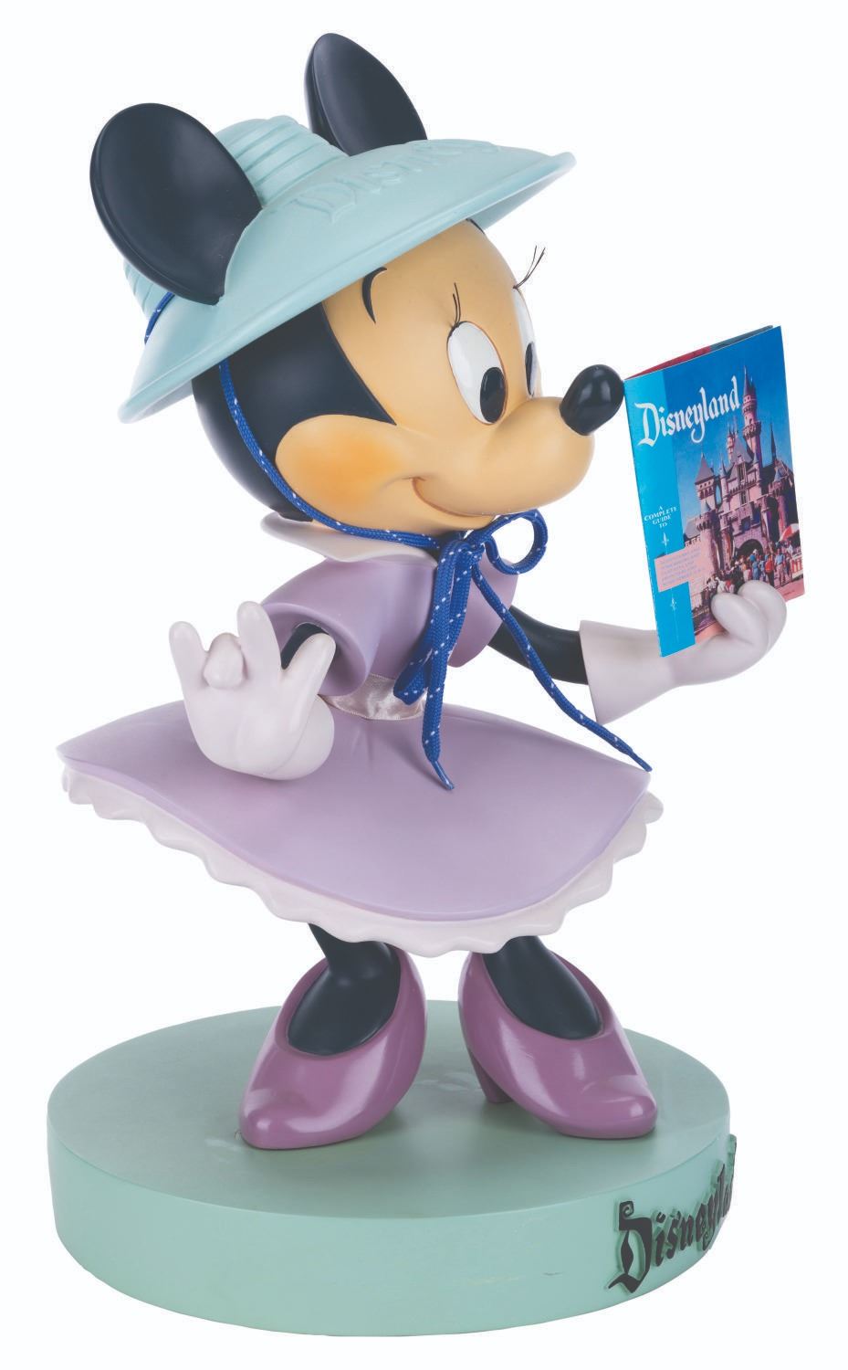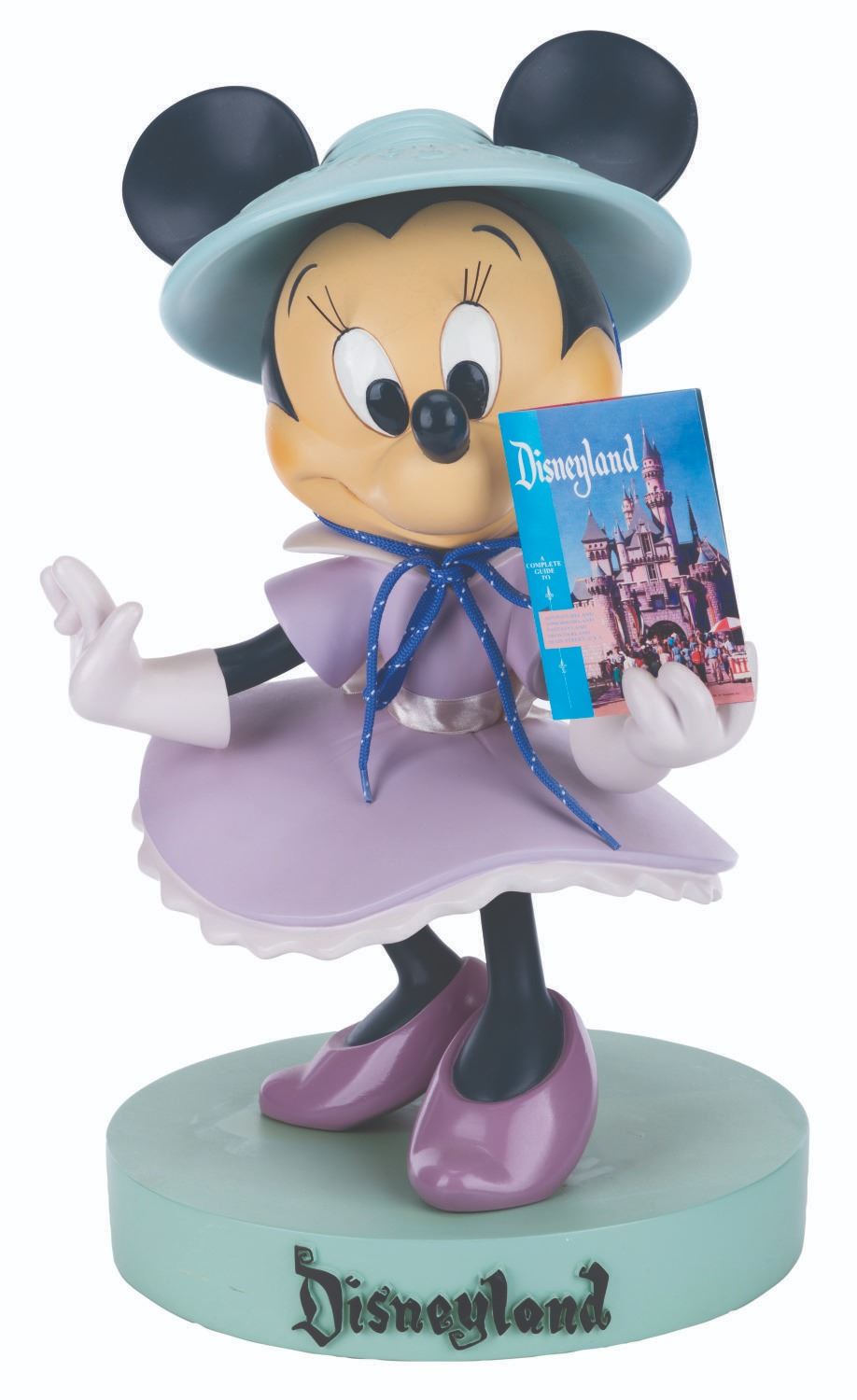 (Disneyland, 2005) A rare Minnie Mouse at Disneyland Big Fig, released for the 50th anniversary of the Park. Minnie is dressed in her Disneyland finest and holding a miniature copy of the Complete Guide to Disneyland. Measuring 12” x 9” x 17.5” tall on a detached base 11.25” in diameter, the Big Fig is in very good condition with light scratches, residue, scuffs on the base, and one eyelash missing.