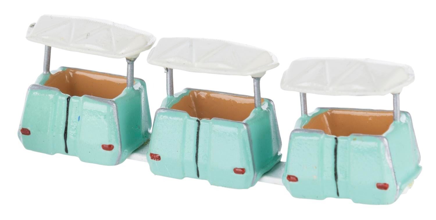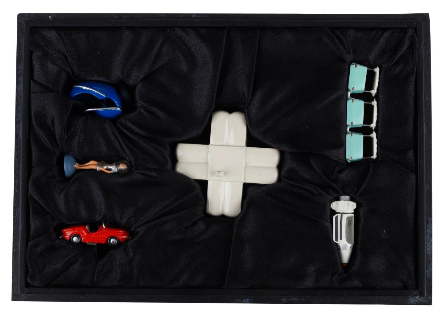 (Disneyland, 2005) A limited edition boxed set of Tomorrowland-themed pewter miniatures by Kevin Kidney and Jody Daily for Disneyland's 50th Anniversary. This set was limited to 1500 pieces and includes miniatures of the House of the Future, a Rocket Jet, a set of PeopleMover cars, an Autopia car, an Adventure Thru Inner Space vehicle, and a Tomorrowland Cast Member. Ranging in size from 1.5” tall to 2.5” x 2.5”, the figurines are in good to very good condition with scuffs, wear, and the lid of the box missing.
