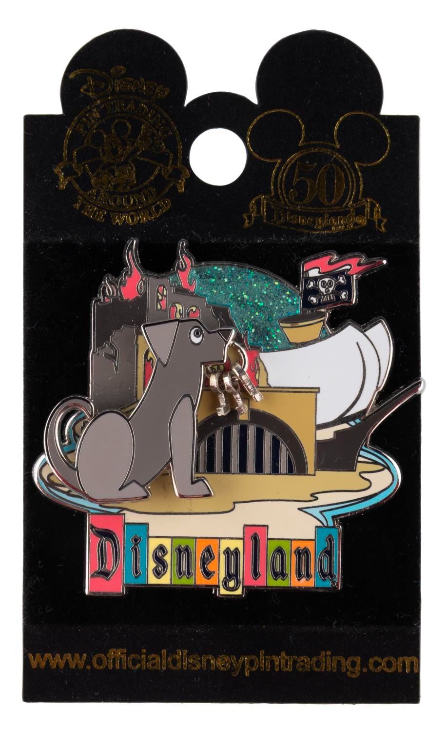 (Disneyland, 2005) A Pirates of the Caribbean pin-on-pin of the dog jail cell scene with dangle feature keys, released for the 50th anniversary of Disneyland. The pin is in fine condition on the original card.