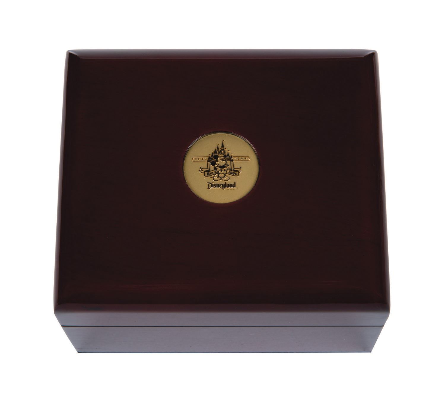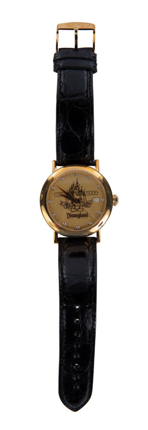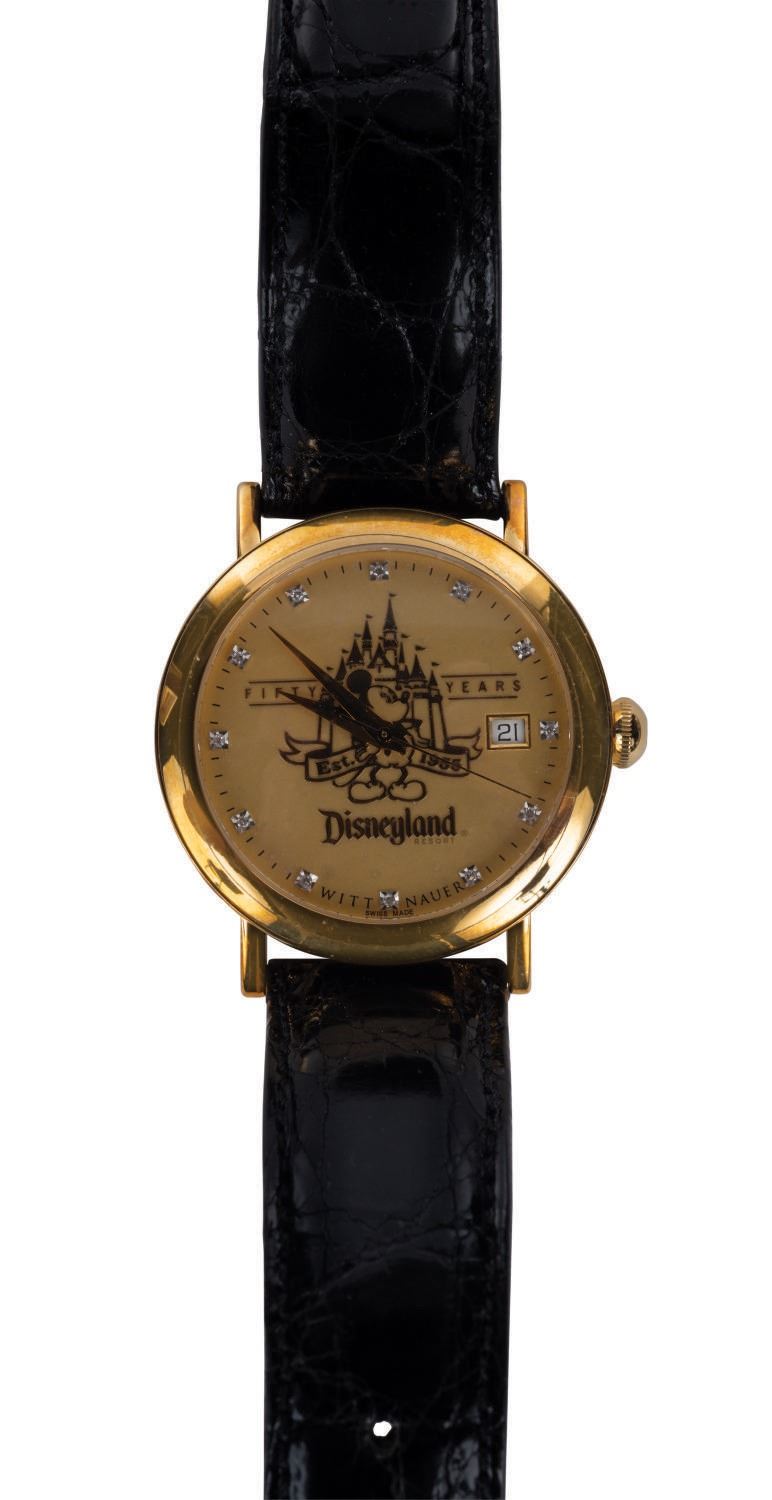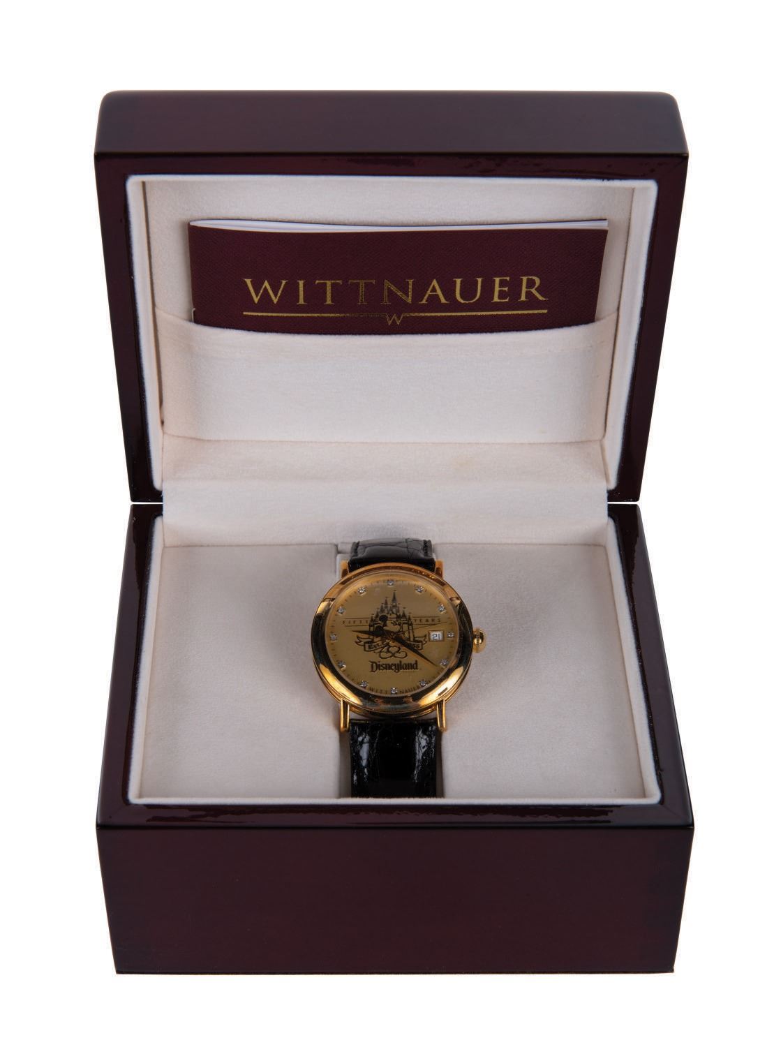 (Disneyland, 2005) A rare limited edition Wittnauer Wrist Watch created exclusively for the 50th anniversary of Disneyland. Numbered "2" out of only 50 made, the women's style 18K yellow gold watch features diamond hour markers under a 28mm water-resistant and scratch-resistant sapphire crystal. This extremely limited-edition watch comes complete with shiny black crocodile-style band, Owner's Guide, COA and other materials enclosed inside a commemorative "Disneyland 50th" glossy wooden box. The watch, accessories, and box are in very fine condition.