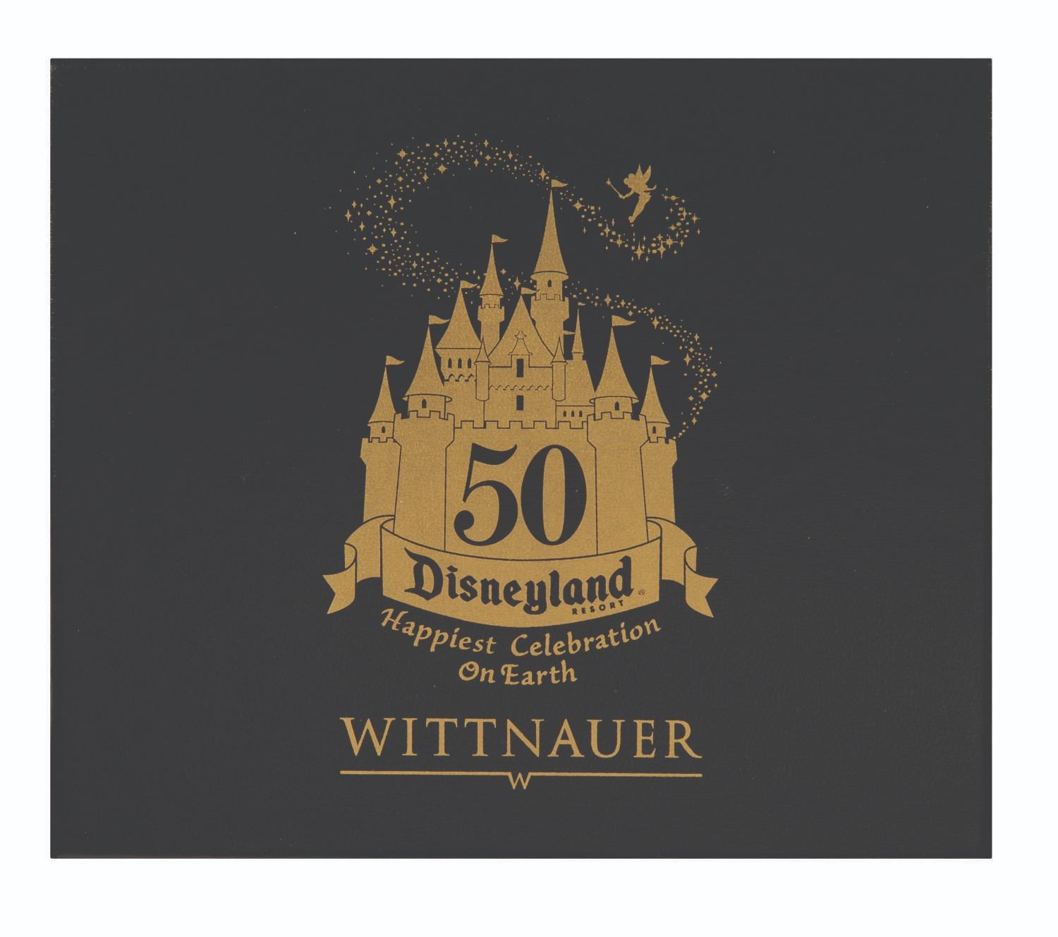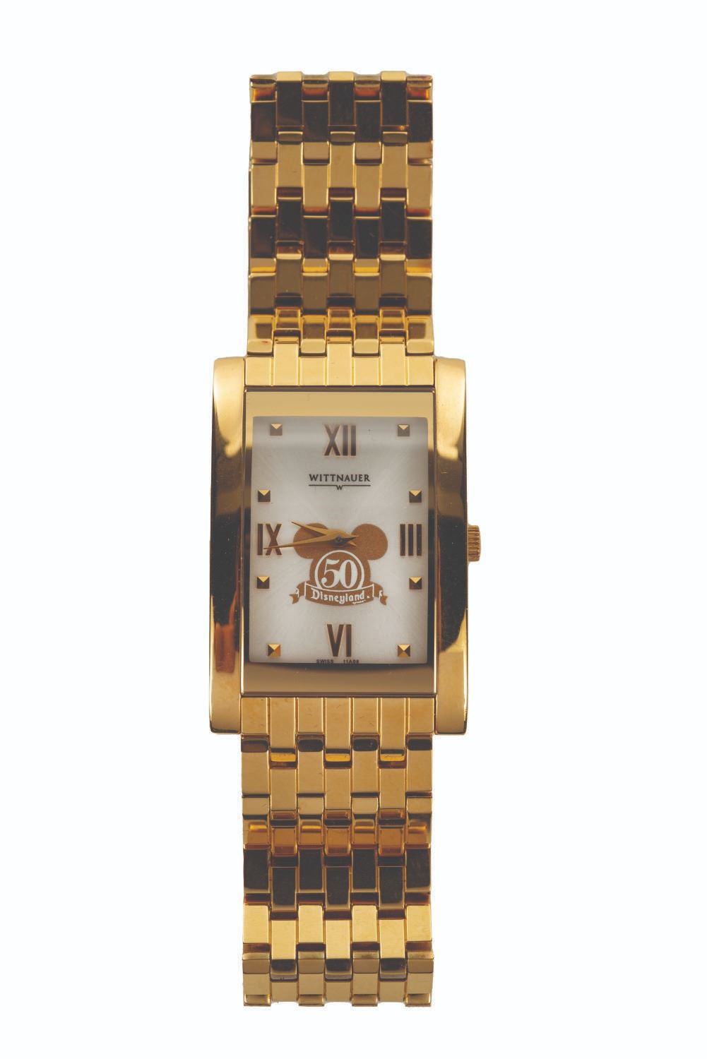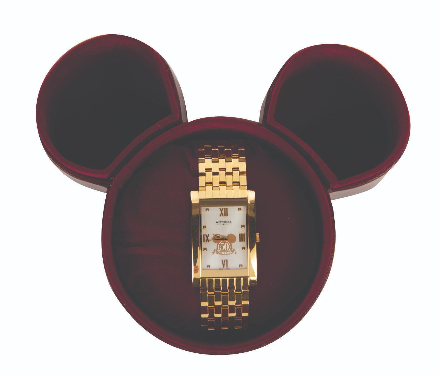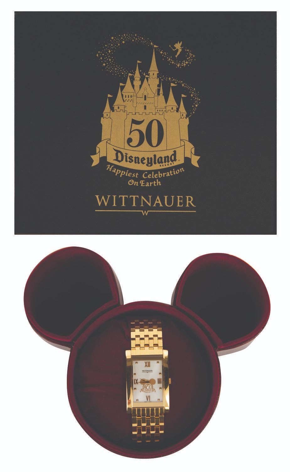 (Disneyland, 2005) A limited edition Wittnauer Wristwatch released for the 50th anniversary of Disneyland. The women’s style gold watch features Roman numerals under water-resistant and scratch-resistant sapphire crystal with a stainless steel back. The watch comes complete in a Mickey-shaped jewelry case with extra polished bracelet links, an owner’s guide, COA, and other materials. The watch, accessories, and box are in fine as-new condition.
