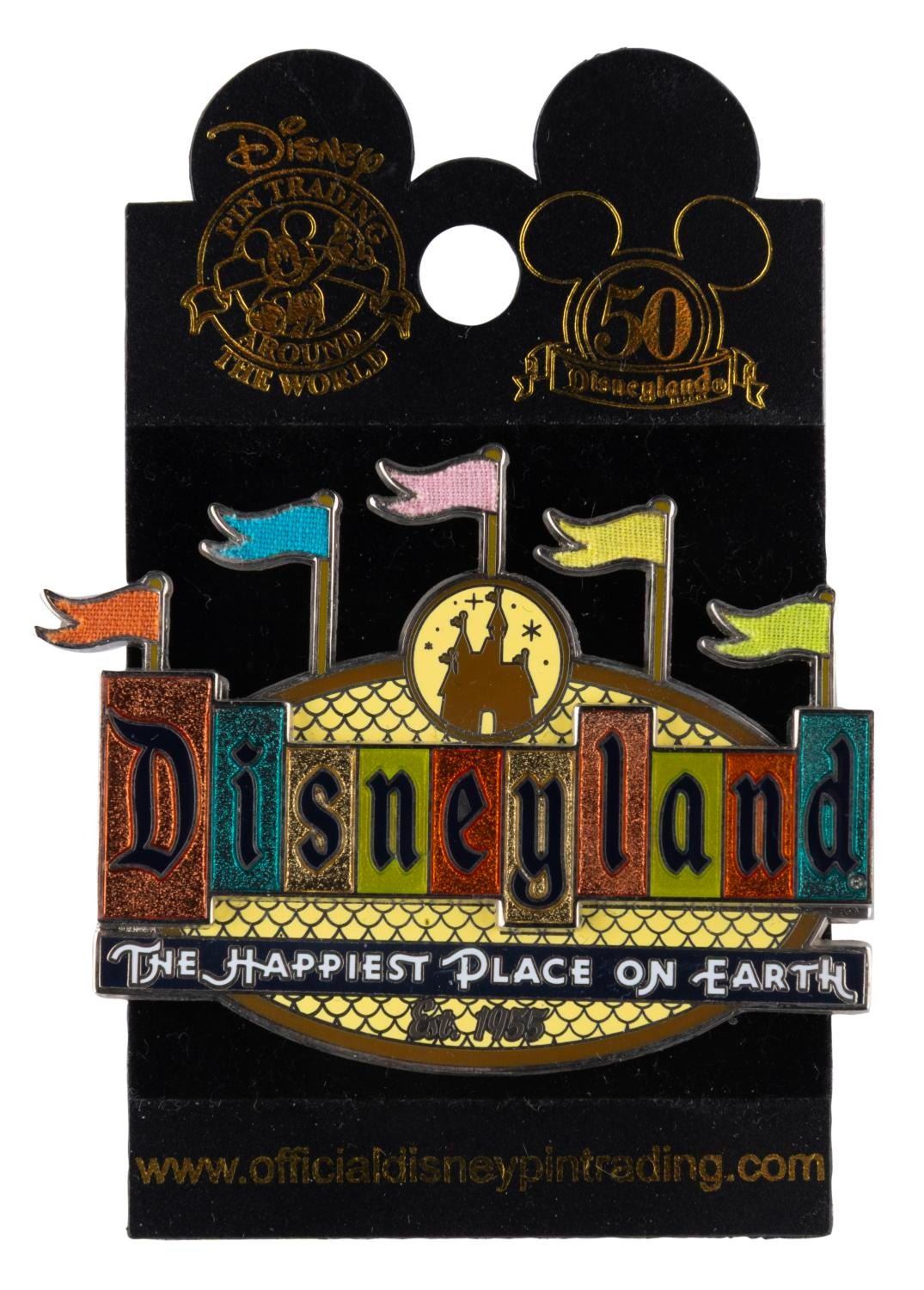 (Disneyland, 2005) A Disney Pin Trading Around the World "Happiest Place on Earth" marquee pin released for Disneyland’s 50th anniversary. The pin is in fine condition on the original card.