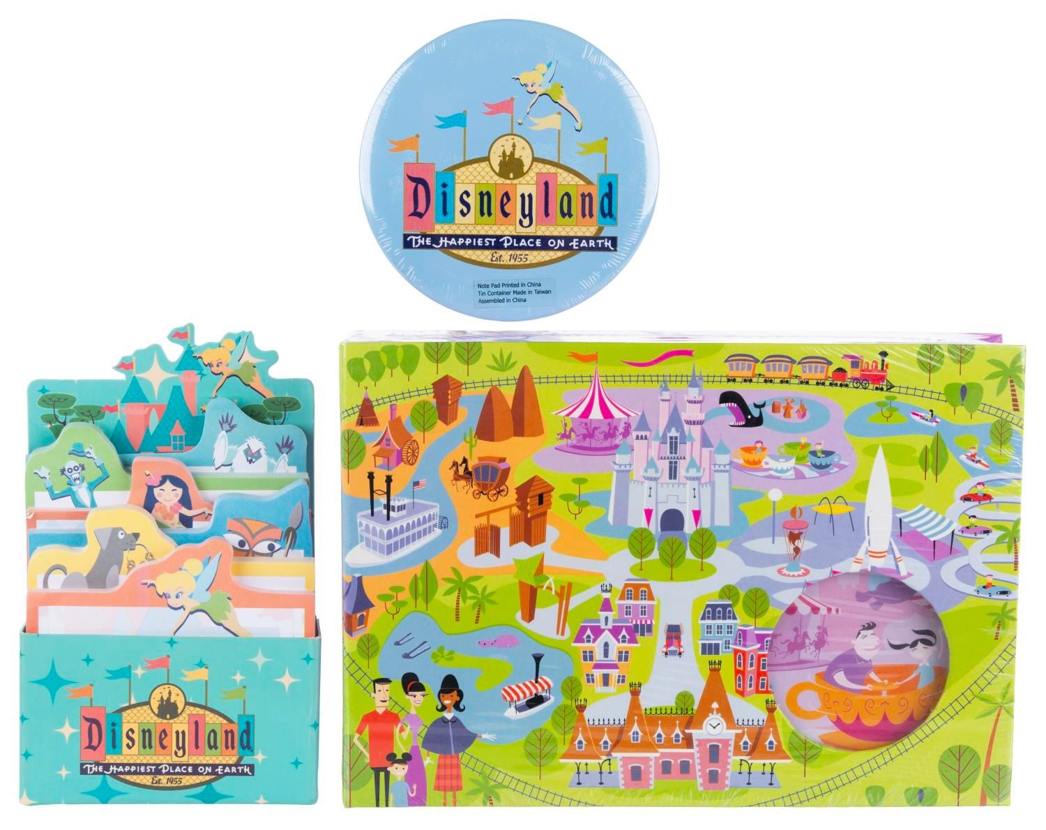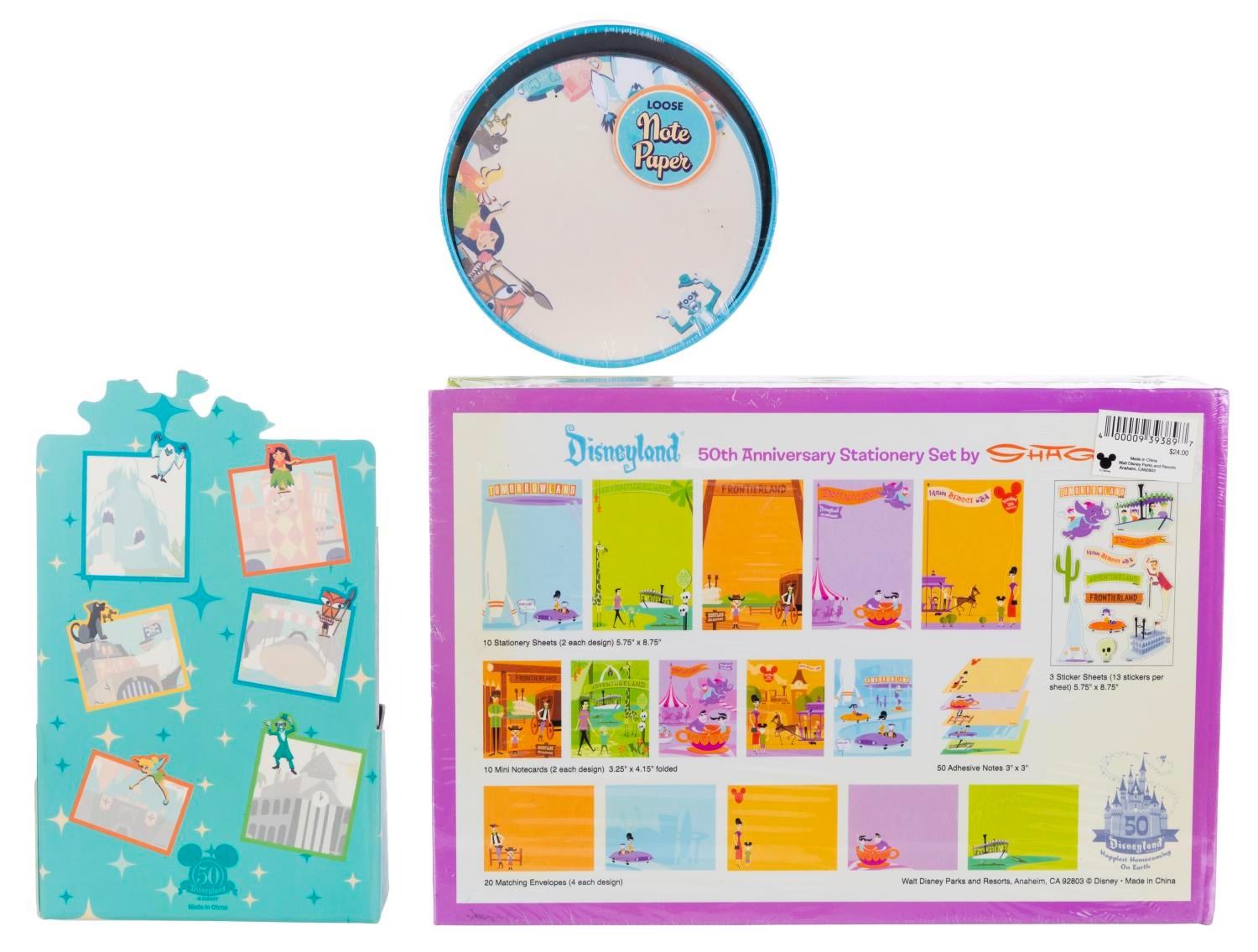 Disneyland, 2005) A complete stationery set designed by SHAG for Disneyland's 50th anniversary. Included in the set are ten stationery sheets, ten mini notecards with two of each design, and 20 matching envelopes. Also included are a 50th anniversary tin of loose note paper, and a set of adhesive notes with five different designs. Measuring from the 4.5" diameter 2" tall tin and the 9.5" x 6.5" and 2" tall stationery set, the items are in fine to very good condition with both the stationery set and tin unopened and light edge wear to the adhesive notes.