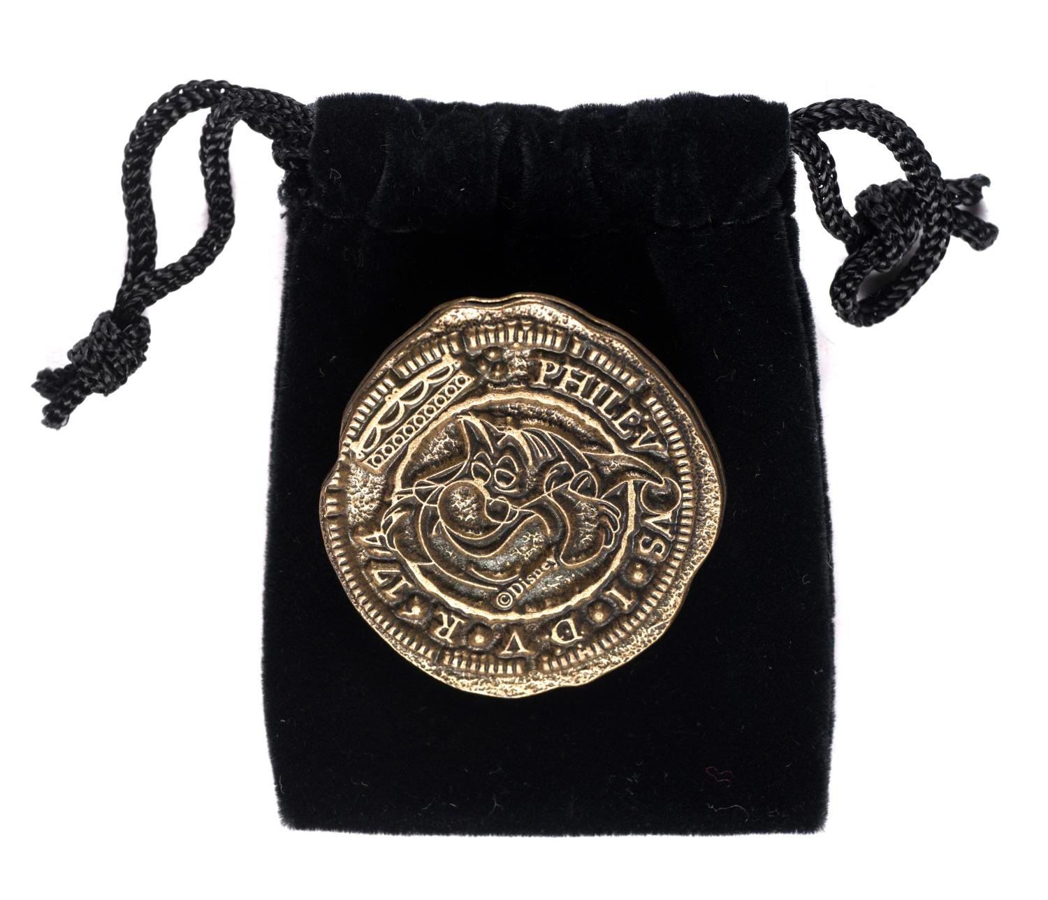 (Disneyland, 2006) A commemorative souvenir coin of the Disneyland 5K run event. The coin features the Pirates of the Caribbean logo and Smee on the reverse. Measuring 1.25" in diameter, the doubloon coin is in fine condition in original velvet bag.