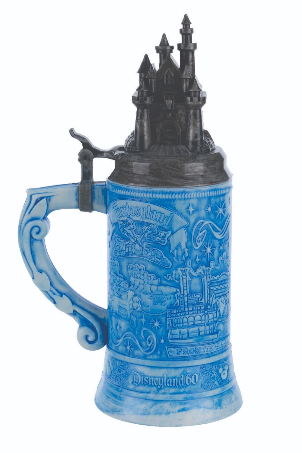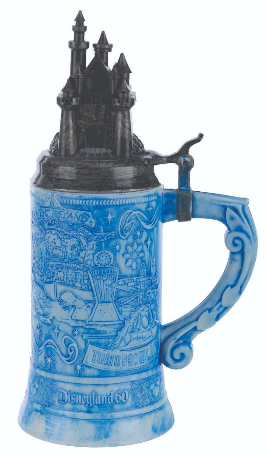 (Disneyland, 2015) A blue plastic stein commemorating the 60th anniversary of Disneyland. Featured around the stein is raised imagery from each of the lands in the Park. Measuring 10.5” tall and 4” in diameter, the stein is in fine condition.