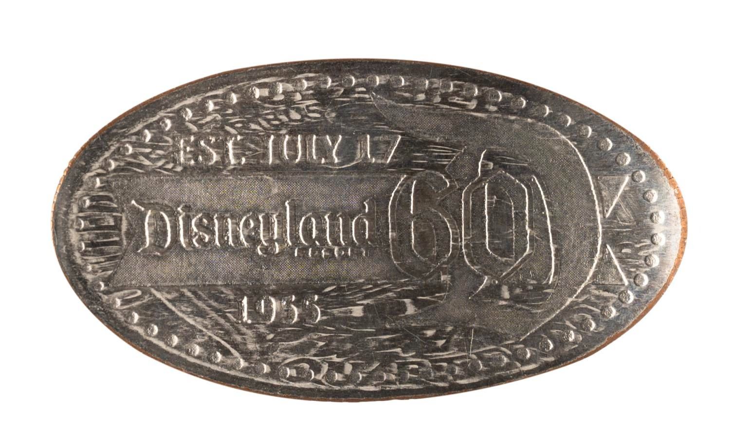 (Disneyland, 2015) A Disneyland 60th anniversary Main Street, U.S.A. pressed quarter. Measuring 1” x 1.75”, the souvenir coin is in very good condition with a light warp, scratches, and wear.