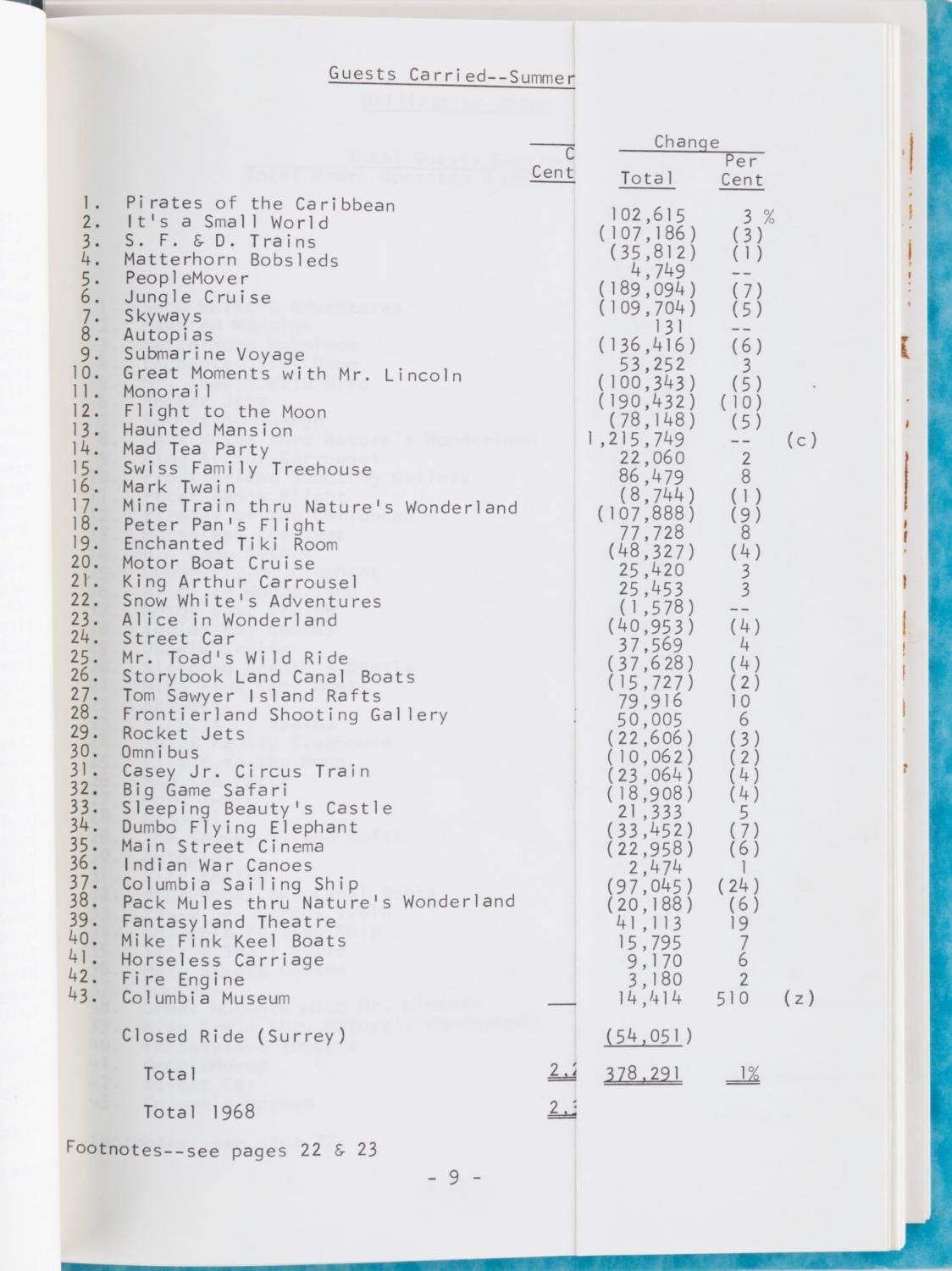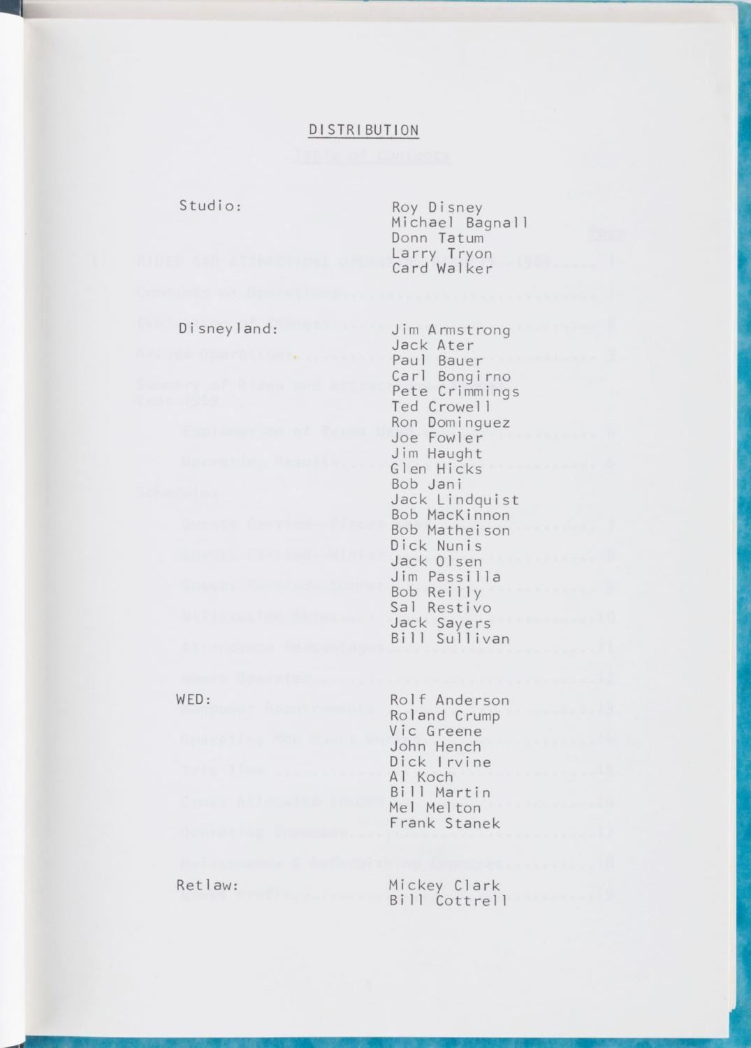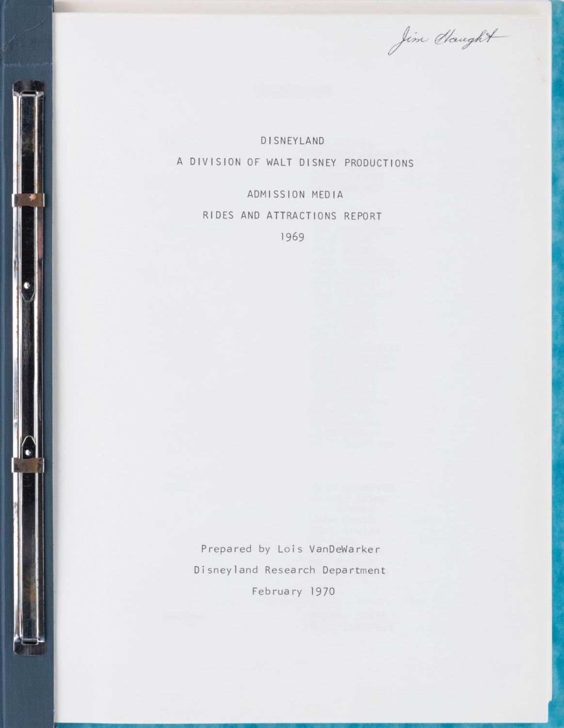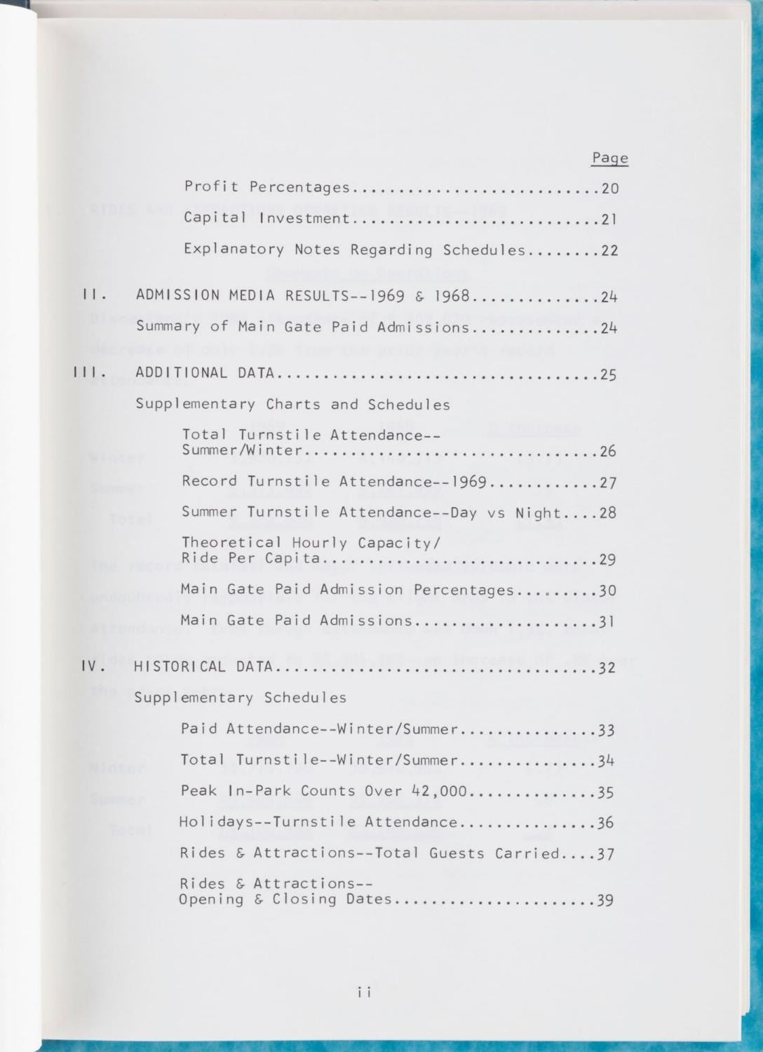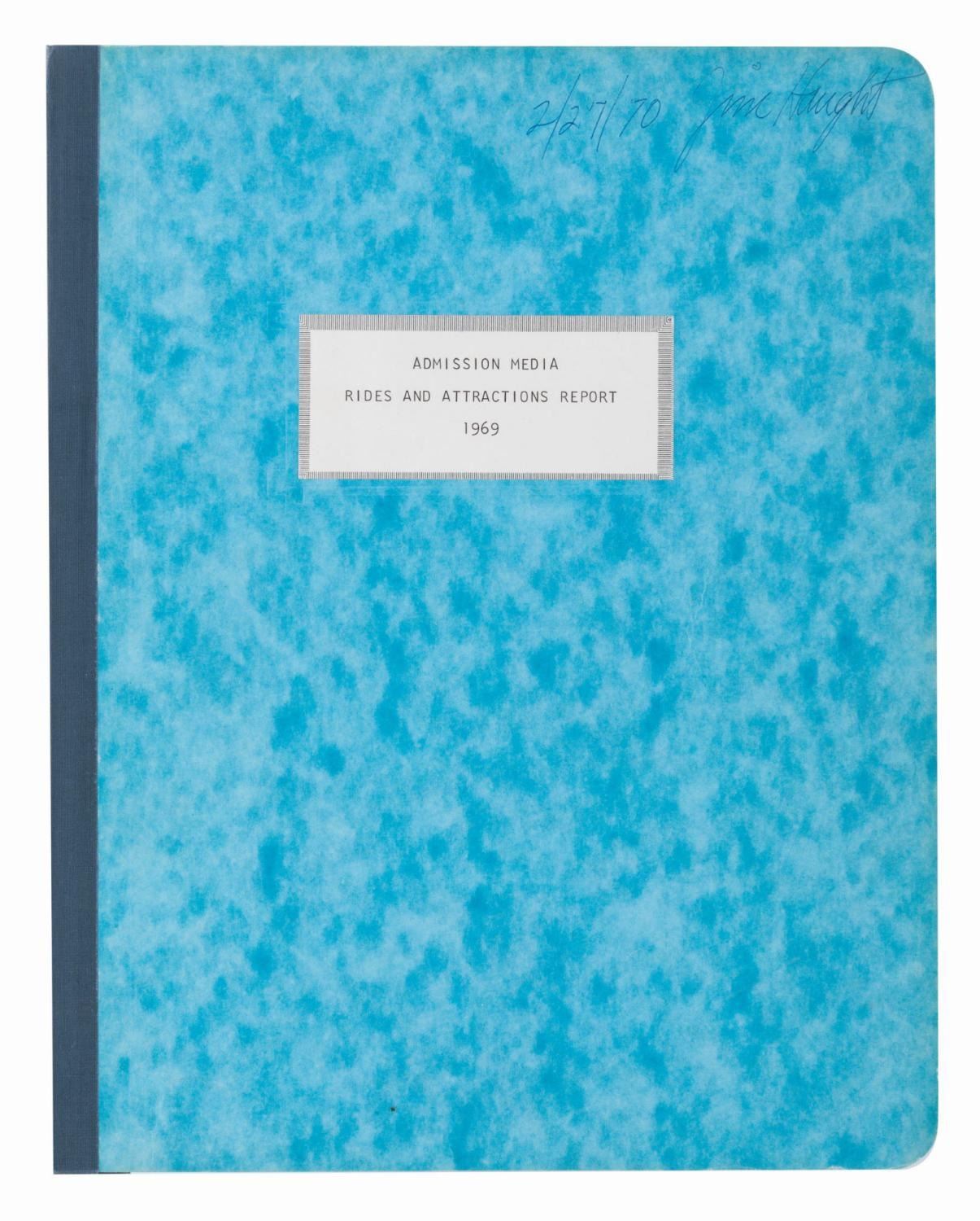 (Disneyland, 1970) A 40-page report by the Disneyland Research Department outlining attraction performance and fluctuations in 1969, the year the Haunted Mansion opened. Also included is a report on food service sales and planned maintenance in the Park through 1971. The reports are in very good condition with typical wear from use and age.