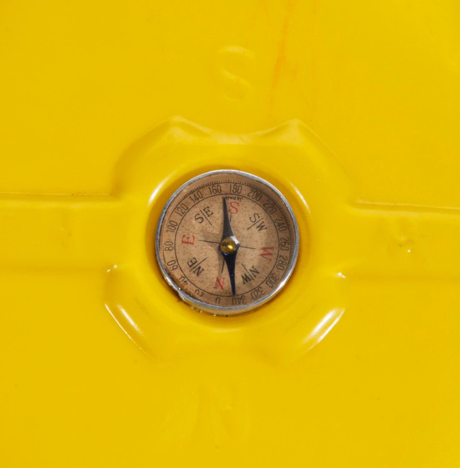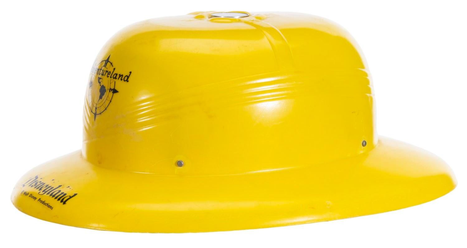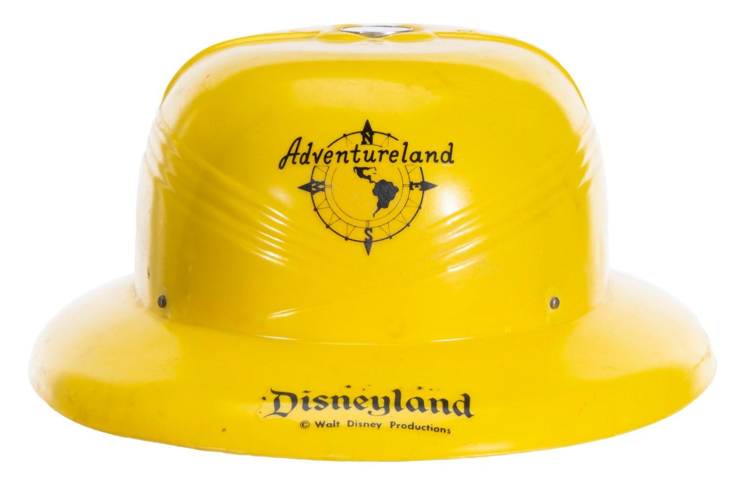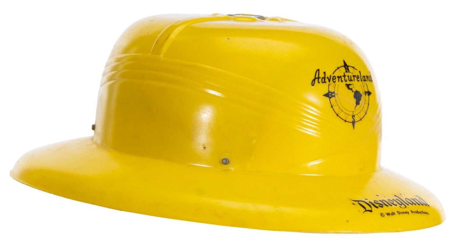 (Disneyland, 1950s-60s) A rare souvenir Adventureland plastic helmet with a compass on the top. Measuring 9.25” x 12” x 4.5” tall, the yellow helmet is in good condition with scuffs, stains, and wear.