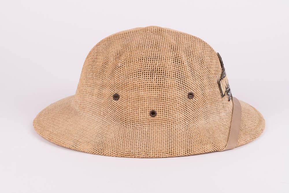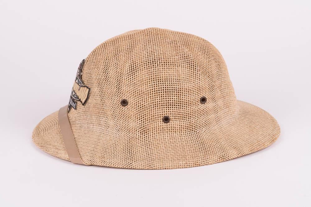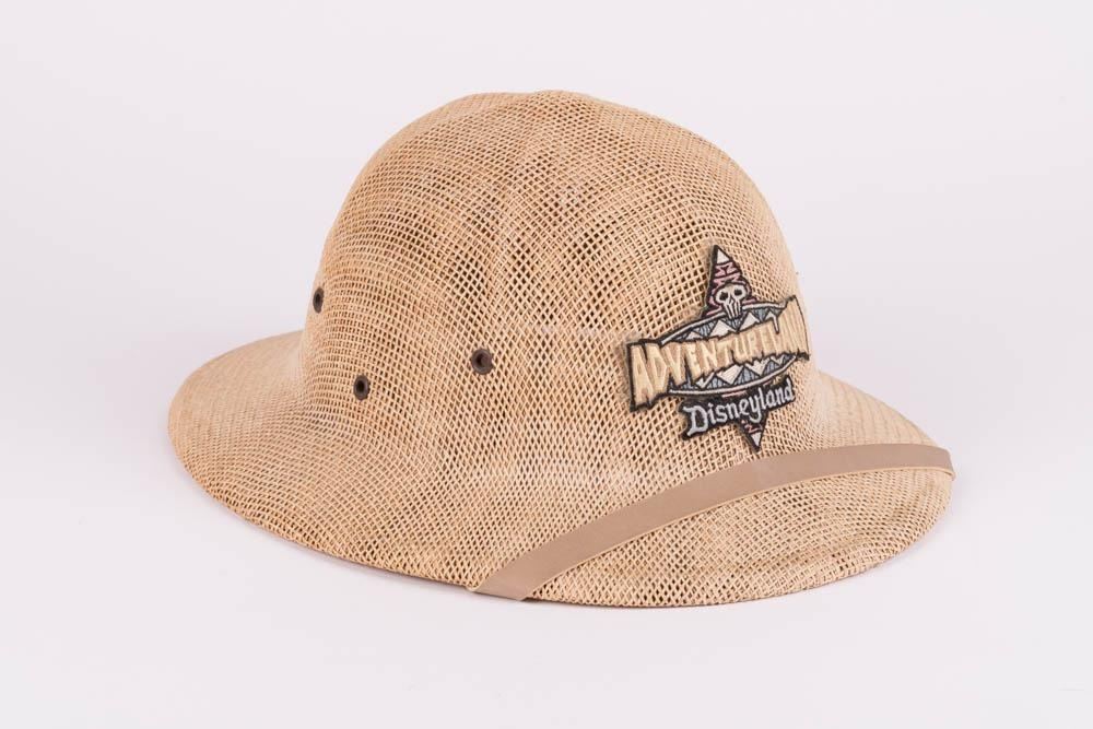 (Disneyland) A souvenir hat featuring an embroidered patch reading "Adventureland" and "Disneyland". The adjustable hat measures 11"x13.5"x5.5" and is in very good condition with light wear.