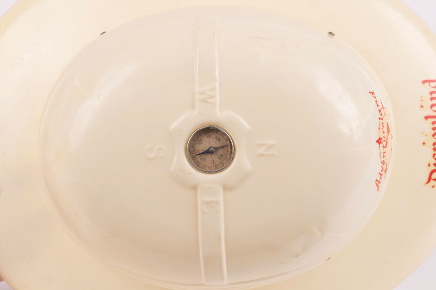 (Disneyland, 1950s-60s) A white plastic pith-style safari hat souvenir of Adventureland at Disneyland. The vintage 1950s-60s hat features a compass in the crown and straps inside. Measuring 9.25"x12" and 5" tall, the hat is in good condition overall with stress marks and mild creases, scuffs and yellowing to the decals from age and handling.