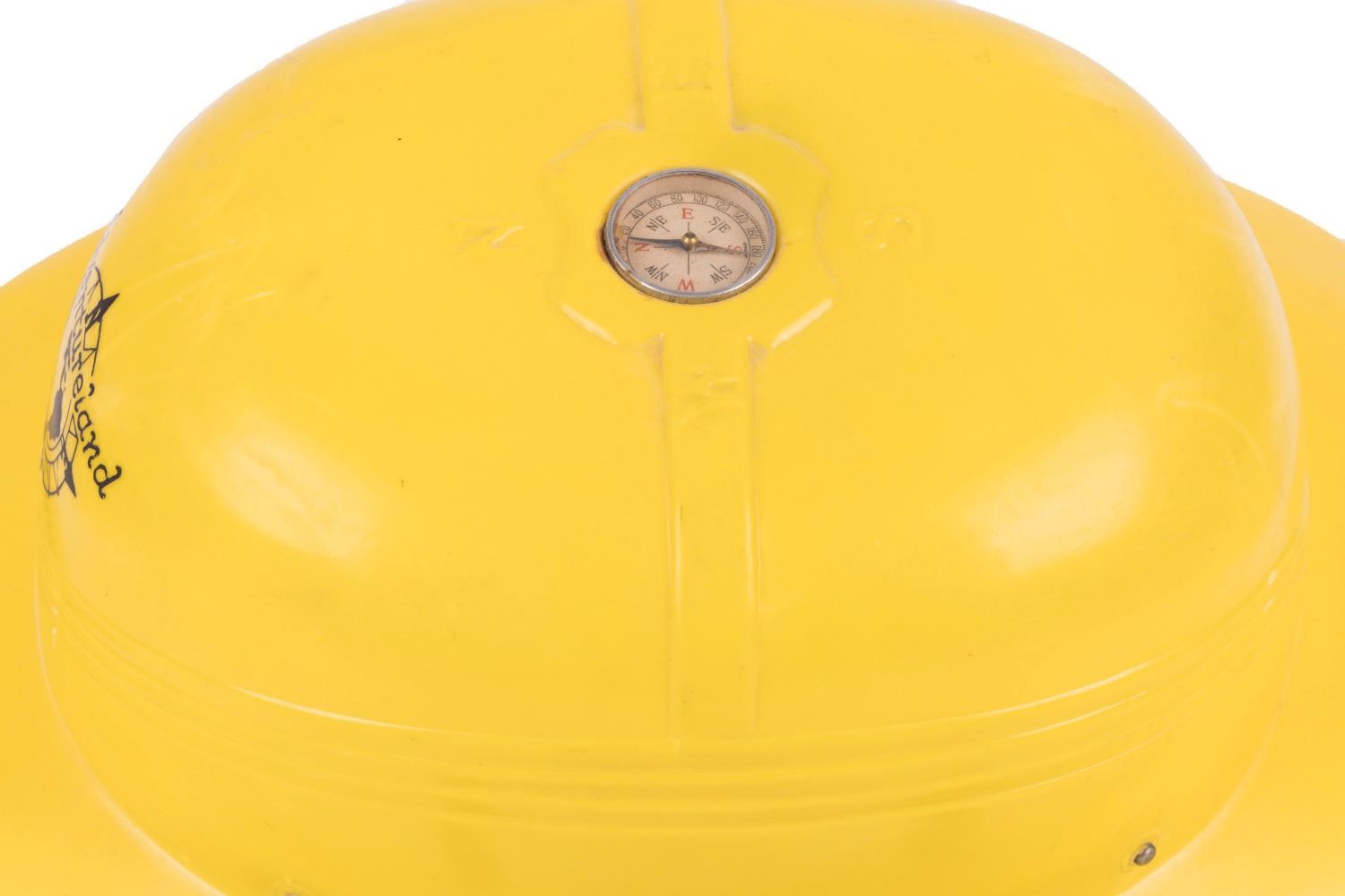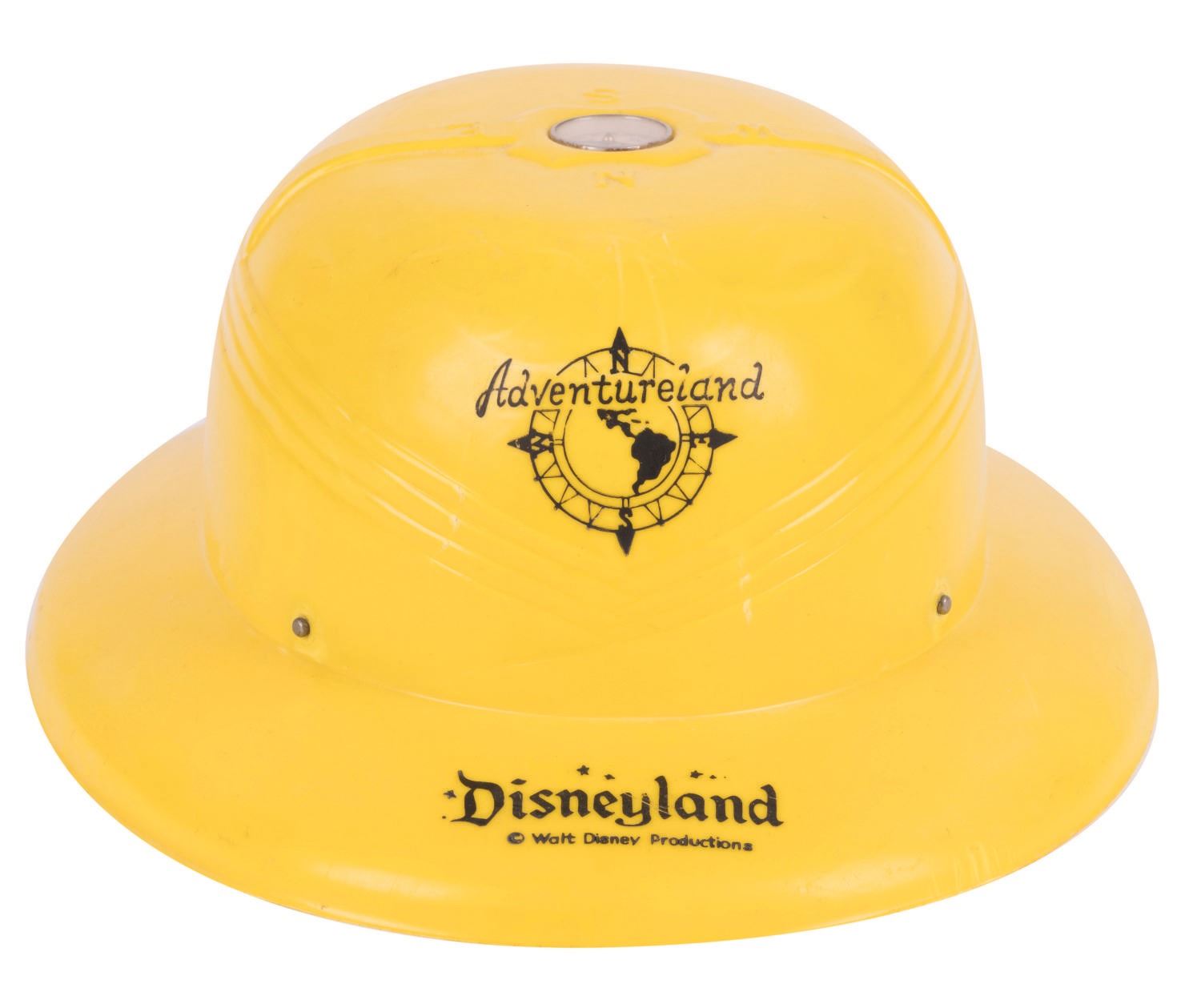 (Disneyland, 1950s-60s) A yellow plastic pith-style safari hat souvenir of Adventureland at Disneyland. The vintage 1950s-60s hat features a compass in the crown and straps inside. Measuring 9.25"x12" and 5" tall, the hat is in good condition overall with few stress marks and mild creases, light scuffs, and wear to the decals from age and handling.