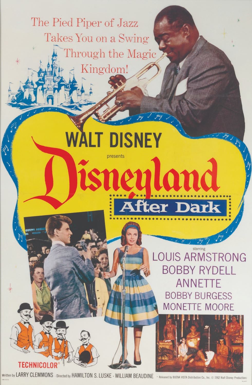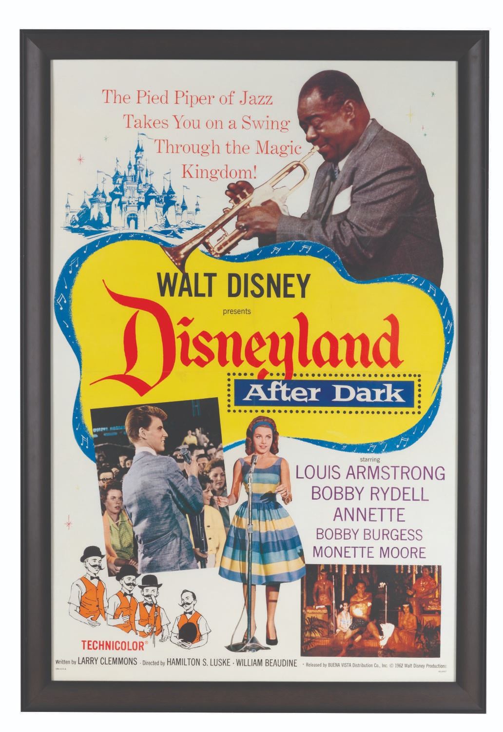 (Disney, 1962) A one-sheet for "Disneyland After Dark." Originally an episode of "Walt Disney's Wonderful World of Color," the musical variety film was shot at the Park and stars Walt Disney with a cavalcade of musical stars including Louis Armstrong, Annette Funicello, the Osmond Brothers, and more. The 27" x 40" poster presented in a 30.25" x 45" frame displays in very good condition very light creasing and small tears along the original folds which have been mitigated by the linen backing, and light scuffs to the frame.