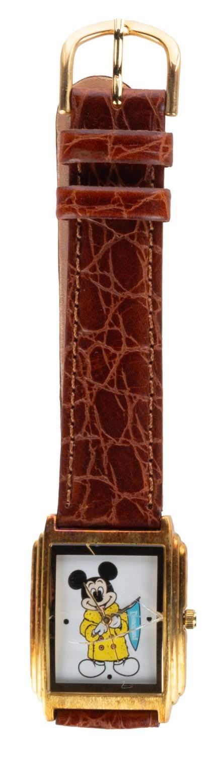 (Disneyland, 1980s-2000s) A collection of Disneyland Alumni Club souvenirs. Included are a pair of wristwatches, a license plate frame, a wood pen in a box, and a lanyard with cloisonne charm, each piece featuring the Club's mascot, Mickey Mouse. The license plate frame measures 12.25" x 6.25", the pen 5.75", the watches 9" long, and the lanyard 23.5" with a 2.25" x 1.5" charm. Each piece is in good to fine condition, with fading to the cloisonne, minor tarnish to one watch, a few small chips to the pen box, and wear to some pieces.