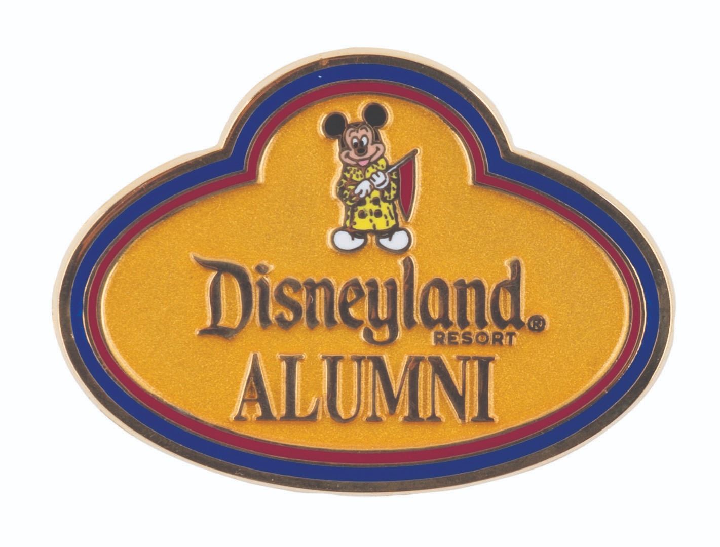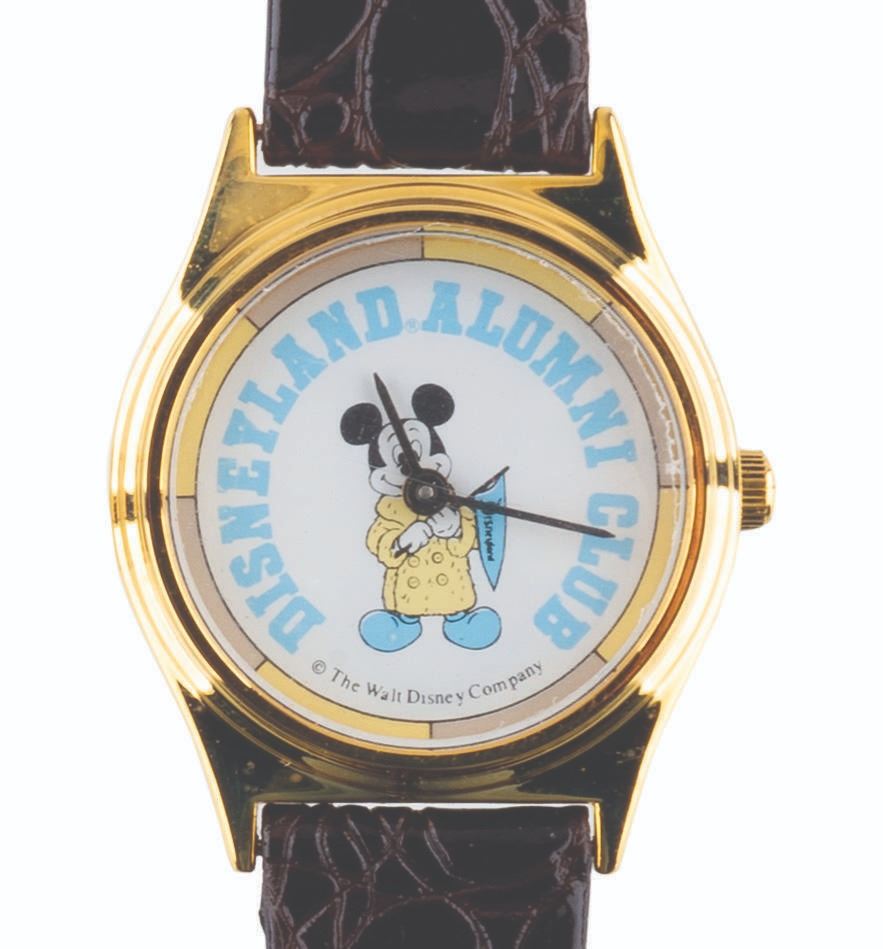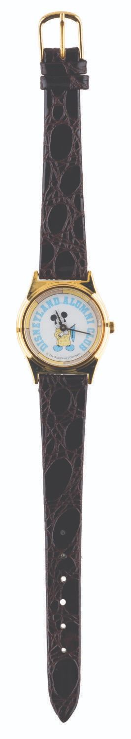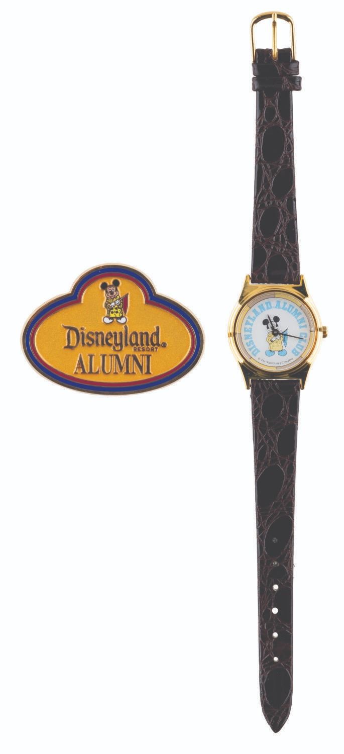 (Disneyland, 1980s/2005) A Disneyland Alumni Club watch and a 50th anniversary name badge pin, both exclusively available to the club's members. The watch did not function properly when tested, likely requiring repair to work correctly. The watch measures 8" long and 1" in diameter, and the pin 1.5" x 2", in very good to fine condition with light wear.