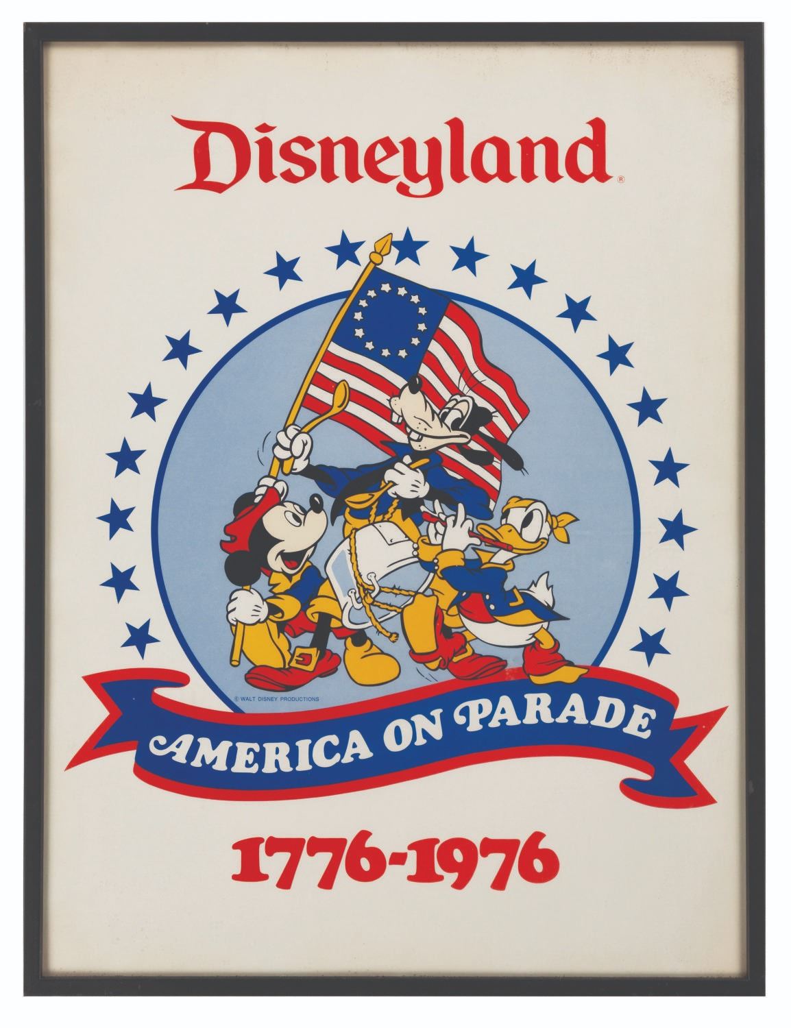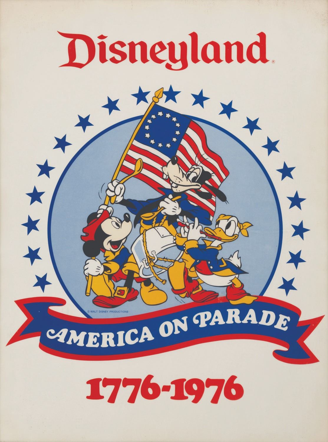 (Disneyland, 1976) A souvenir America On Parade poster featuring Mickey Mouse, Donald Duck, and Goofy in an interpretation of Archibald Willard’s painting “Spirit of ’76.” Measuring 18" x 24", the poster is in good condition with light stains and discoloration from age.