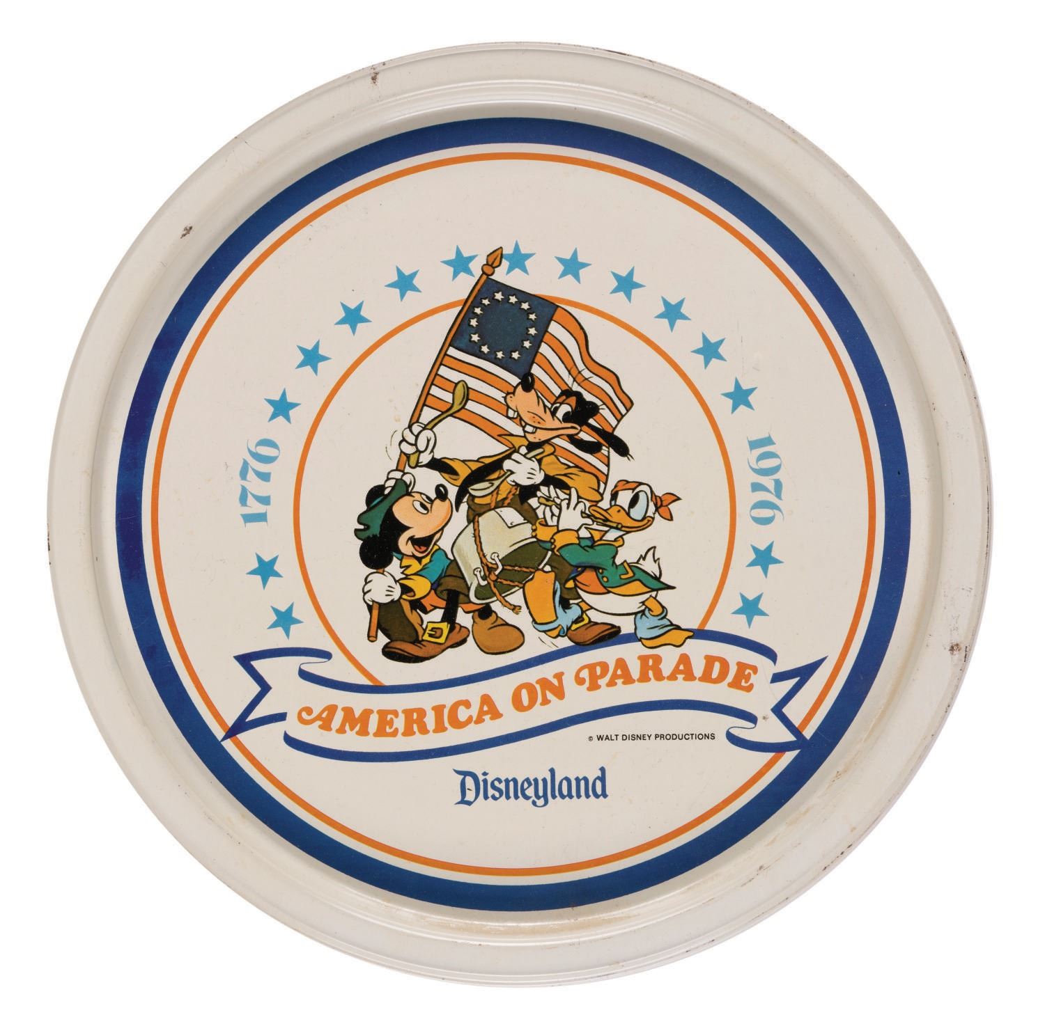 (Disneyland, 1975-76) An aluminum souvenir tray commemorating America on Parade at Disneyland. The circular metallic tray features lithographic imagery of Mickey, Goofy, and Donald channeling the "Spirt of ‘76'." Measuring 10.75" in diameter, the tray is in very good condition with the slightest scuffs, minor fading and surface wear, and few spots of oxidation from handling and age.